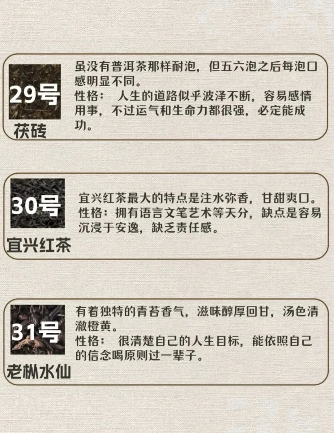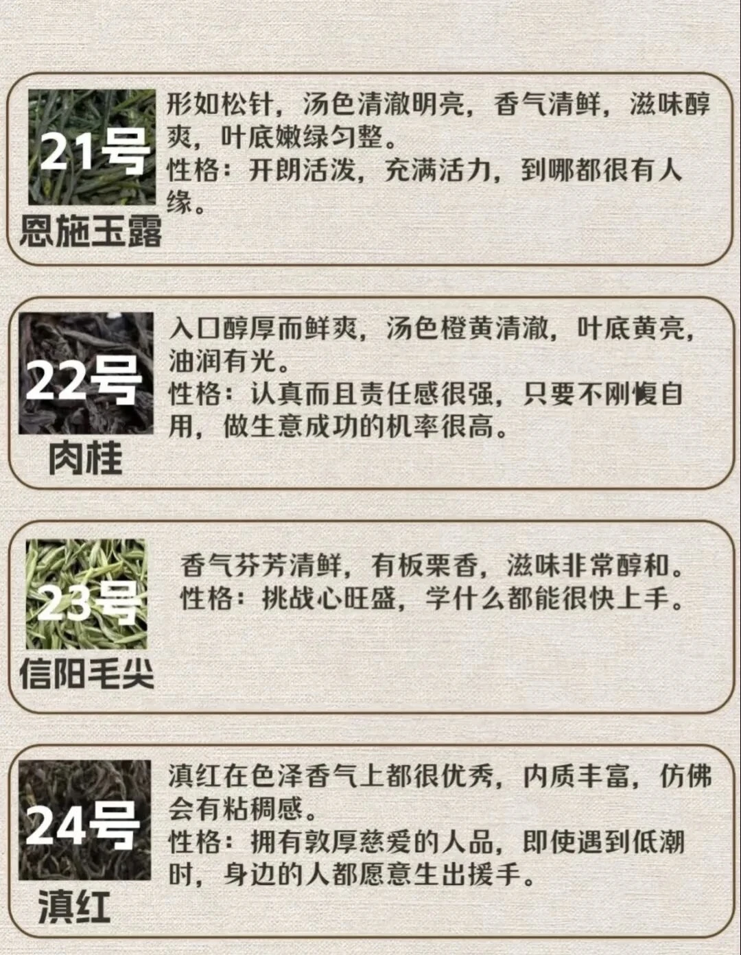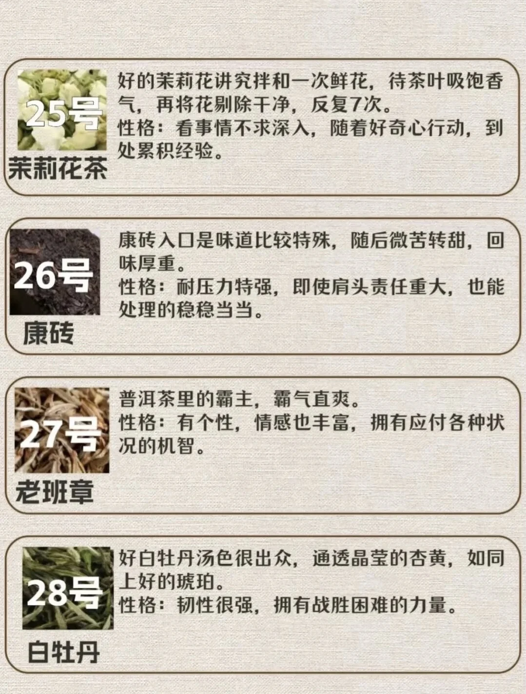 每个人的生日,都藏着一份独特的气质,恰如一款专属好茶,各自绽放别样风华。 1号金骏眉,红茶翘楚,香高味醇自带贵气; 2号凤凰单丛,香型万千,一口解锁自然野趣; 3号铁观音,兰香馥郁,甘醇回甘藏着清雅; 4号东方美人,蜜香浓郁,温润甜柔如沐春风; 5号九曲红梅,红汤明艳,果香清甜沁人心脾; 6号白毫银针,毫香满溢,纯粹洁净似初雪; 7号六堡茶,陈香醇厚,岁月沉淀出温润底蕴; 8号老曼峨,霸气浓烈,苦尽甘来尽显张力; 9号碧螺春,嫩香鲜爽,春芽裹毫满是清新; 10号大红袍,岩韵悠长,醇厚沉稳自带风骨。 11号西湖龙井,豆香清甜,鲜爽甘醇藏着春韵; 12号正山小种,松烟香独特,温润醇厚暖人心; 13号君山银针,芽头肥壮,黄汤明净透着雅致; 14号漳平水仙,兰香木质调,甘润醇厚有层次; 15号铁罗汉,岩骨花香,浓烈醇厚尽显霸气; 16号安吉白茶,香高味鲜,清甜醇和如沐清风; 17号白鸡冠,香幽味爽,独特韵味自成一派; 18号祁门红茶,香似花似蜜,醇和柔美自带温柔 19号易武古树,绵柔甜润,岁月陈香满溢唇齿; 20号水金龟,香清甘活,岩韵清雅回味悠长。 21号恩施玉露,栗香鲜爽,翠绿明亮尽显鲜灵; 22号肉桂,桂皮香馥郁,辛辣回甘尽显个性; 23号信阳毛尖,香高味浓,鲜爽回甘满是春味; 24号滇红,香高甜润,醇厚饱满自带阳光气息; 25号茉莉花茶,花香茶韵交融,清甜芬芳沁人心脾; 26号康砖,陈香纯正,醇厚浓郁藏着时光味道; 27号老班章,霸气凛冽,浓强饱满尽显王者风范 28号白牡丹,香清味醇,鲜爽甘润如遇佳人; 29号茯砖,菌香纯正,醇厚顺滑自带温润感; 30号宜兴红茶,香高味醇,甜润甘爽满是温婉; 31号老枞水仙,枞香浓郁,甘醇顺滑透着岁月感 你的生日对应哪款茶?评论区告诉我!
