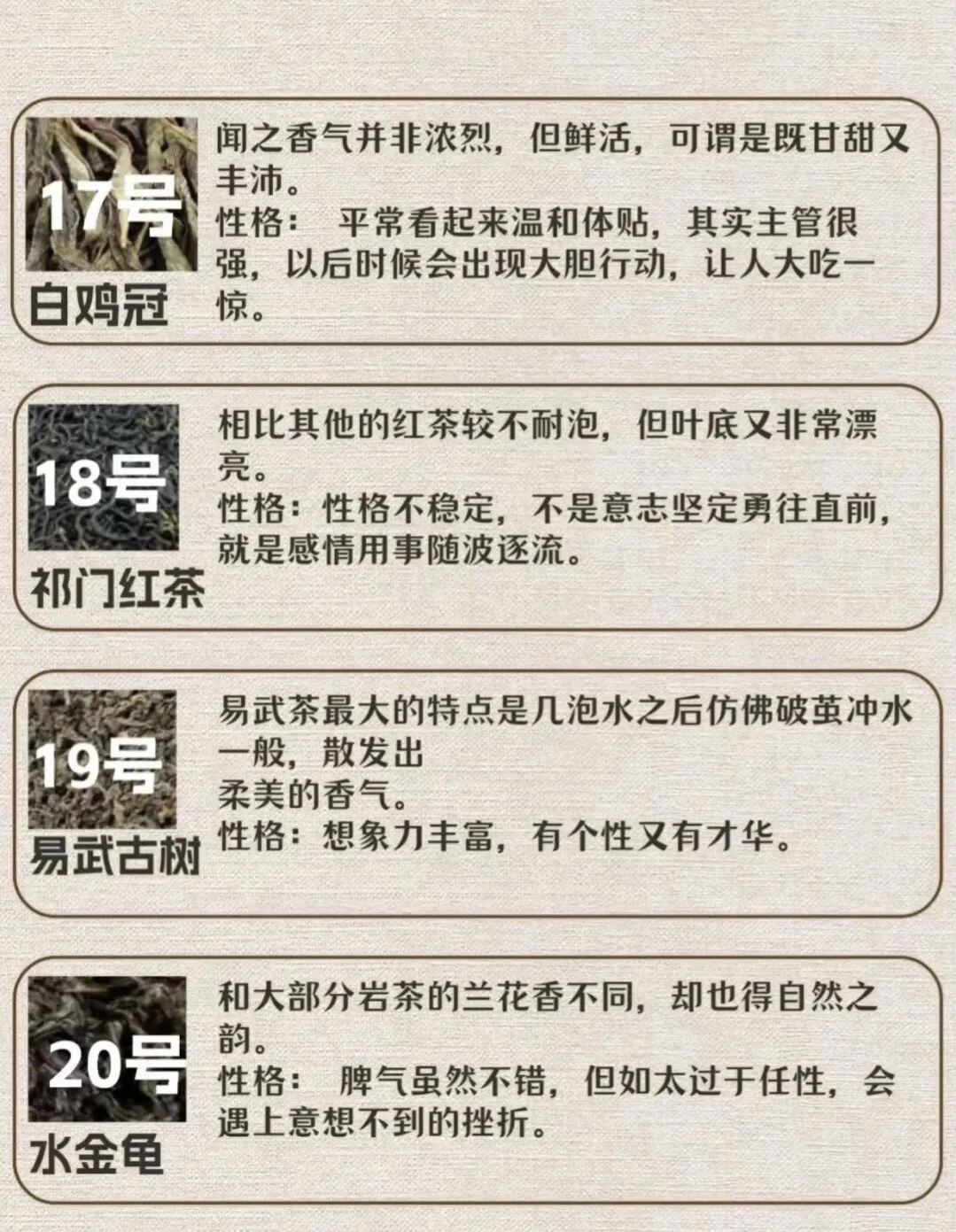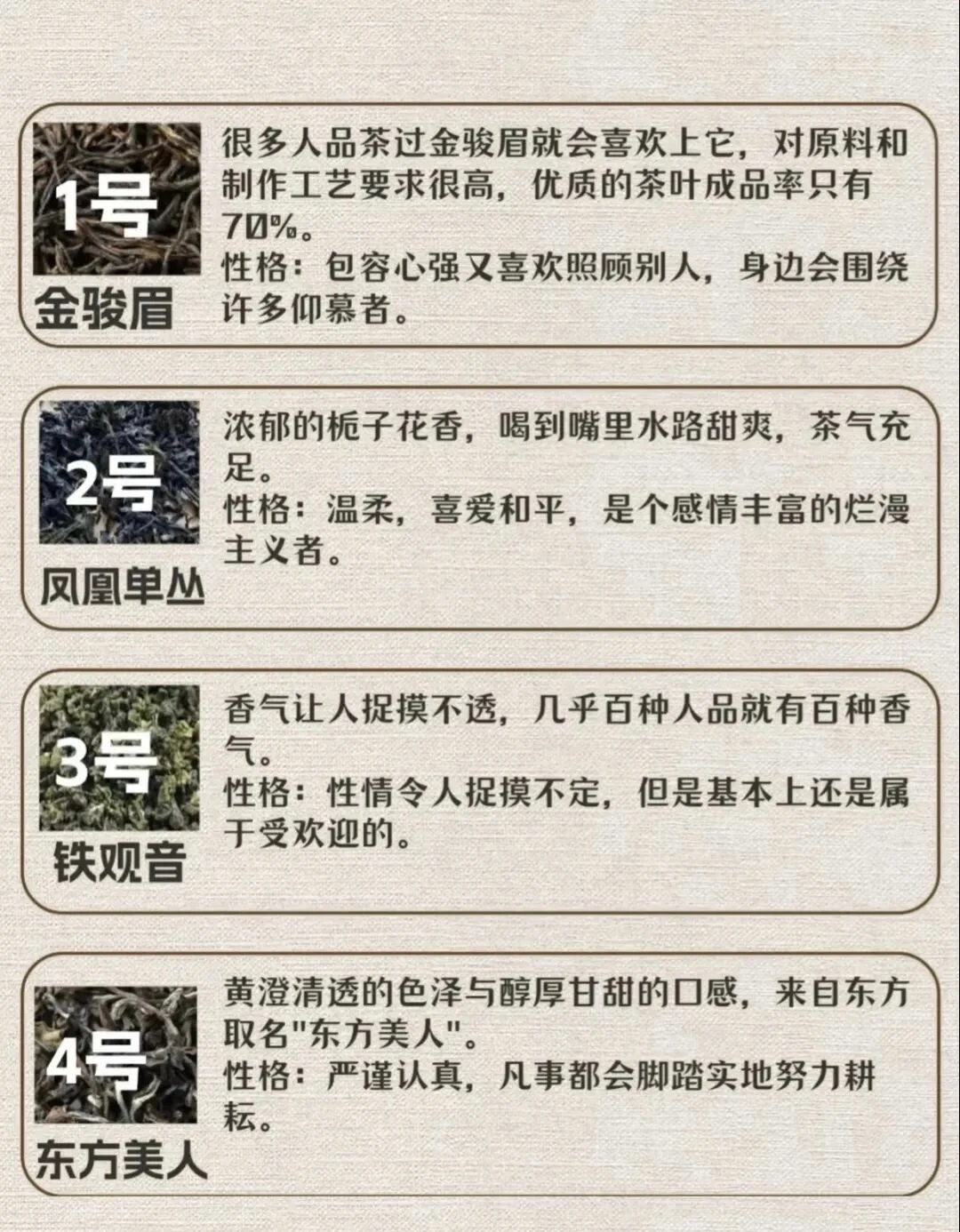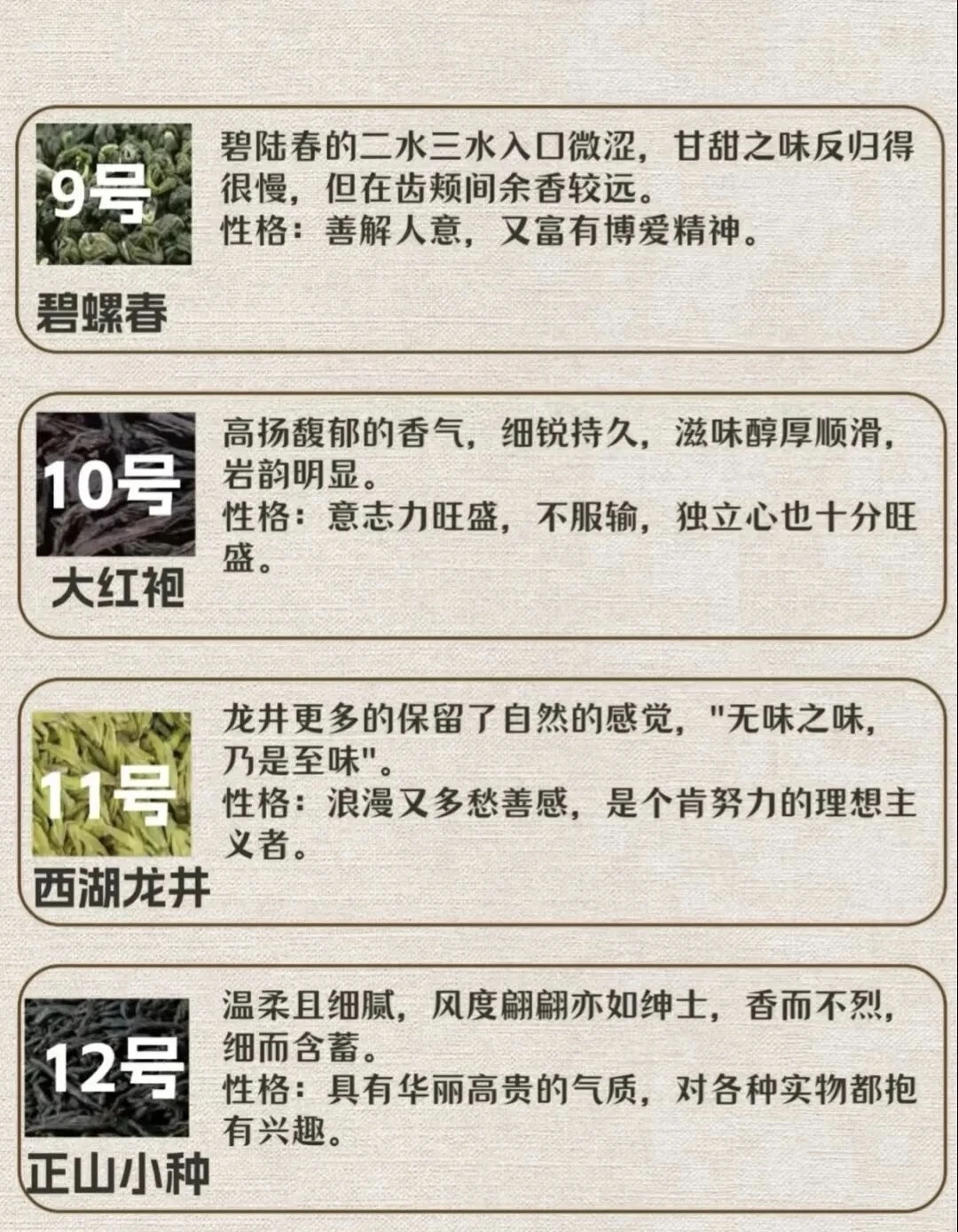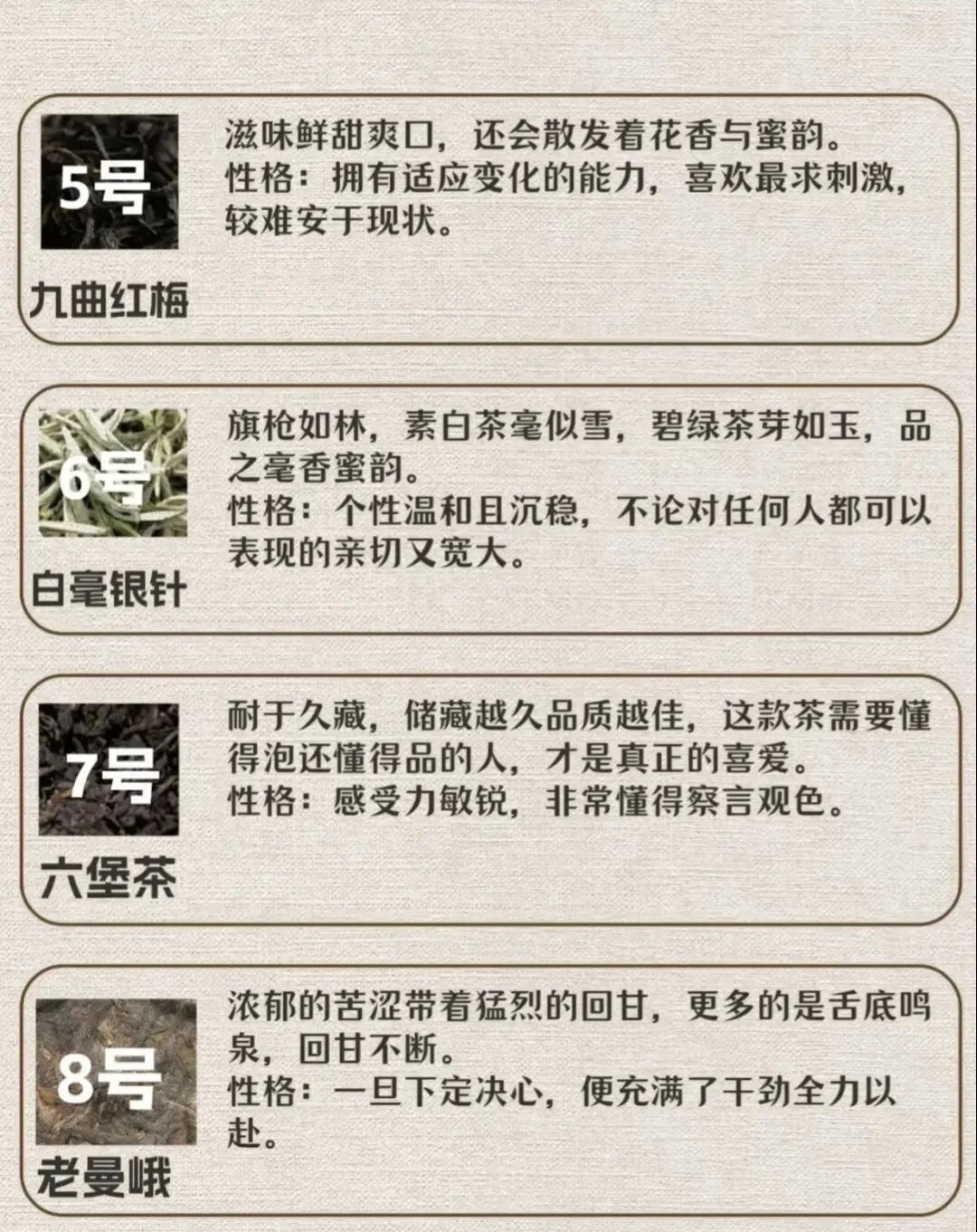 每个人的生日,都藏着一份独特的气质,恰如一款专属好茶,各自绽放别样风华。 1号金骏眉,红茶翘楚,香高味醇自带贵气; 2号凤凰单丛,香型万千,一口解锁自然野趣; 3号铁观音,兰香馥郁,甘醇回甘藏着清雅; 4号东方美人,蜜香浓郁,温润甜柔如沐春风; 5号九曲红梅,红汤明艳,果香清甜沁人心脾; 6号白毫银针,毫香满溢,纯粹洁净似初雪; 7号六堡茶,陈香醇厚,岁月沉淀出温润底蕴; 8号老曼峨,霸气浓烈,苦尽甘来尽显张力; 9号碧螺春,嫩香鲜爽,春芽裹毫满是清新; 10号大红袍,岩韵悠长,醇厚沉稳自带风骨。 11号西湖龙井,豆香清甜,鲜爽甘醇藏着春韵; 12号正山小种,松烟香独特,温润醇厚暖人心; 13号君山银针,芽头肥壮,黄汤明净透着雅致; 14号漳平水仙,兰香木质调,甘润醇厚有层次; 15号铁罗汉,岩骨花香,浓烈醇厚尽显霸气; 16号安吉白茶,香高味鲜,清甜醇和如沐清风; 17号白鸡冠,香幽味爽,独特韵味自成一派; 18号祁门红茶,香似花似蜜,醇和柔美自带温柔 19号易武古树,绵柔甜润,岁月陈香满溢唇齿; 20号水金龟,香清甘活,岩韵清雅回味悠长。 21号恩施玉露,栗香鲜爽,翠绿明亮尽显鲜灵; 22号肉桂,桂皮香馥郁,辛辣回甘尽显个性; 23号信阳毛尖,香高味浓,鲜爽回甘满是春味; 24号滇红,香高甜润,醇厚饱满自带阳光气息; 25号茉莉花茶,花香茶韵交融,清甜芬芳沁人心脾; 26号康砖,陈香纯正,醇厚浓郁藏着时光味道; 27号老班章,霸气凛冽,浓强饱满尽显王者风范 28号白牡丹,香清味醇,鲜爽甘润如遇佳人; 29号茯砖,菌香纯正,醇厚顺滑自带温润感; 30号宜兴红茶,香高味醇,甜润甘爽满是温婉; 31号老枞水仙,枞香浓郁,甘醇顺滑透着岁月感 你的生日对应哪款茶?评论区告诉我!