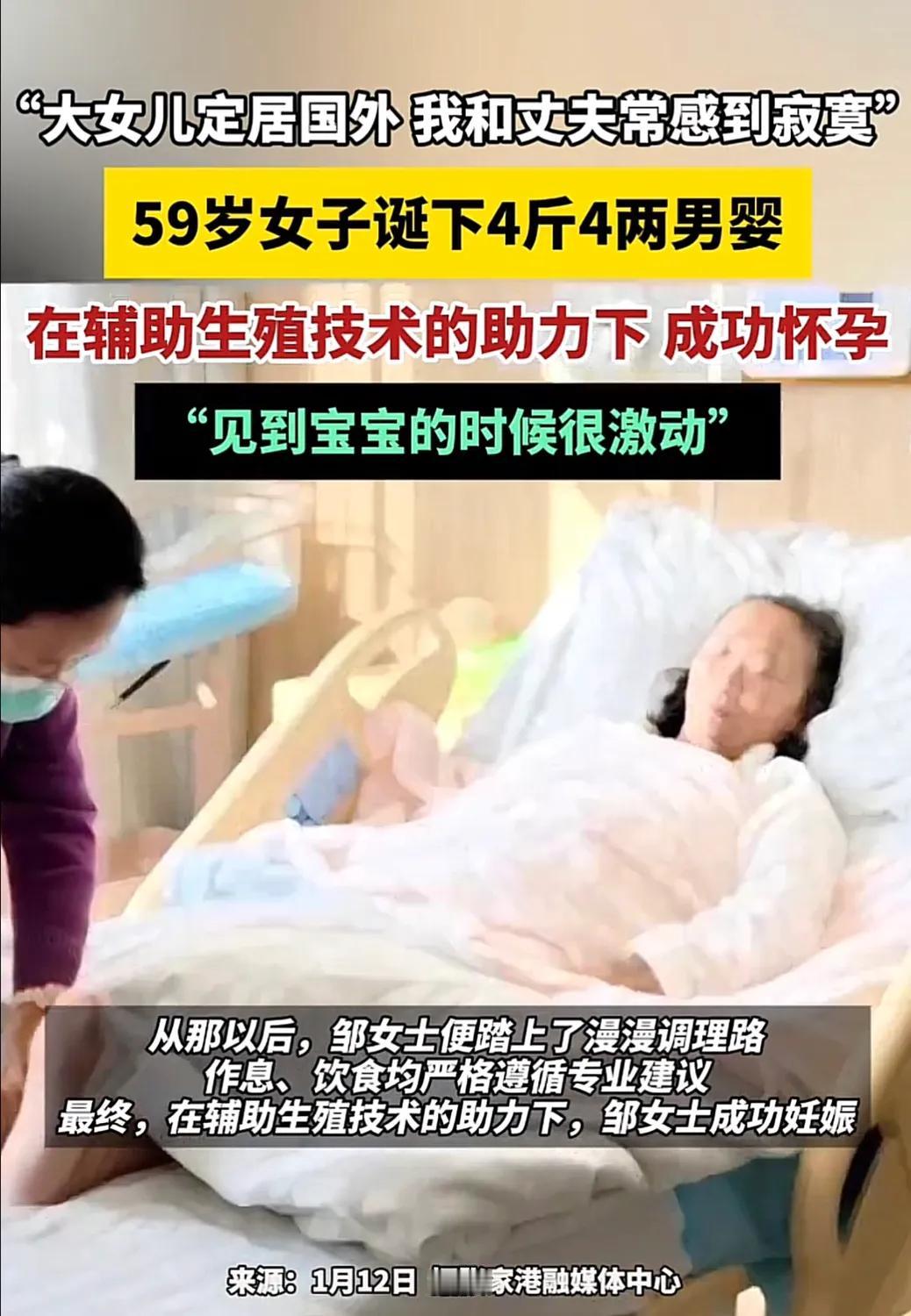 刷新记录了!59岁女子诞下4斤4两男婴,刷新张家港高龄孕妇生产纪录,女子:大女儿定居国外,我和丈夫常感到寂寞。 张家港的邹女士今年59岁,躺在病床上看着身边小小的男婴,眼里满是激动。这个孩子来得不容易,光是调理身体就花了好几年,作息要掐着点,饮食更是严格照着医生的建议来,一点不敢马虎。靠着辅助生殖技术,她终于熬过了孕期的种种风险,生下了这个4斤4两的男宝,也成了张家港目前已知的最高龄产妇。 邹女士和丈夫早就有个大女儿,只是女儿毕业后就去了国外定居,一年到头也回不来几次。老两口守着空荡荡的房子,日子久了,心里的寂寞就像潮水似的涌上来。坐在客厅里,连个说话的人都没有,饭桌上的菜做多了,也只能留着下顿热了再吃。邹女士说,不是女儿不孝顺,是距离太远了,想凑个热闹都难,也就是从那时候起,她和丈夫动了再生一个孩子的念头。 身边的亲戚朋友知道这想法后,几乎都劝她算了。50多岁的年纪,别说怀孕,就是日常生病都比年轻人恢复得慢,更何况生孩子这种大事,风险高得吓人。可邹女士铁了心,她觉得家里添个孩子,能把冷清的日子搅和得热闹些,也能让老两口有个精神寄托。 只是这份“寄托”的背后,藏着太多值得深思的问题。高龄生育本身就伴随着对母体的巨大考验,邹女士孕期要面对高血压、糖尿病等一系列并发症风险,生产时更是闯了一回鬼门关。就算孩子顺利出生,后续的养育也成了难题,等孩子长大成人,邹女士已是年逾古稀的老人,能不能陪孩子走过成长的关键阶段,都是未知数。 更让人感慨的是,邹女士的选择,折射出不少中老年家庭的孤独困境。独生子女远走他乡,空巢老人的精神需求被忽视,有些人就想着用再生孩子的方式填补寂寞,可这从来都不是解决问题的根本办法。 各位读者你们怎么看?欢迎在评论区讨论。