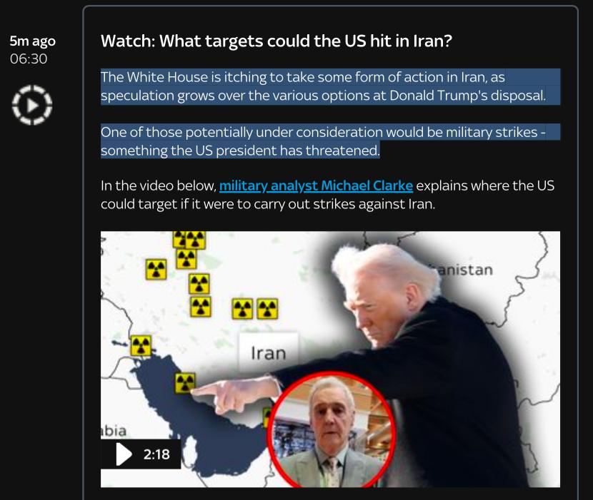 美国总统真的要兑现承诺了?刚刚打开电脑,就看到了英国天空新闻实时滚动播出的大标题是特朗普称:“帮助已经在路上了”!他还敦促那里的人们做更勇敢的事情。现在是北京时间1月14日6时35分,5分钟前,该媒体发出的消息是:“随着关于唐纳德·特朗普可采取的各种选项的猜测增多,白宫迫切希望在**采取某种形式的行动。其中一个可能正在考虑的选项是军事打击——这是美国总统曾经威胁过的。”