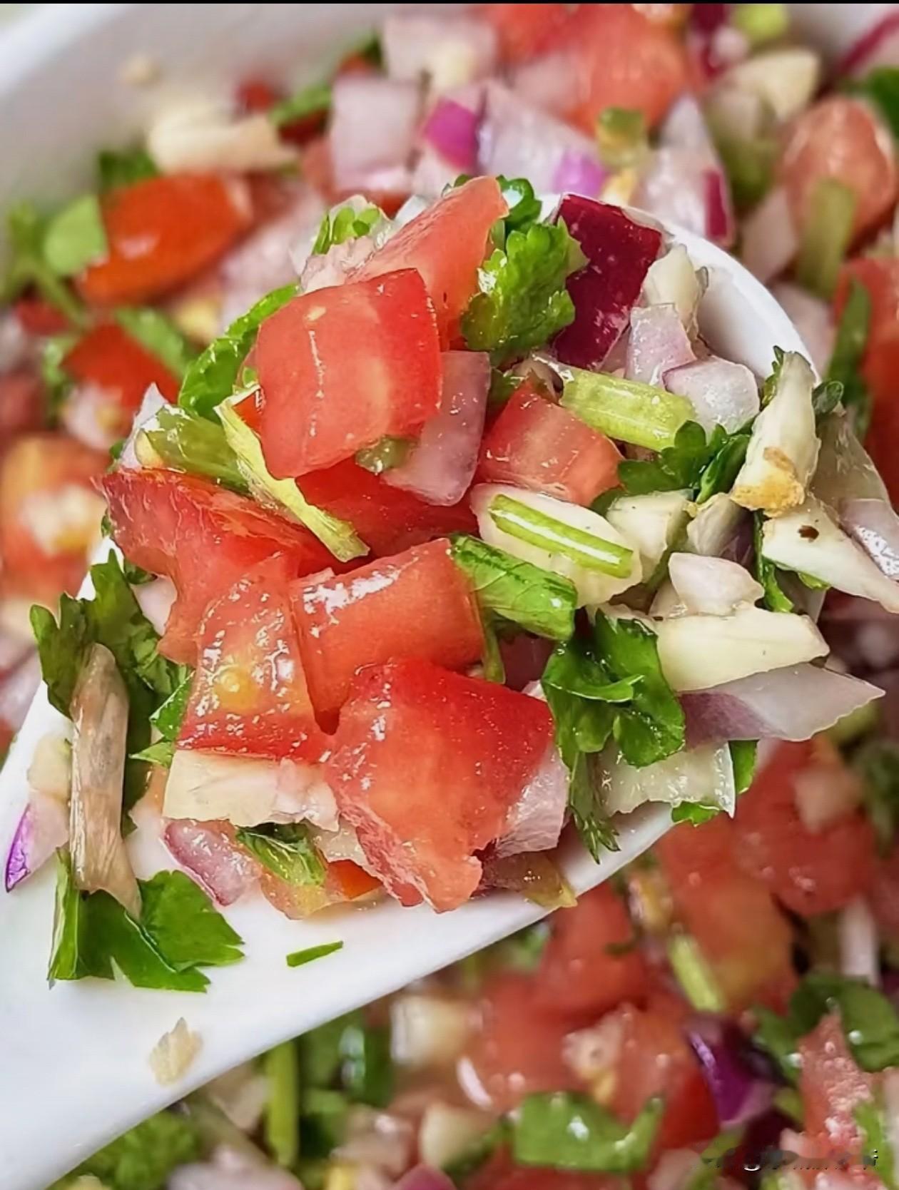 主料:番茄,洋葱,香菜,蒜末,组合在一起可以说是全球万能的美食搭子,老少皆宜。 在墨西哥可以叫当做sasa酱,配玉米片的最佳搭。如果在多加一些牛油果和辣椒一起打碎,就变成了墨西哥的鳄梨酱。 在土耳其这也是一种家常蔬菜沙拉。如果没有油醋汁,那就变成了中亚几个国家的一道很类似的餐前冷盘。如果加一个煮熟的土豆切丁试试,就是巴基斯坦很出名的一道菜。 在韩国,还可以加橄榄油,煮熟的鹰嘴豆和鸡肉就是完美的健康餐。 把番茄换成尖椒,就变成一道凉拌老虎菜。也许新疆的朋友会觉得熟悉,这就是很像新疆名菜皮辣红。而山西版的做法是把青辣椒和葱花加进去,适量醋和盐,夏天配面条吃。 还有一种做法,把鸡蛋煮熟了,捏碎了放进去就成了一道鸡蛋蔬菜沙拉。