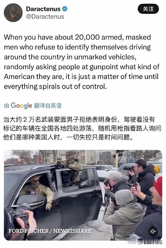 美国人这次为何对ice杀人反应这么大? 看了一下美国网友的评价,我有点理解了,现在前边是自然是民主党支持者,后面是一个maga百万大v。 这玩意蒙面不出示证件就能直接抓人,想抓谁就能抓随,就能把人从车里直接抓出来,的确挺吓人,而且现在maga压根不在乎对方是不是非法移民,直接不讳,抓的打的,就是你民主党支持者。