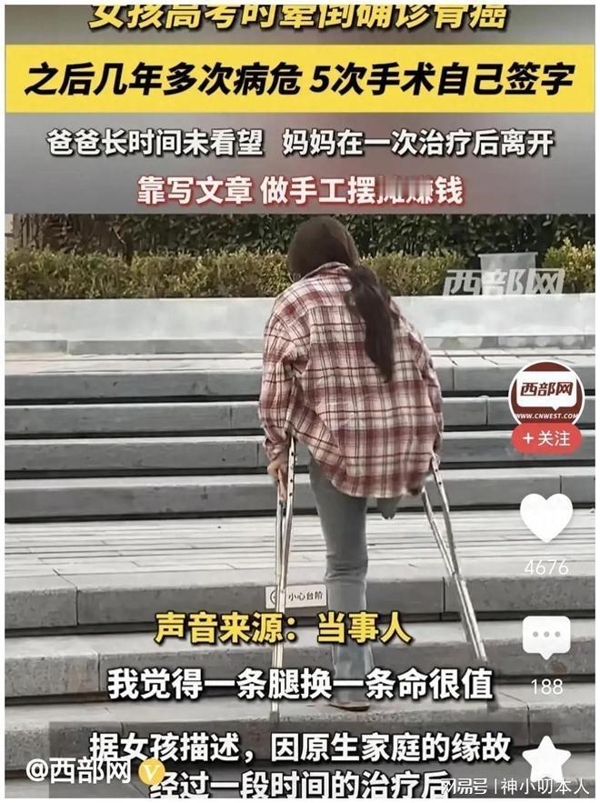女孩确诊骨癌自己签字6次手术截肢:23岁的她,活成了自己的摆渡人 “医生,手术同意书我自己签。”当23岁的夏夏在截肢手术同意书上写下名字时笔尖的重量,压过了一个女孩对未来的所有憧憬。高考前晕倒确诊骨肉瘤,19岁被迫截肢,5年间6次手术、无数次化疗,肺叶切除、肿瘤转移,本该被父母呵护的年纪,她却独自拖着行李箱辗转医院,而父母早已失联,把她丢给了这场与死神的博弈。 很难想象,这个笑着说“一条腿换一条命很值”的姑娘,曾在化疗中吐到昏天黑地,掉光头发、皮肤变黑,却在病房里给自己打气“悲观没用,要热烈地活”术后为了凑医药费,她拖着假肢摆摊卖手工,别人问起家人,她只轻描淡写一句“习惯一个人了”,可谁懂这份平静背后,是多少次深夜独自承受病痛的煎熬。 更让人心疼的是,法律层面未成年人医疗同意权本应由监护人行使,可当家庭缺位,像夏夏这样的孩子只能被迫“长大”,用稚嫩的肩膀扛起生命的重量。但命运的残酷,从未磨灭她对生活的热爱:社交账号上,她把年龄填成“100岁”,坦言最大愿望是活到百岁;最新视频里,即便癌症已转移到胸膜,她仍笑着求网友说“公主请恢复健康”,这份乐观戳哭了无数人。 其实夏夏的故事不是个例。15岁的桂诗淇抗癌8年,双腿植入假体、切除部分肺叶,却用画笔记录病房里的阳光,自学拿下日语N1认证;郑州男孩李泰喆患恶性肿瘤7年,跪着复习功课,最终考上一本。他们用行动告诉我们:苦难或许会剥夺健康、撕裂亲情,但永远拿不走一颗向阳而生的心。 我们心疼夏夏的遭遇,愤怒于亲情的缺席,更敬佩她在绝境中的坚韧。生活总有不期而遇的暴风雨,但真正的勇气,不是从未害怕,而是明明恐惧,却依然选择前行。夏夏用自己的经历证明,即便无人依靠,也能活成自己的光。 愿这个拼尽全力活下去的姑娘,能被命运温柔以待;愿每个独自对抗苦难的人都能遇到照亮前路的温暖。你被夏夏的故事打动了吗?如果是你,会有她这样的勇气吗?欢迎在评论区留下你的祝福
