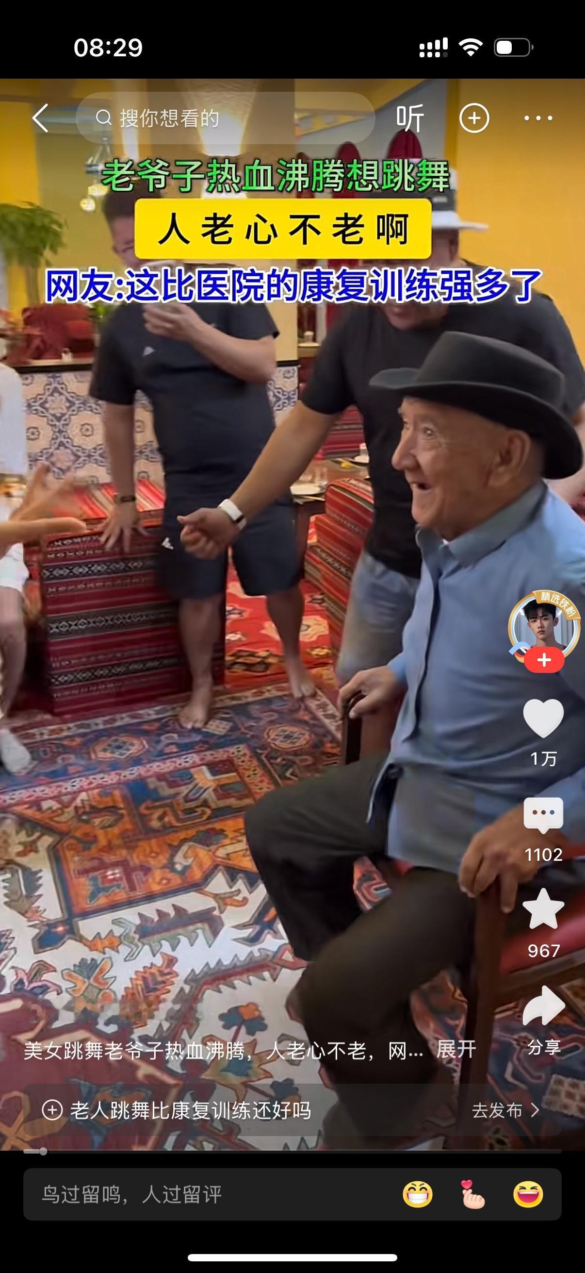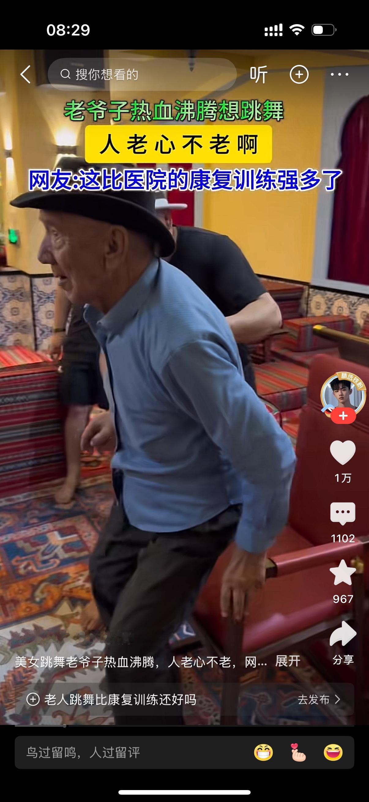 脑梗瘫痪的老人看到美女在跳舞,热血沸腾。美女跳着欢快的舞蹈向他招手,示意他站起来。老人家心情澎湃,试着站起来,他缓缓挪动自己的身子,离开座位。在美女的鼓励下,老人家竟然奇迹般地站起来了,还缓慢的移动了脚步。他一步一步向美女靠近,美女慢慢地往后退。老人家步步紧逼,越走越快,一瞬间完全康复了。真是神奇啊,在医院康复大半年没有好转,美女的一个舞蹈就让大爷跑起来了。医院有必要增加美女跳舞辅助康复这个项目了。