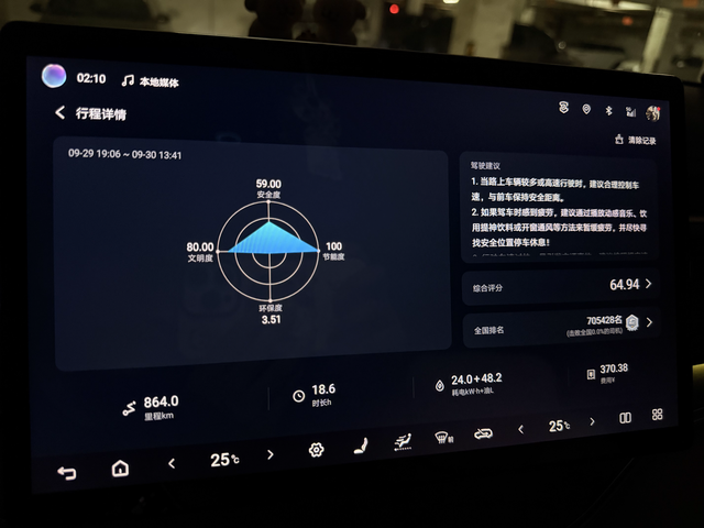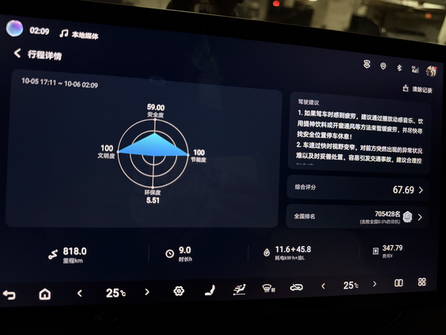 dmi5.0能耗分享 往返两程,24度电是在服务区充了电睡了一晚上。折合油耗5.6,油价七块的话每公里0.35元去的时候强制保电百分之四十,回来的时候ai能耗,俩模式油耗表现差不多。最新版本真的省,车道领航也稳了