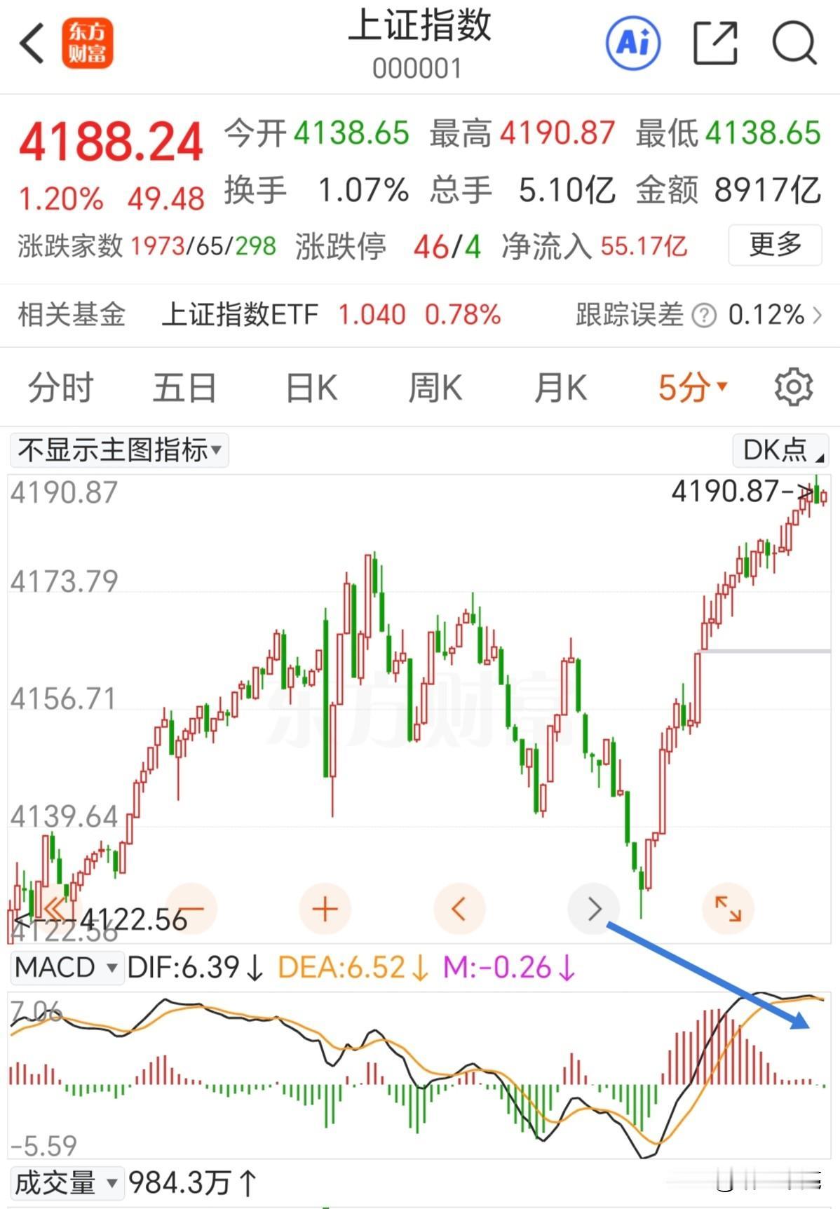 牛市多长阴,这不是骗人的话,而是无数次经验总结的。昨天还放量大跌,个股普跌,今天就普涨创新高了,市场也太强了。 从5分钟走势上看,指数在创新高,macd能量柱开始出现绿色的,量价背离算不上多严重,修复这种背离要么大涨,要么快速跳水,个人认为跳水的概率更大。昨天没买的,可以在回踩的时候做二买。 股市价值重估 股市低点 股票瞬间卖空 A股午市 股票二次入场 二轮牛市