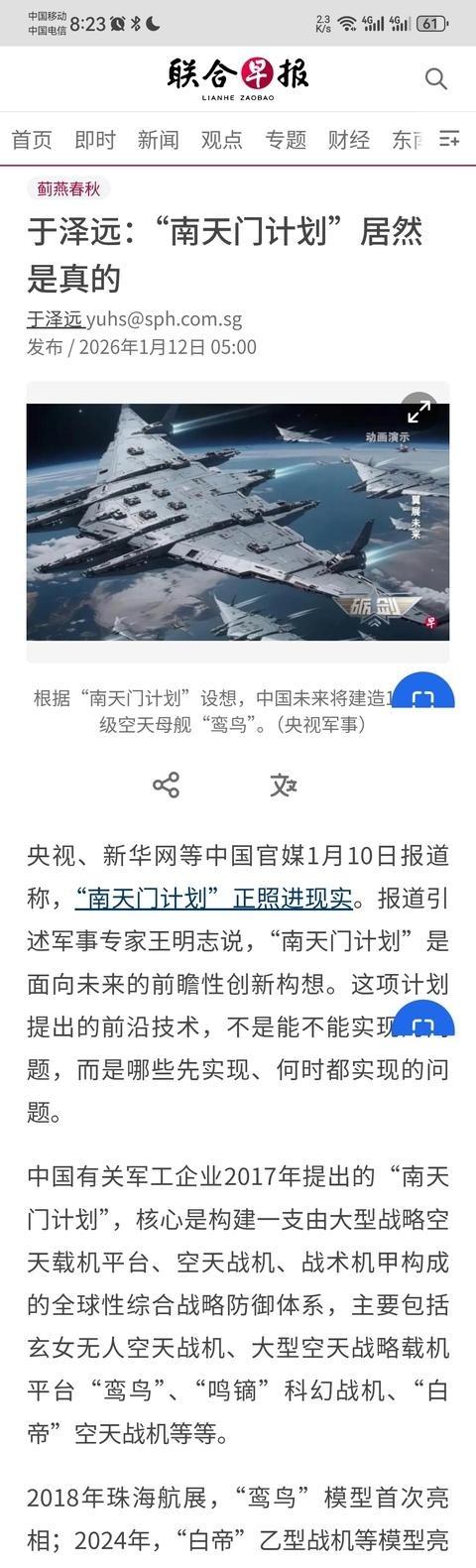 “南天门计划”震动了外媒!联合早报1月12日发文,直接发出了不敢置信地惊呼:“‘南天门计划’竟然是真的!” 南天门计划最早是中航环球文化传播有限公司在2017年推出的一个航空主题科幻IP,核心思路就是构建一套全球性综合战略防御体系。主要组成部分包括大型战略空天载机平台、空天战机和战术机甲这些元素。简单说,它描绘了未来空天一体化的作战蓝图,比如10万吨级的空天母舰鸾鸟,全长242米,翼展684米,最大起飞重量12万吨,能搭载88架玄女无人空天战机。玄女是无人驾驶的,设计时速能到4.8马赫,属于高超音速级别。白帝战机则强调全频段隐身,鸣镝和紫火平台也各有侧重,紫火是通用垂直起降的,融合AI变形技术,尾部无扇叶设计,提升速度和可控性。这些装备听起来挺科幻,但背后的技术支撑其实是中国军工积累的体现。 比如白帝战机的全频段隐身,对应的是超材料技术应用。武汉纺织大学搞出的红外-雷达一体化隐身材料,在6-18GHz频段吸波率超0.8,能把雷达反射截面积降到传统材料的1%以下,已经在尖端装备上试点。鸾鸟母舰的动力核心,靠的是核聚变实验装置EAST,实现1.2亿摄氏度等离子体运行403秒,这为反应堆供能提供了关键支撑。神龙号可重复使用航天器完成276天在轨测试,验证了跨大气层变轨技术,让空天母舰构想有了根基。玄女无人机的智能集群作战模式,中国无人机产业早就重点发展,2025年军用无人机出口额破800亿元,占全球35%份额。翼龙系列和彩虹-7搭载AI自主决策系统,实战命中率高,国际认可度也不错。这些技术不是孤立的,而是体系化突破。 中国航空航天产业链已经很完整,株洲航空动力谷实现了AES100千千瓦级涡轴发动机的量产,提供电力、燃油、环控全套系统。AES100突破了整机结冰等核心技术,完成3000小时首翻期寿命试验,2026年正式交付。空天信息技术布局也强,卫星导航一张网整合近7000座基准站,全国覆盖,日均服务请求超3000万次。北斗系统结合低轨卫星星座和毫米波雷达,构建空天信息网络,高精度定位、导航、授时服务保障一体化作战。九天和彩虹大型无人机连续试飞,爆震发动机、超材料关键技术不断突破,这些分散成果跟南天门计划呼应,让外媒不得不重新审视。 南天门计划仍是长期构想,六大核心技术方向要经历攻关、工程验证、产业化应用,过程中有成本控制、技术融合挑战。但现有成果证明不是空中楼阁,而是合理推演。价值不只描绘蓝图,还整合前沿技术,为科研产业发展指方向,拉近大众与航空科技距离。外媒惊呼印证了中国科技自立自强转化成国际话语权提升。