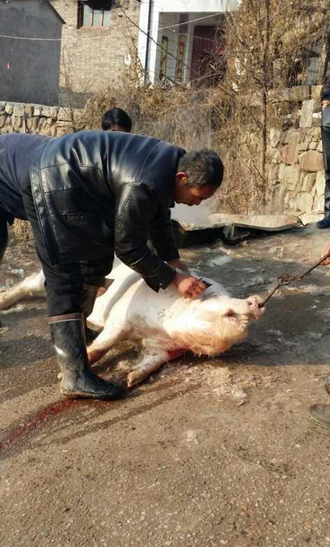 重庆合川杀猪太费人工,以前韩城人杀猪要简单的多,一人一钩一刀,足矣!用钩钩在猪下巴处,然后一刀放血结束,但是如果需要猪血,则需要几个人将猪按在桌上,下边放一个盆子,再下刀放血。小时候喜欢凑热闹看杀猪,能得到猪尿泡的孩子会很豪,吹成气球在巷子里转上一圈,你合有乡村顶流明星的赶脚。合川杀猪,竟没见猪尿泡气球,美中不足啊。