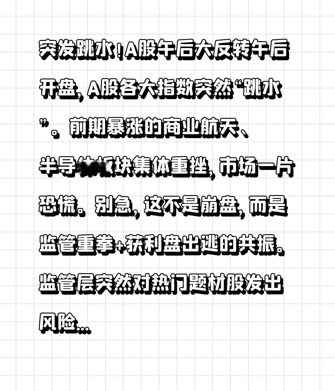突发跳水!A股午后上演大反转,发生了啥? 午后开盘,A股各大指数突然“跳水”。前期暴涨的商业航天、半导体板块集体重挫,市场一片恐慌。 别急,这不是崩盘,而是监管重拳+获利盘出逃的共振。监管层突然对热门题材股发出风险警示,叠加市场连续大涨后获利盘汹涌兑现,导致资金疯狂从高位股撤离。 这恰恰是芒格最爱的“高低切换”时刻!聪明钱正在抛弃泡沫,涌入低估值、高股息的“现金奶牛”。 记住芒格的铁律:“在别人贪婪时恐惧”。此时千万别接飞刀,抱紧你的高股息筹码,这才是震荡市中最硬的铠甲!