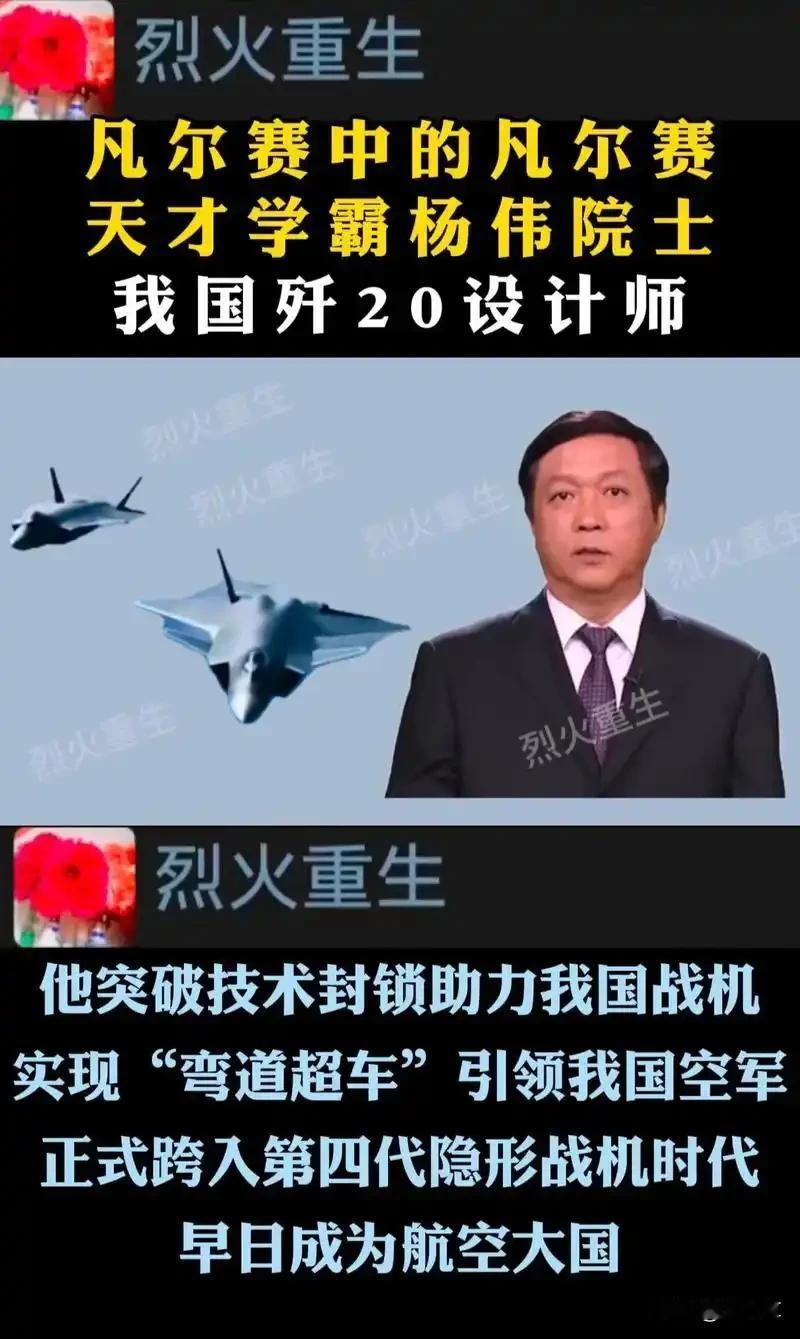 最近网上看到歼—20总设计师杨伟写给自己亲手设计的“孩子”——歼-20的一封信!大国重器,一代科学家辛勤耕耘,让中国从学生华丽转身为老师,跻身拥有隐身五代机的国家行列——感谢一代代科学家们的忘我付出和所做出的个人牺牲——感恩.总设计师杨伟让中国航空工业站在了世界之巅! 廿载熔心铸鹞鹏, 西南初烨破苍冥。 珠海一冲惊九域, 沧溟千巡卫汉庭。 铁翼载吾兴邦志, 长天任汝拓云程。 2035凌绝顶, 永作中华镇岳星。