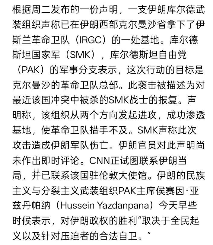 硬伤伊朗? 1月13日,在伊朗的抗议示威游行活动中,出现了新的动向。据网络上的消息说,一支库尔德武装力量占领了一处伊朗革命卫队基地。这种情况,大概还是第一次在伊朗发生。 这是发生在伊朗西部克尔曼沙省的事情,伊朗库尔德斯坦国家军和库尔德斯坦自由党的军事机构表示,他们的两支武装力量互相配合,分别从不同的方进秘密入了革命卫队的基地,打了革命卫队个措手不及,从而占领该基地。但目前伊朗官方对此并没有任何反应或消息。 库尔德人的武装,估计应该是伊朗革命卫队最坚定不移的反对者,不仅仅不会轻易放下武器,甚至是很可能会抵抗和战斗到最后。