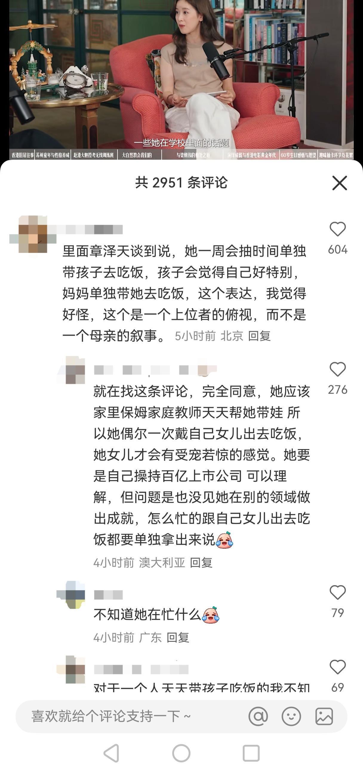 网友热议章泽天与刘嘉玲做访谈, 特别是看到这样一幕, 网友觉得有点“反胃”。 网友觉得章泽天采访没有抓住重点, 所谓的清华才女都没有刘嘉玲谈吐那么高雅, 各种阅历与领悟娓娓道来。 人家刘嘉玲都谈到张国荣了, 章泽天居然没有追问, 没有挖到网友想听的故事。 如果这个可以解释为她不想追问八卦, 那么接下来这番话就彻底惹怒网友了。 章泽天强调她会每两三周单独带孩子出去吃饭, 聊她们两个人的话题。 有些网友觉得章泽天连 跟孩子独出去吃饭都拿出讲, 而这些网友可能天天跟孩子吃饭。 网友觉得章泽天完全是一个上位者的俯视, 质疑她真的那么忙吗? 似乎她也没有忙什么大事业呀, 连和孩子吃饭的时间都没有, 是不是孩子都是保姆带着呀 让网友听着很不舒服, 甚至有点“恶心”。 章泽天有三个孩子, 一个女儿8岁了, 一对1岁的双胞胎儿子。 章泽天之所以强调 会抽时间跟大女儿 出去吃饭, 也许是想让女儿知道妈妈虽然 有了弟弟之后, 也不会忽略女儿的感受。 于是章泽天会特意抽时间安排 两人单独用餐, 暂时放下弟弟们, 让自己和女儿有独处时光, 让女儿知道妈妈依然爱她。 这个情况就像, 一个网红博主, 她的女儿生日, 她会送给女儿一个特别的礼物。 这个特别的礼物就是“妈妈的一天”。 因为平时家里有两个孩子, 妈妈通常出外都是带着两个孩子的。 到了女儿生日这一天时间里, 这位妈妈就完全属于女儿一个人的了, 妈妈可以带女儿一个人去吃饭, 带女儿一个人去游乐场,…… 这一天就是她们母女两个人的独处时光。 这样看来 章泽天强调抽时间和女儿单独出去用餐 是不是就好理解多了呢?