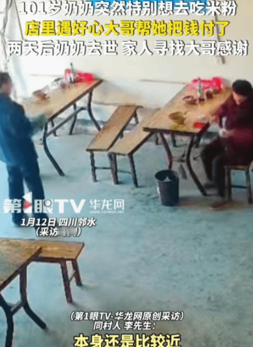 破防了!四川,101岁老人独自出门去米粉店吃米粉。突然,一位男子帮她把钱付了。没想到,老人回去的第二天晚上在睡梦中安详离世。事后,老人的家人想到找到这位好心的男子,当面感谢他。 四川,巷口那家开了二十多年的米粉店飘出阵阵香味,大铁锅咕嘟咕嘟煮着奶白色的骨头汤,牛肉和肥肠的卤香混着葱花的清芬,冲破晨雾飘出半条街。 101 岁的陈婆婆拄着那根用了十几年的枣木拐杖,慢慢挪到店门口,拐杖头在地面轻轻叩击,发出笃笃的声响。 店里已经坐了不少食客,穿工装的年轻人吸溜着米粉赶去上班,带孙子的大妈边吃边摆龙门阵,店主一眼就认出了陈婆婆,笑着迎上来:“陈婆婆,还是老样子哇?清汤牛肉粉,多加点豌豆哈!” 陈婆婆眯着眼睛笑,露出仅剩的几颗牙,声音带着老年人特有的迟缓却清亮:“要得要得,李老板还是这么晓得我口味。” 她慢慢走到靠窗的老位置坐下,这是她每次来都固定选的地方,能看见街上来来往往的人影,也方便她起身时扶着窗台借力。 陈婆婆这辈子没得啥子特别的爱好,就馋这口米粉。从六十多岁起,只要身体舒坦,她就爱自己出门溜达着来吃。 家人一开始还想陪着,可陈婆婆总说 “我还走得动,你们忙你们的”,她耳不聋眼不花,思路比不少年轻人还清晰,平时早睡早起,天气好就去散步,偶尔还帮邻居照看放学的小孩,是街坊邻里都熟悉的 “老寿星”。 店主手脚麻利地煮好米粉,细滑的米粉浸在鲜醇的骨汤里,上面铺着几片卤得入味的牛肉,撒满嫩绿色的葱花和软糯的豌豆,端到陈婆婆面前时还冒着热气:“慢慢吃,小心烫哈。” 陈婆婆拿起筷子,慢慢挑起米粉,吹凉了才送进嘴里,脸上满是满足。 吃完米粉,她从斜挎的布包里摸索着掏钱,布包是孙女给缝的,里面一层一层叠得整整齐齐,零钱都用橡皮筋捆着。 她手抖着刚拿出一张五十块的纸币,旁边突然伸过来一只手,递了十块钱给店主:“老板,这位婆婆的单我一起买了。” 陈婆婆愣了一下,抬头看见身边站着个四十多岁的男子。 “小伙子,这哪要得嘛,我自己有钱。” 陈婆婆赶紧把钱往柜台上递,男子却笑着摆了摆手:“婆婆,没几个钱,您年纪大了,出门不容易,我请您吃碗粉是应该的。” 店主已经收下钱找了零,男子接过零钱揣进兜里,又对陈婆婆说了句 “您慢慢歇着”,就转身匆匆走出了店门,身影很快消失在晨雾里。 陈婆婆追到门口想再问问他的名字,只看到男子快步远去的背影,连他穿的鞋子样式都没看清,心里又暖又遗憾,念叨着 “真是个好心人”,慢慢拄着拐杖回了家。 那天晚上,陈婆婆跟孙女提起这件事,说得眉飞色舞:“今天遇到个好小伙子哦,二话不说就给我付了米粉钱,我想谢谢他都没来得及。” 孙女笑着说:“那是婆婆您有福气,遇到好心人了,下次再遇到一定问问他叫啥。” 陈婆婆点点头,脸上带着笑意慢慢睡着了,谁也没想到,第二天晚上,陈婆婆在睡梦中安详离世,嘴角还带着浅浅的笑容,就像只是睡着了一样。 处理完陈婆婆的后事,一家人整理她的遗物时,孙女又想起了那天婆婆念叨的好心男子。“婆婆这辈子最看重人情,别人帮她一点忙,她总想着要报答。” 孙女跟家里人商量,“咱们得找到这个小伙子,当面跟他说声谢谢,也让他知道,他的举手之劳,让婆婆走得都带着暖意。” 家里人都同意了,可除了知道是个四十多岁的男子,没有任何其他线索,怎么找呢? 孙女想起米粉店应该有监控,第二天一早就找到店主,店主一听这事,立刻调了当天的监控视频。 视频里,男子付款的动作很快,镜头只拍到他的侧脸和背影,穿着深蓝色工装,中等身材,头发有点花白。 店主把监控片段截下来,配上文字发在了抖音和朋友圈:“寻找 1 月 6 日早上在店主米粉店帮 101 岁老人付米粉钱的热心人,老人已安详离世,家人想当面说声谢谢。” 没想到视频发出去没多久,就有了不少点赞和转发。网友们纷纷留言:“这碗米粉太暖了,一定要找到好心人”“希望能圆老人家人的心愿“但截至目前仍没有找到那位付钱的热心大哥。 那碗十块钱的米粉,那份不求回报的善意,就像冬日里的一束光,照亮了老人最后的时光,也温暖了无数陌生人的心。 有时候,善良就是这么简单,一顿饭,一个举手之劳,却能在不经意间,留下最珍贵的温暖记忆。 对于这件事,您有什么想说的吗?欢迎评论区留言讨论。 信源:红星新闻2026-01-13——《百岁老人睡梦中离世 晚辈寻找两天前帮老人付米粉钱的热心人:谢谢你》