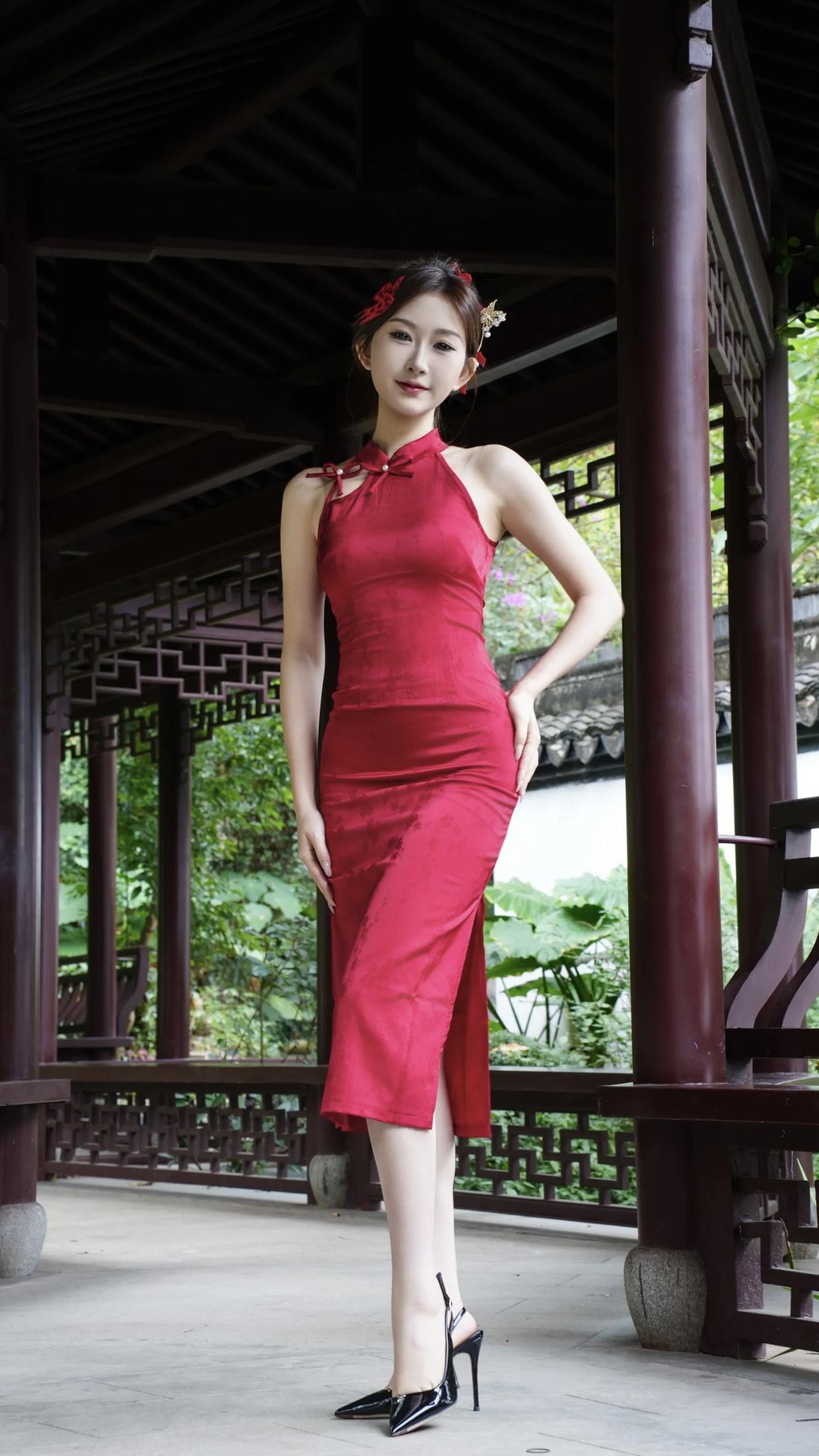 优雅红裙,古典园林,尽显东方韵味
