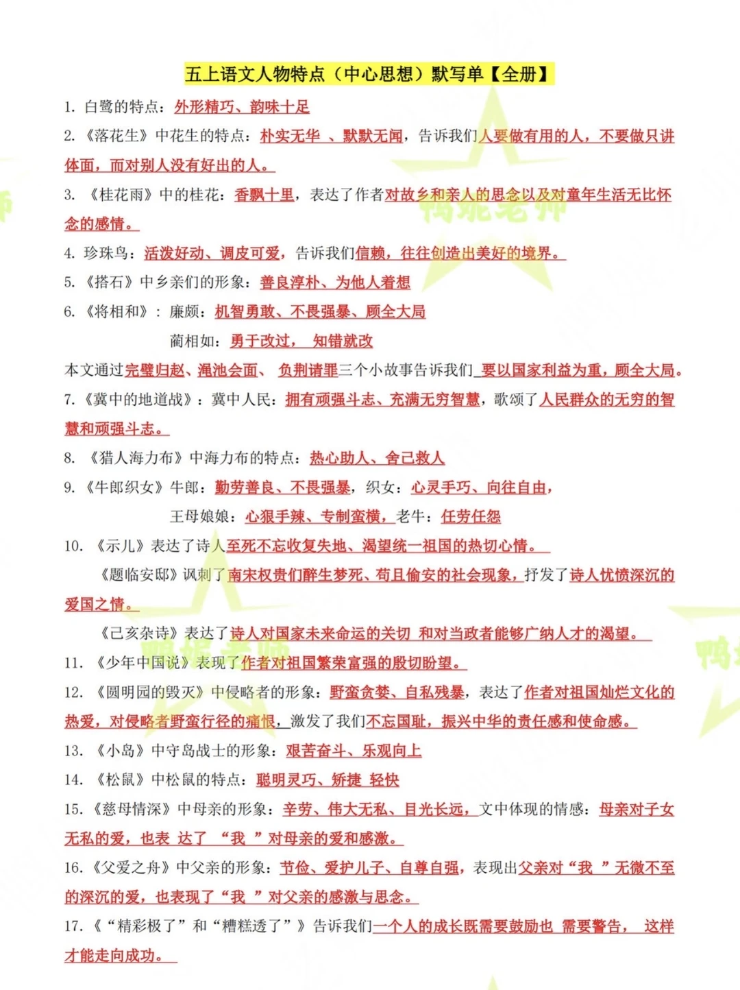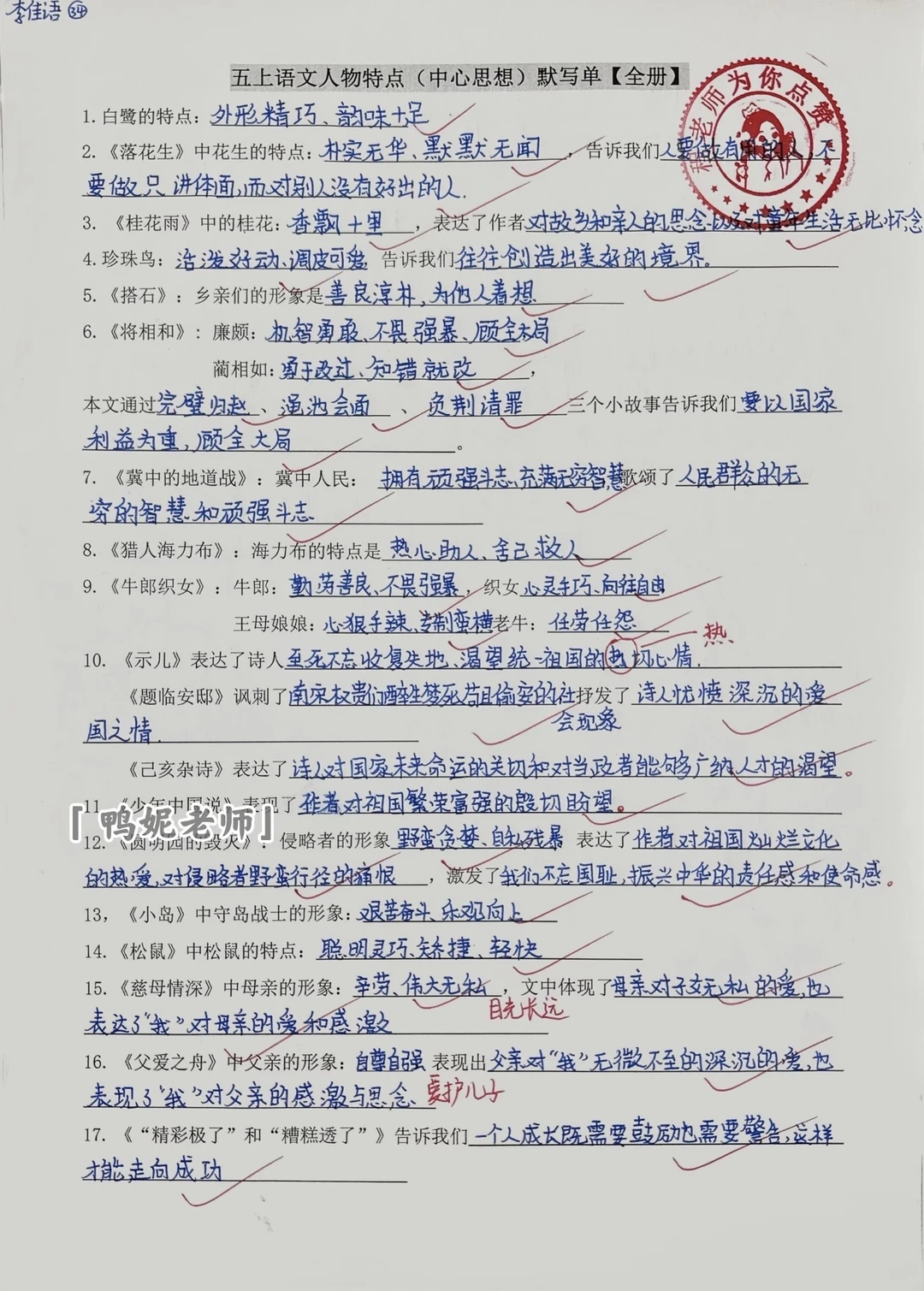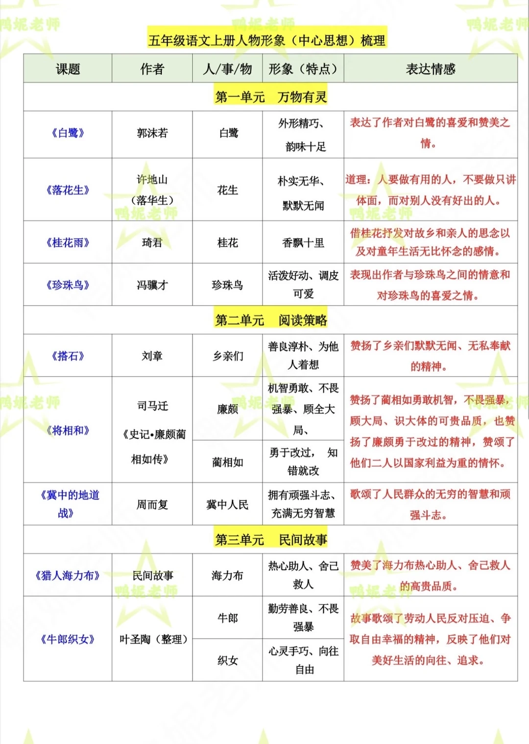 ①五年级上册人物特点和中心思想|表格梳理【早读版】 ②整理的默写单(分答案版和空白版) 考试复习好帮手,先进行读记,再进行默写