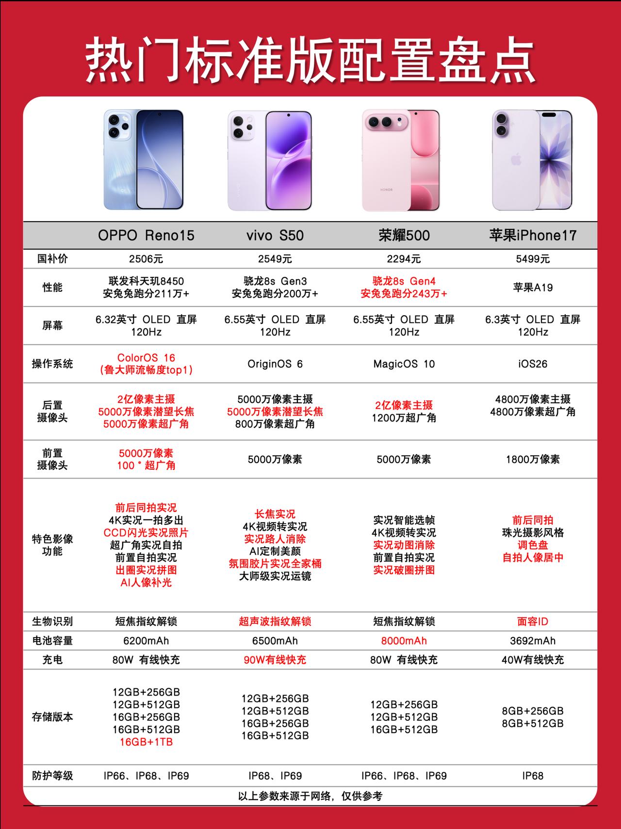 不看苹果,给你3000块荣耀OPPOvivo你选谁? 趁着2026年新国补,新年换机如何用好这个优惠?想换直屏机的看这里,我觉得果荣OV这四款新机值得考虑, 特别是国补3000左右的国产手机,都是人气很高的机型。 -- 📱iPhone17 适合高预算的选手,5499拿下256GB版本,高刷的加入让标准版也脱胎换骨,搭配iOS26就两字:丝滑 -- 📱荣耀500 续航党狂喜,8000mAh电池重度用一天都没压力。🔋骁龙8s Gen4处理器性能在线,适合对续航和性能要求高的宝子~2294可拿下 -- 📱OPPO Reno15 同价位销量王者,销量已接近百万,国补后2506可拿下它! 2亿主摄 + 5000万潜望长焦 + 5000万超广角,镜头无一个凑远近拍摄都能打。 📸最绝的是CCD闪光实况 + 出圈实况拼图玩法,出片发圈包是焦点的~ 它搭载ColorOS 16系统,AI功能多且实用,例如AI记账每次消费成功就能自动分类记账,月底复盘花了什么钱简单明了~ 📱vivo S50 2505可入手,5000万主摄 + 5000万潜望长焦+800万超广角,拍人拍景都很出片。✨橘子系统流畅不卡顿,超声波指纹解锁速度快。 总结: 预算高直接冲iPhone,预算够不着苹果另外几款国产机型也不错, 尤其是Reno15,外号OPhone15,配置全面并且价格也合适,有已经入手的吗?看看你们喜欢哪款呢? 国补3000左右手机 3000元手机推荐 OPPOReno15 荣耀500 vivoS50 iPhone17 拍照手机
