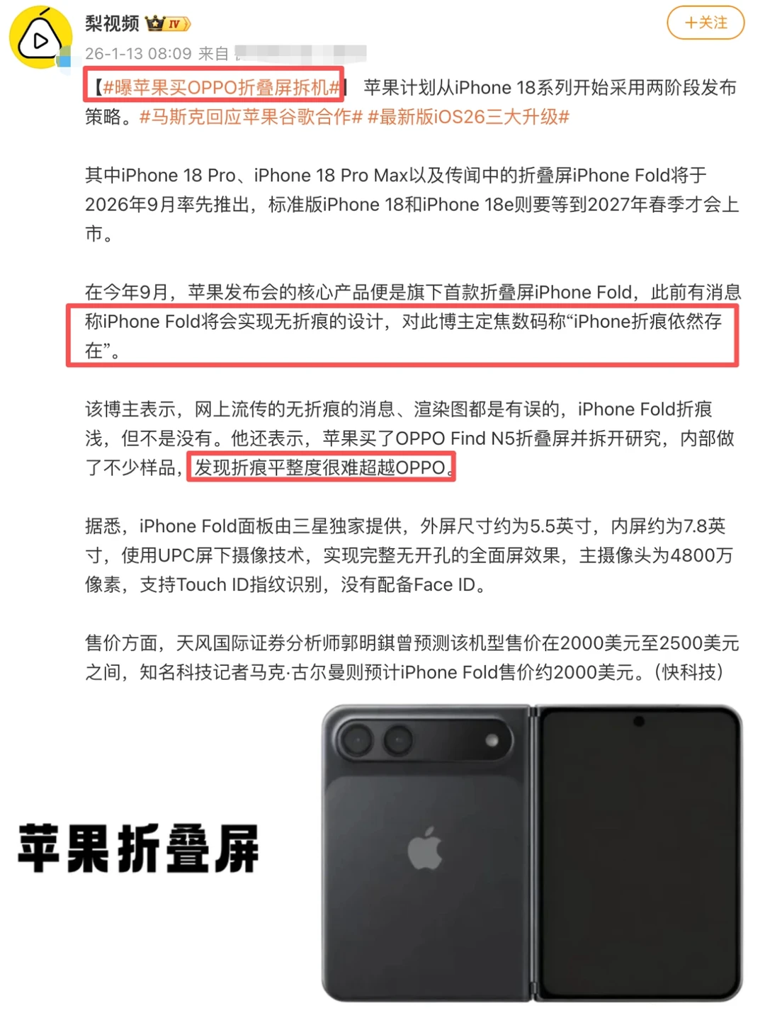 苹果折叠屏模具泄露!折痕还不如OPPO旧款?!