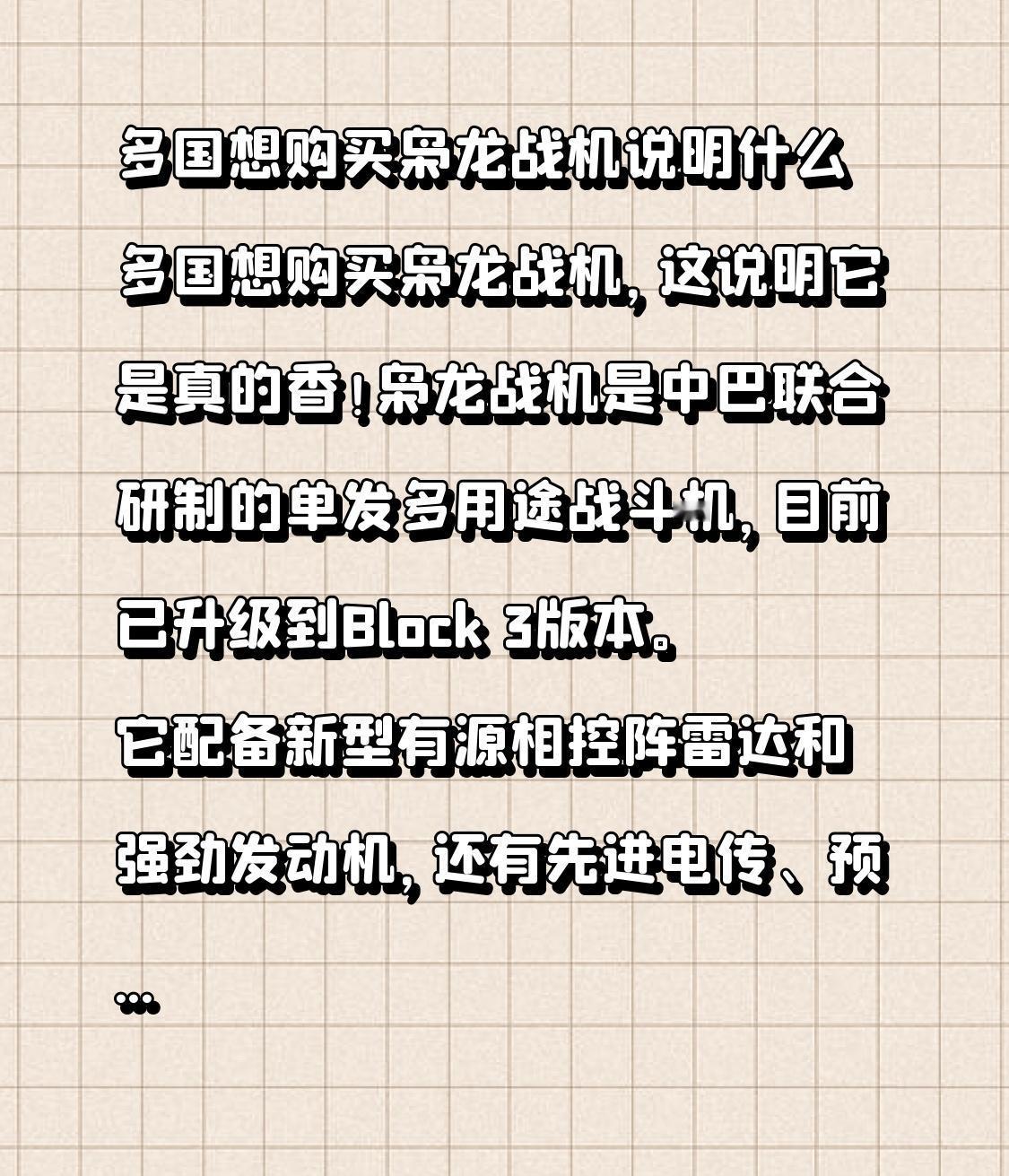 多国想购买枭龙战机说明什么 多国想购买枭龙战机,这说明它是真的香!枭龙战机是中巴联合研制的单发多用途战斗机,目前已升级到Block 3版本。它配备新型有源相控阵雷达和强劲发动机,还有先进电传、预警等系统,综合性能达到4.5代战机水平。 它能挂载射程数百公里的PL - 15E导弹执行超视距作战,还具备多任务能力,载弹量达3.6吨。截至2024年5月,它已加入四国空军序列,总装备量约190架。自2025年初起,巴基斯坦靠它拿下约120亿美元军火订单。这都证明了枭龙战机性价比高,能满足多国国防需求。