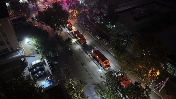 本次整修累计完成机动车道沥青热再生24803平方米,采用地聚物注浆技术处理基础病害3725平方米;非机动车道完成水性SP施工5500平方米,沥青摊铺2500平方米;同时更换人行道花砖7106平方米,施划道路标线3960平方米,并对快车道检查井进行了统一加固与更换。
