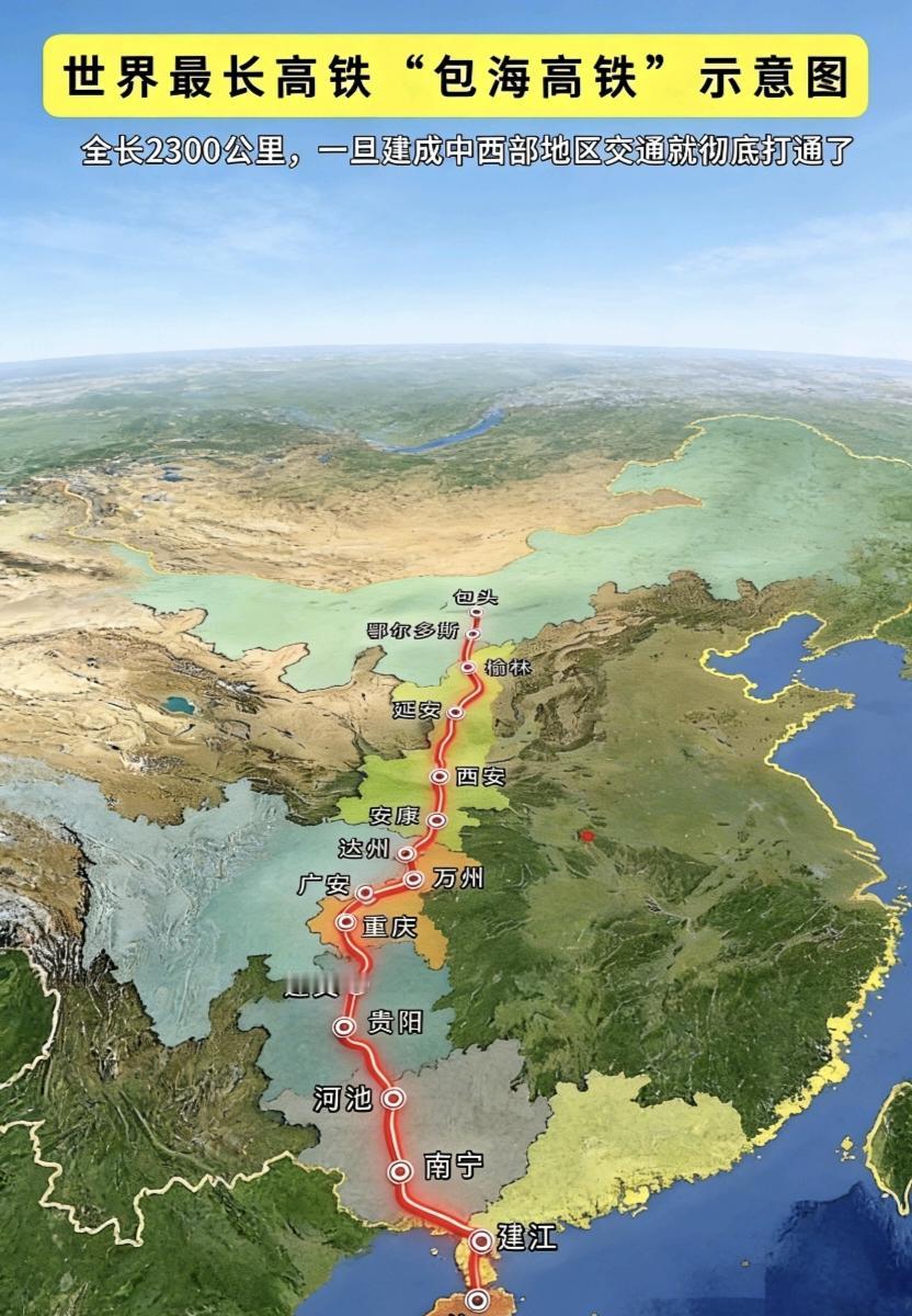 包海高铁:2300公里南北大动脉的战略伟力 作为国家“八纵八横”高铁网核心工程,包海高铁北起内蒙古包头、南至海南海口,全长2300公里,设计时速以350公里为主,建成后将成为全球最长高铁线路,从包头到海口仅需8小时即可实现“朝发夕至”。这条纵贯中国中西部的钢铁巨龙,串起包头、鄂尔多斯、榆林、延安、西安、安康、达州、广安、重庆、遵义、贵阳、河池、南宁、湛江、海口等数十座城市,彻底打破了南北地理阻隔,成为中国交通版图上的全新标杆。 包海高铁并非简单的交通线路,而是名副其实的中西部南北大通道。它填补了京广高铁以西的南北高铁空白,让西北至华南的往来无需再绕道东部,直接串联呼包鄂榆、关中平原、成渝、黔中、北部湾五大城市群。从草原腹地的包头,到塞上重镇榆林,再到革命圣地延安、古都西安,继而南下穿越川渝腹地的重庆、红色名城遵义,抵达黔中枢纽贵阳,再经桂北河池、南疆首府南宁,最终抵达南海之滨的湛江与海口。这条线路跨越7个省级行政区,覆盖国土面积超33.7万平方公里,将中国的西北能源基地、西南制造中心与华南沿海门户紧密相连,堪称“中国最美风景走廊”与“发展黄金线”的结合体。 不同节点城市的资源禀赋,更让这条高铁的联动价值成倍放大:包头的稀土、鄂尔多斯的煤炭天然气,为沿线工业发展提供核心能源与原材料;榆林的煤化工、延安的红色文旅,锚定了西北产业升级与文旅融合的方向;西安的科教资源与先进制造,成为沿线创新发展的动力源;安康、达州的特色农业与矿产,补齐了区域产业链的基础环节;广安、重庆的装备制造与物流枢纽功能,打通了西南与全国的产业循环;遵义的酱香白酒、贵阳的大数据产业,彰显了西南特色产业的核心竞争力;河池的生态文旅、南宁的东盟合作优势,架起了中西部对接东盟的桥梁;湛江的港口资源、海口的自贸港与旅游经济,让内陆与海洋经济实现深度融合。 其战略价值更体现在经济与军事的双重维度。经济上,包海高铁连接“丝绸之路经济带”起点西安与“21世纪海上丝绸之路”腹地北部湾,打通内陆与海洋的物流通道,助力秦巴山区、黔南少数民族聚居区等欠发达地区承接东部产业转移;同时串联稀土、煤炭、大数据等产业集群,以及兵马俑、黄果树瀑布、海南海岛等文旅资源,预计年客运量达8000万人次,激活沿线万亿级文旅与产业经济。军事上,8小时的快速通达能力,让南北方向的兵力投送、物资支援效率大幅提升,依托高铁的快速机动特性,可在短时间内完成跨区域战略支援,筑牢国家国防安全的交通保障体系。 这条总投资超4200亿元的超级工程,不仅是中国基建实力的彰显,更是区域协调发展的“加速器”。它让草原与海岛不再遥远,让内陆与沿海深度融合,在改写中国交通格局的同时,也为国家发展注入了强劲的南北联动新动能。