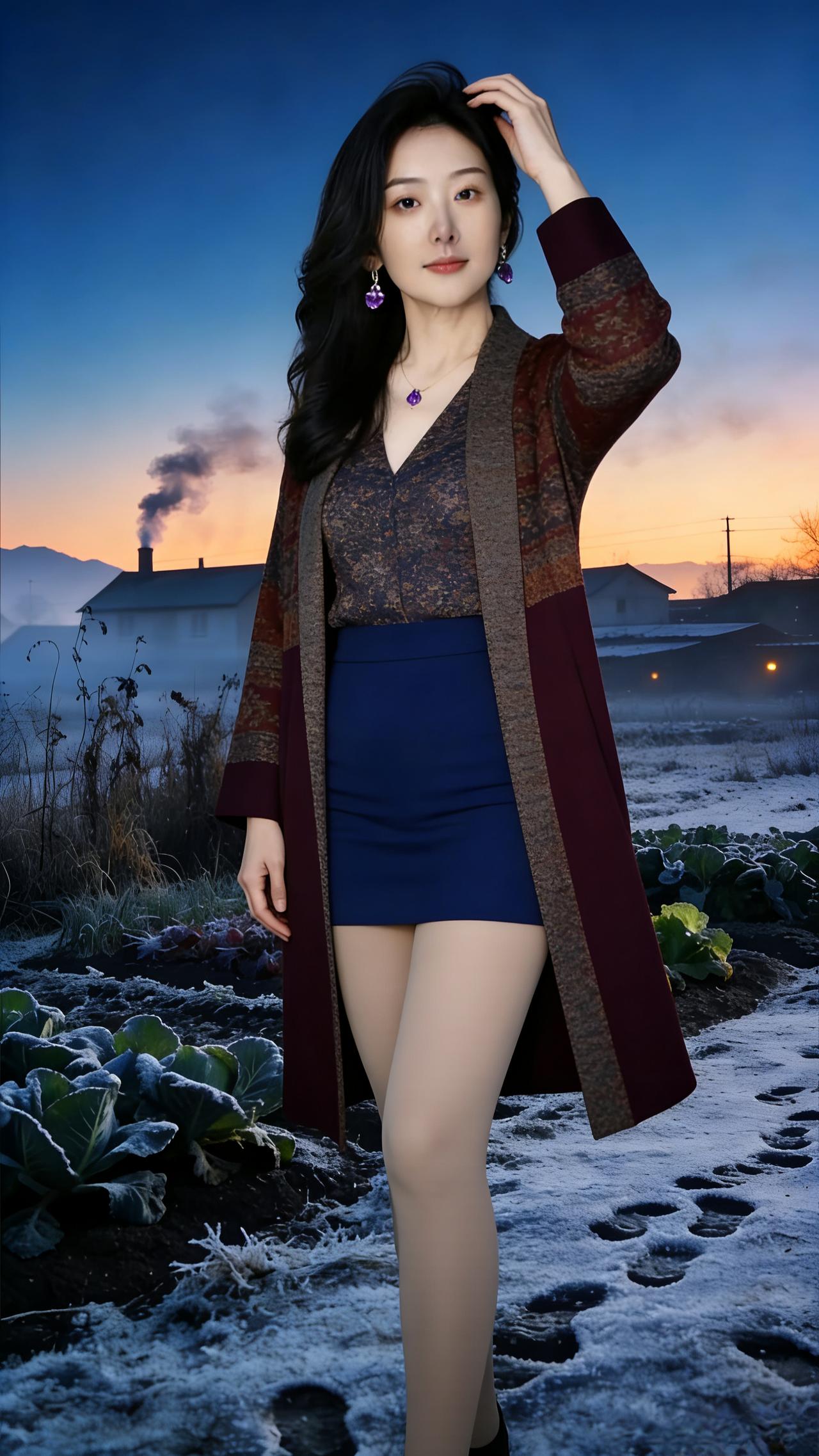 我站在霜结的田野,与暮色对峙 衣袍的纹路,藏着未说的故事 紫宝石贴着锁骨,是心底的温柔不肯凉透 炊烟飘向天边,像我没说出口的眷恋 菜畦里的白菜,裹着霜,像裹着岁月的茧 我伸手,想触碰那缕飘远的烟 指尖却只接住,寒雾的凉 风穿过衣摆,带来村落的烟火气 那是人间的暖,拽着我不往孤独里陷 发梢的卷,被风揉乱,像心事缠成的团 我站在这里,不是等待,只是想和冬 说一句,我仍爱着这人间的琐碎与暖