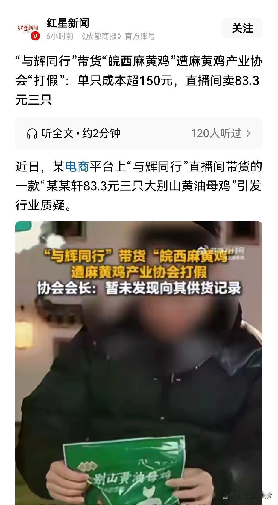 难道董宇辉也要步三只羊小杨哥的后尘了吗? 与辉同行安徽行带货的皖西麻黄鸡被打假! 这是有人要害董宇辉啊! 刚开始看到这个新闻的时候,就和吃了苍蝇一样,为什么董宇辉在其他地方带货地方特色产品,都是一片赞美,也是受到品牌方和当地企业的一致好评? 而来到安徽就出了这样的事情,穷山恶水出刁民这词也用不到安徽这么美丽的地方啊,特别是大别山,作为老革命根据地,还有有名的将军县,怎么也不会和碰瓷有所联系啊! 直到看到这次产品的价格,才恍然大悟,这完全是董宇辉下面人选品的问题,很有可能董宇辉多年未进菜市场,不了解现在的物价水平(没有媳妇,估计平时也不买菜吧),不到90元就能买到3只老母鸡,并且还给你邮寄到家,一只鸡不到30元,可想而知是什么鸡了。 一只老母鸡养一年的成本虽然说150元有点夸张,但是30元肯定是不够的,我们在市场上买那种淘汰的蛋鸡,一只30元也够呛能买到吧? 这次被人质疑完全是董宇辉吃了不做饭的亏,再翻翻三德子赵刚卖一只鸡多少钱就知道了,并且他还是源头直供,不像这次还是经过经销商转一手。 当年三只羊的小杨哥也是陨落在安徽,被曝光直播间卖的梅菜扣肉,竟然用的是猪脖颈肉,还有一些淋巴肉,一些下脚料,从此小杨哥就开始跌落神坛,经过多次努力付出,也无济于事。 经过这次黄油鸡事件,董宇辉应该把精力多放在选品上,不能因为自己手下的人一时疏忽,而辜负了粉丝对自己的信任,一旦产生了信任危机,说不定就是下一个某方甄选了! 你们觉得这次是谁在说谎?