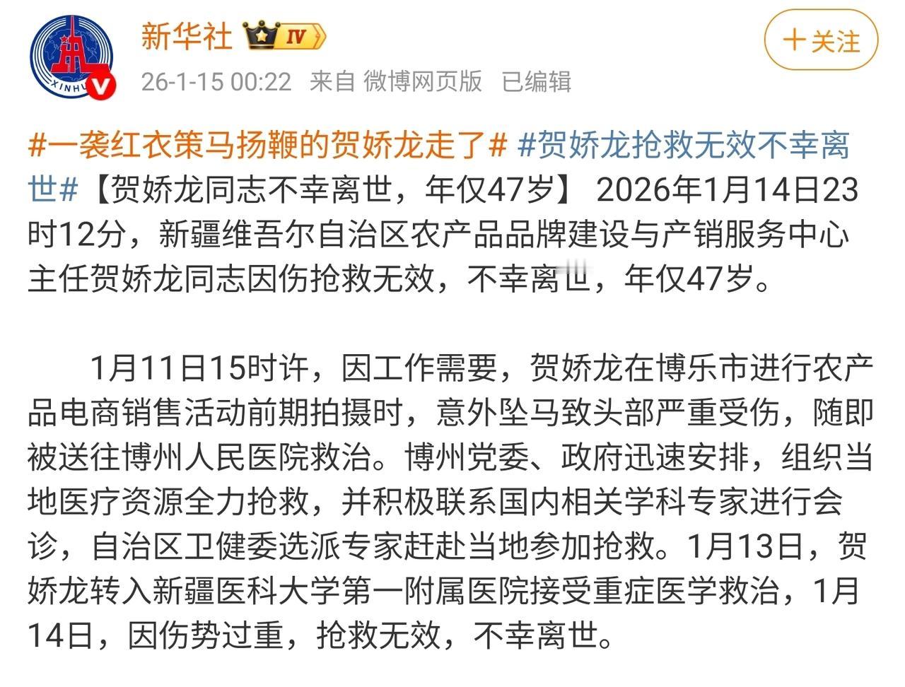 没有奇迹,官方确认贺娇龙去世,年仅47岁。 这位英姿飒爽的女豪杰,还是没有过这一关。 很唏嘘呀,我记得之前她走红就是因为在冬天骑马,老师都夸赞他特别厉害。 于是这位姐姐就一路开挂,各种拍摄骑马的视频,带动当地经济。 这次也是因为工作需要,骑马进行拍摄,最后发生意外,不幸去世。 成也因为骑马,走也因为骑马,很令人感慨呀。