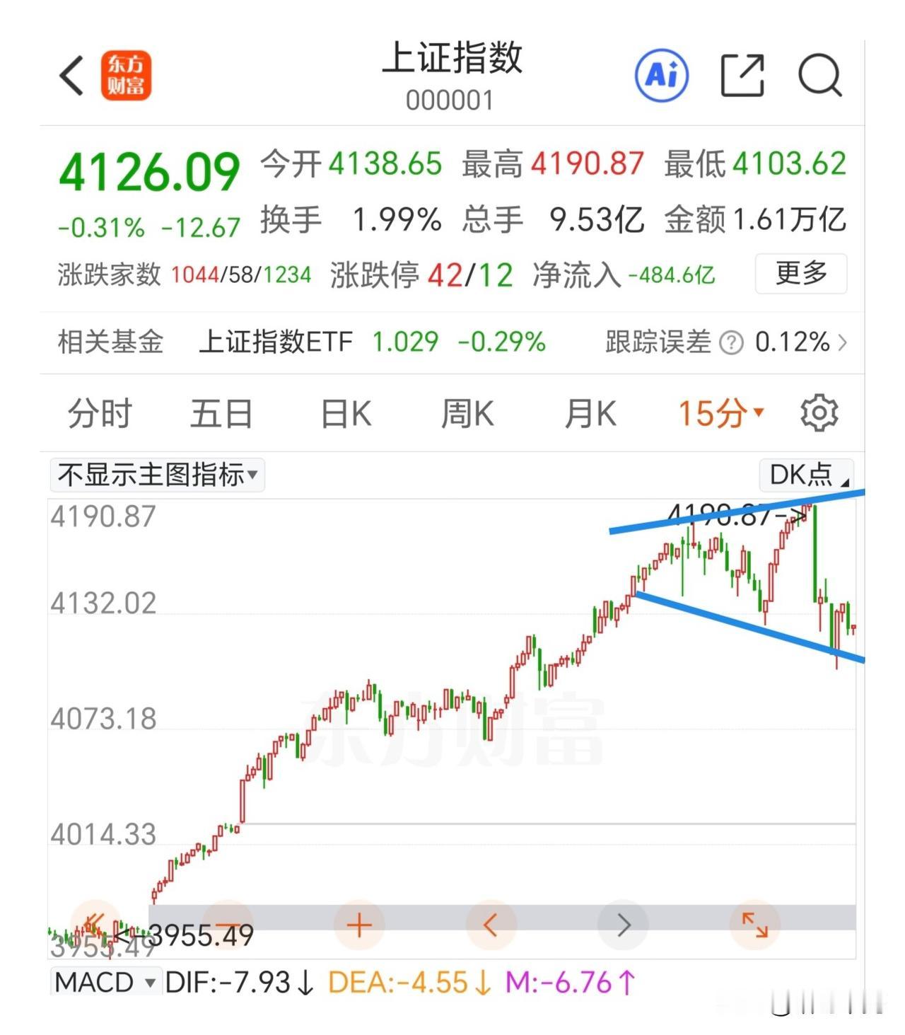 在高位出现这种形态的时候就要当心一些了,适当控制仓位。不要一涨就冲啊, 冲啊,一跌就跑啊,跑啊[尬笑] 这种形态是喇叭口,在高位和低位代表着反转信号。也可以看成扩散的楔形调整,它会朝着上下沿去做动作,到最后会撑不住。指数而言,如果向上冲高,即使创高点要适当减仓的。当然这是5分钟走势的,只是短线的高点,对应它的应该等一笔下跌后的底分型是安全进场点。 现在控制仓位为第一要务,拿到手里 吃到嘴里的才是自己的。纸面富贵不过是一场空,浮赢而已。 股票建仓时机 股票启动形态 股票入场时机 指数冲高防回落 高位卖出 下跌中继形态 股市顶部