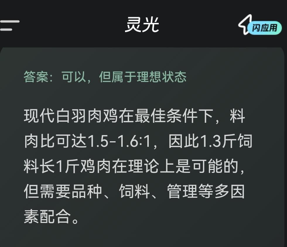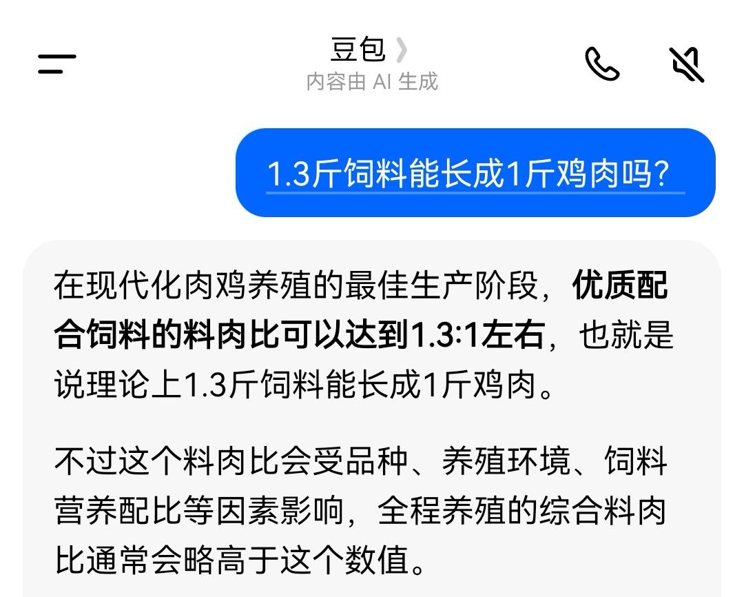 1.3斤饲料能长出1斤鸡肉吗? DeepSeeK、豆包、灵光分别给出了各自的答
