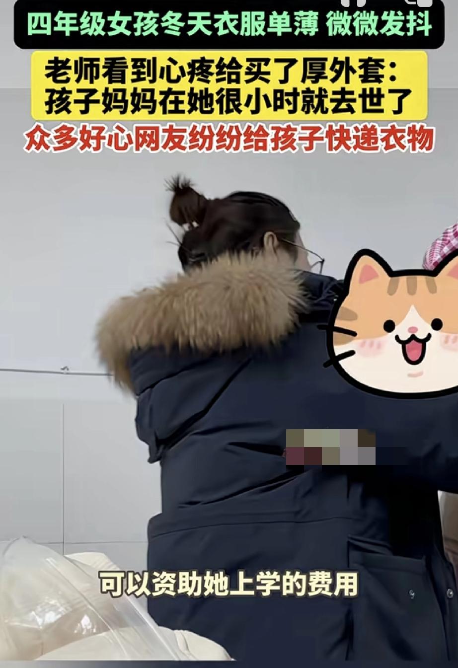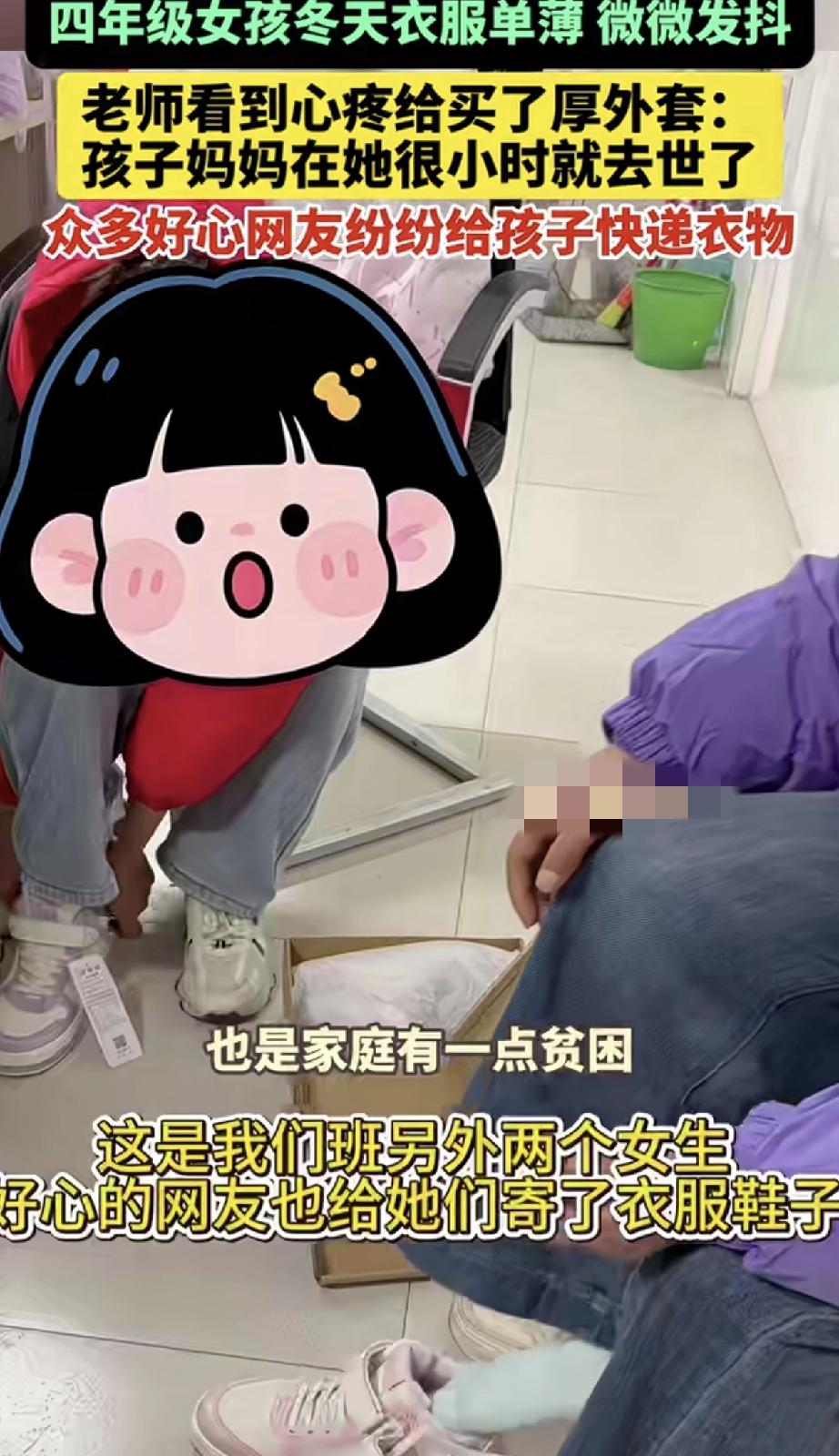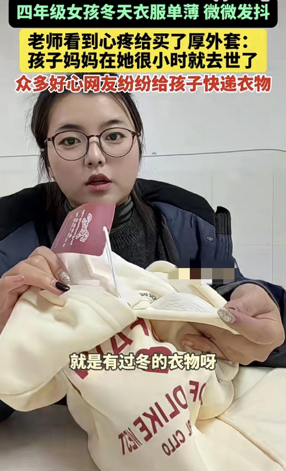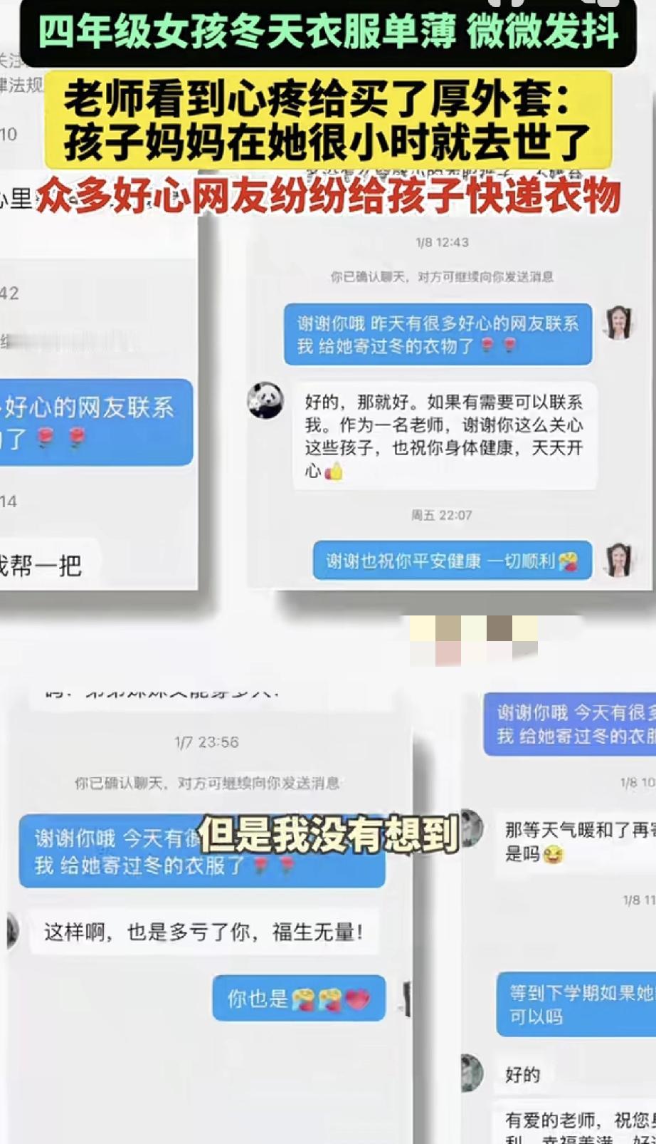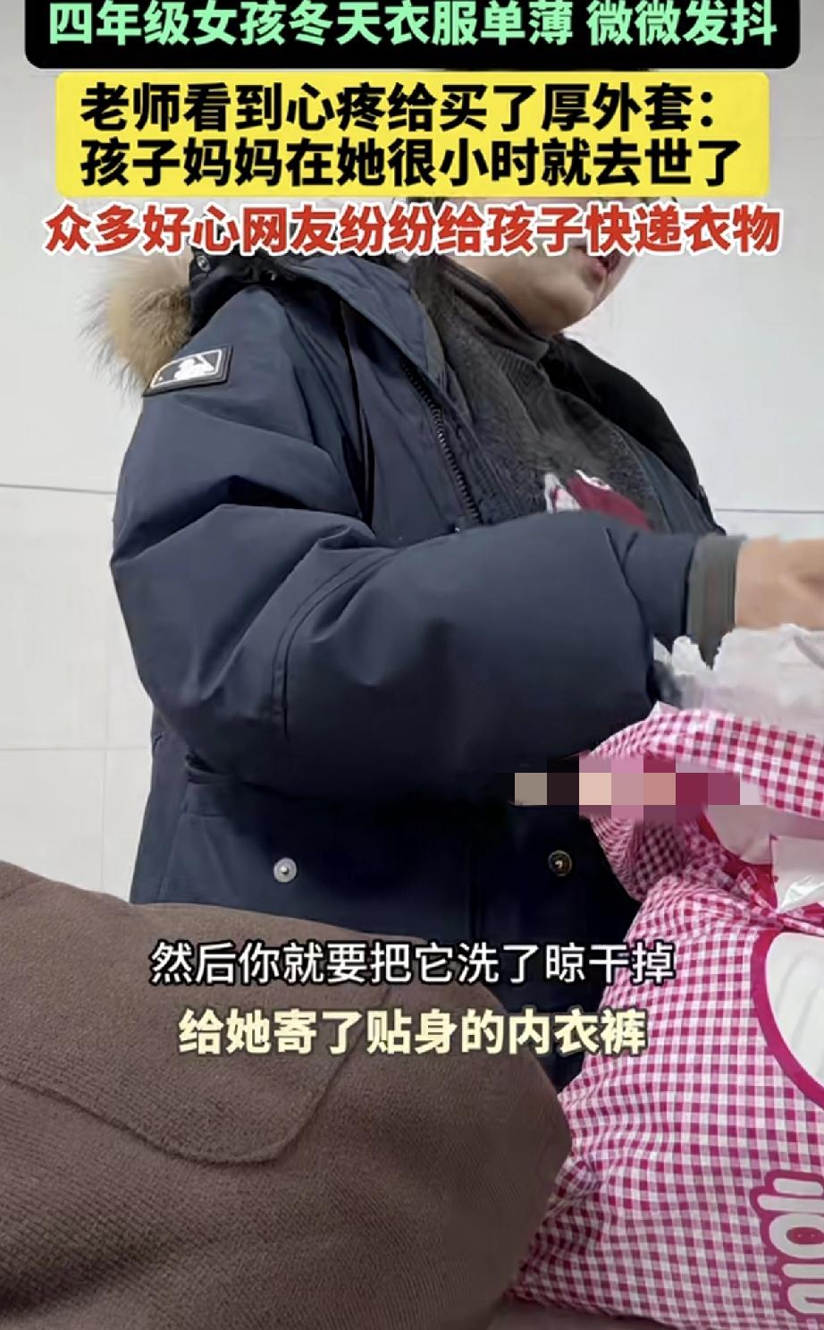 万万没有想到,云南一小学英语老师,因看见她教的四年级女生,在下雪天还衣着单薄的上学,女生在食堂吃饭时,更是被冻得微微发抖。老师看到后心疼孩子,便为其买了厚外套,并将女生衣着单薄的背影拍了下来,发到网上称“孩子妈妈在她很小时就去世了,孩子特别可怜…”。不料事情一经发布,众多好心网友便纷纷私信老师,给孩子快递来了衣物生活用品等,还有网友表示要资助孩子上学。 视频可见,老师收到大大小小的很多包裹,而这些包裹全是热心网友送给女生的东西,这其中包括厚厚外套棉衣,还是棉鞋等等。 也有贴心的网友得知女生没有妈妈,专门为女生挑选了贴身的内衣裤等等。更有网友表示,愿意资质女生上学的费用。 但因为东西太多,女生根本用不完,老师在得到好心网友们的同意后,又将多余衣服用品等,分给班上另外两个生活比较贫困的学生。 当看着她们穿得暖暖的,脸上也挂着开心的笑容,老师也觉得很欣慰很开心,更是打心底的感谢这些好心网友的善意。 不得不说,这真是一个温暖、善良、有爱心的好老师!而她的一个善举,更是将爱传递到全网,孩子们能遇到如此善良的老师,是他们的福气啊! 话说回来,这世上还是好人多啊,而好心网友的善举接力也再次说明,人世间是有温度的!为善良老师和好心网友们的善良点赞!因为有你们,世间变得更加温馨美丽了!也希望这份正能量传递到每一个人的心中!