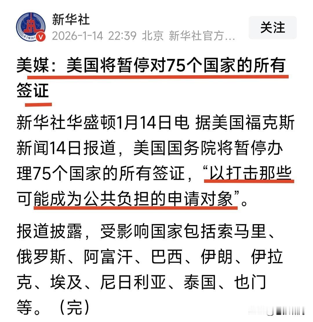 突发!美国暂停75国家所有签证申请,给出的理由是:以打击那些可能成为美国社会公共负担的申请对象! 这个“公共负担”什么意思?大概就是没啥本事,不能给美国社会做贡献,只会吃救济还闹事骚乱那些人吧! 这句话寥寥几个字,看似不经意,却侮辱性极强!隐藏着不屑一顾的厌恶感,令人像吃了苍蝇一样不舒服。 苍狼看到一个75国全名单,觉得有点惊诧!里面除了战乱不休的非洲与中东国家,诈骗频发国家,还有就是反美国家以及意识形态不同的国家。 再就是苏联解体时,分离出来的中亚五国与西北亚三国。还有几个欧洲小国,是从塞尔维亚分离出来的。以及一直没有长进发展的某些小国家。 不得不服老美!这些国家的移民,确实存在问题,不会给美国社会带来贡献,只会拖后腿,白吃白喝要救济,吃饱没事干,上街闹事惹人烦呐! 老美的做法,是否有一定启示性?给其他国家提个醒,在对待某些国家移民方面,有所警惕有所选择呢? …………