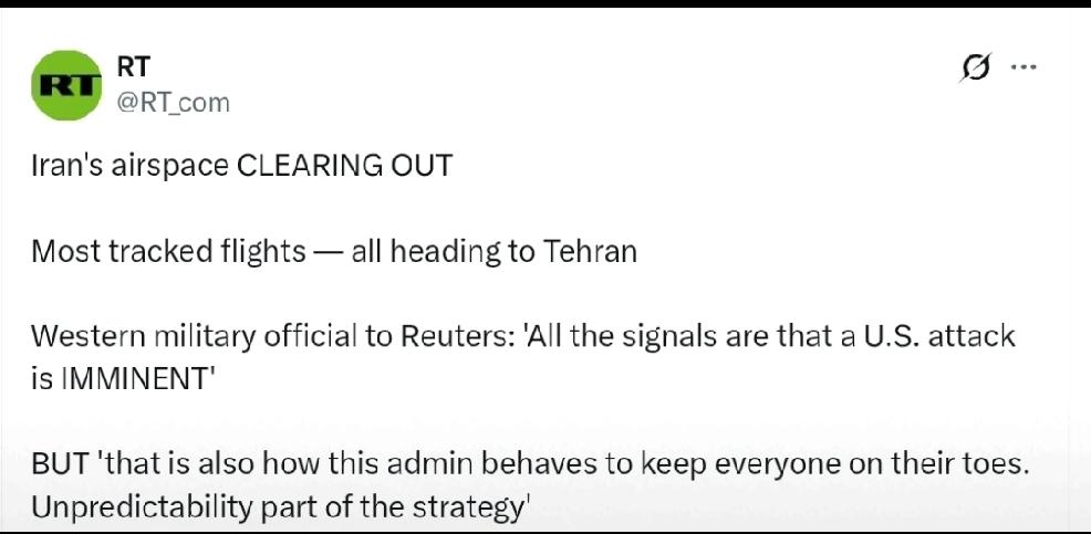 声东击西 据俄罗斯RT新闻报道,目前,伊朗领空正在清空,大多数被跟踪的航班全部飞往德黑兰,西方军事官员对路透社表示:“所有信号都显示美国即将发动攻击,这也是本届美国政府惯用的做法,就是要让所有人都保持紧张状态,不可预测性本身就是他们战略的一部分。” 个人认为:本届美国政府正在尝试使用,任何突破底线的办法,只为了支付巨额美债的利息 ,因为美债的大头持有者是美国国内的民众和机构。美国联邦政府不得不为支付美债利息而变得焦头烂额。个人把这一客观事实视为美国正在实行— 军事偷袭战与经济关税战,交叉综合应用— 新国策之原因。 无论是对待委内瑞拉,还是针对伊朗或是格陵兰岛,预计下一步美国又会把目光集中到非洲尼日利亚,这些国家都是美国新国策的对象。 不必想的太多,事情很简单,就是美国要抢劫。