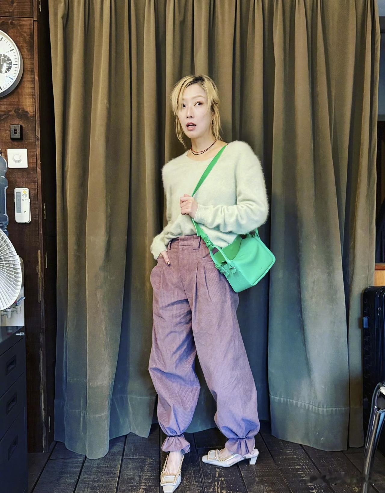 郑秀文晒日常穿搭,毛衣配花苞裤,绿色斜挎包撞色有冲击力。虽说状态不错,但穿搭一般,拍摄水平也很一般。