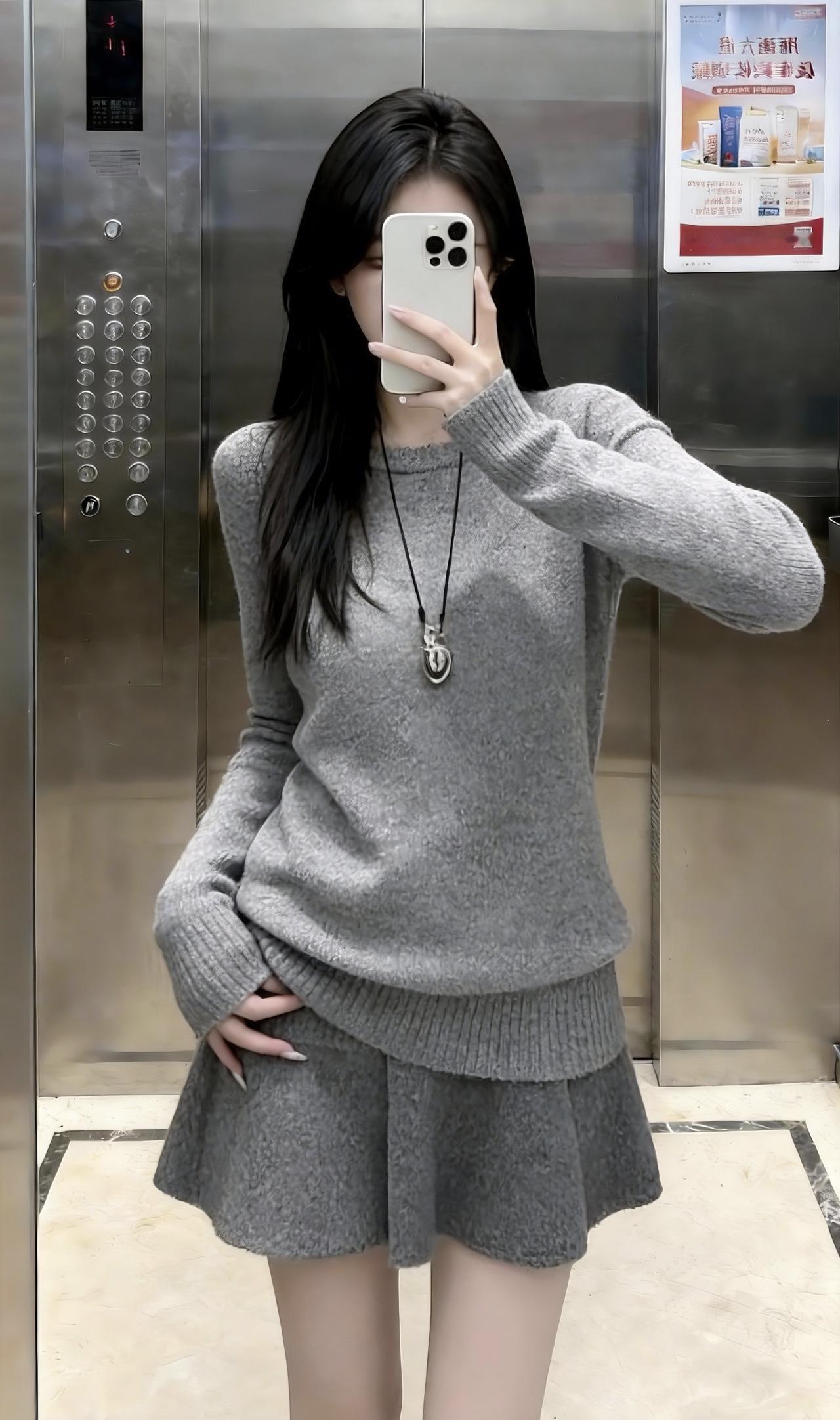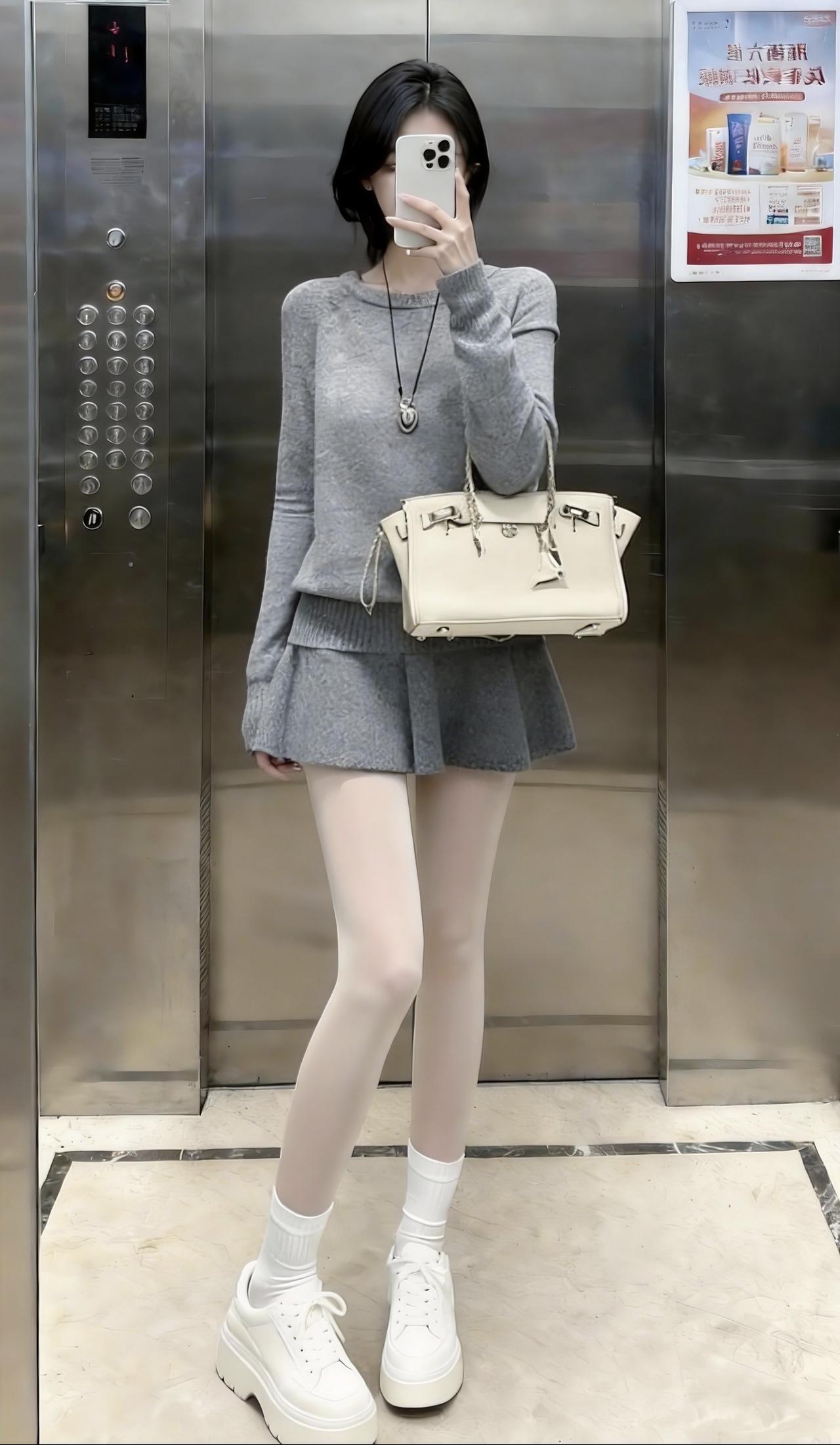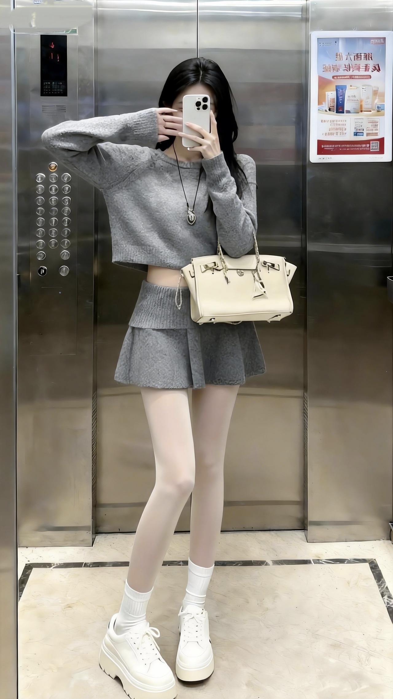 厚底鞋一踩,甜里藏着随性!把灰针织套装的温柔和奶白包的贵气搭出了松弛感,这种不费力的精致穿搭你们爱了吗?韩系穿搭 温柔穿搭 电梯拍照 穿出你的时尚你的感觉