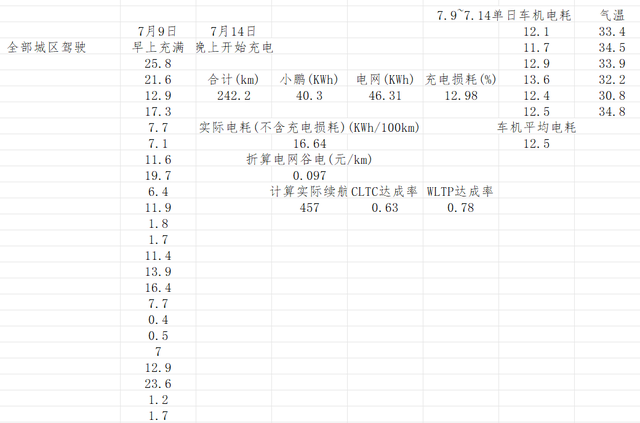 真实计算出来的电耗 一直听说小鹏的电耗控制得很不错才下手的截图早上在家充桩充满到晚上11点开始充谷电的实测记录。合计行驶242.2km,在小鹏app里显示充满用电40.3度,车机显示的电耗是12.5,而计算出来的实际电耗是16.6,按这个电耗推算出来我725续航的车只能跑457km,CLTC达成率才63%,WLTP达成率也才78%,这几天气温基本是30℃的样子,全是城区通勤,空调只开的25~26℃ 鹏友们计算过自己的真实电耗吗?我这才提车一个月,不知道这电耗正不正常