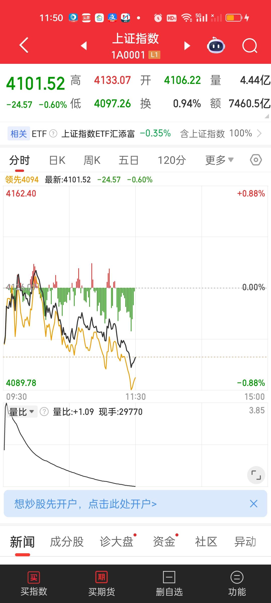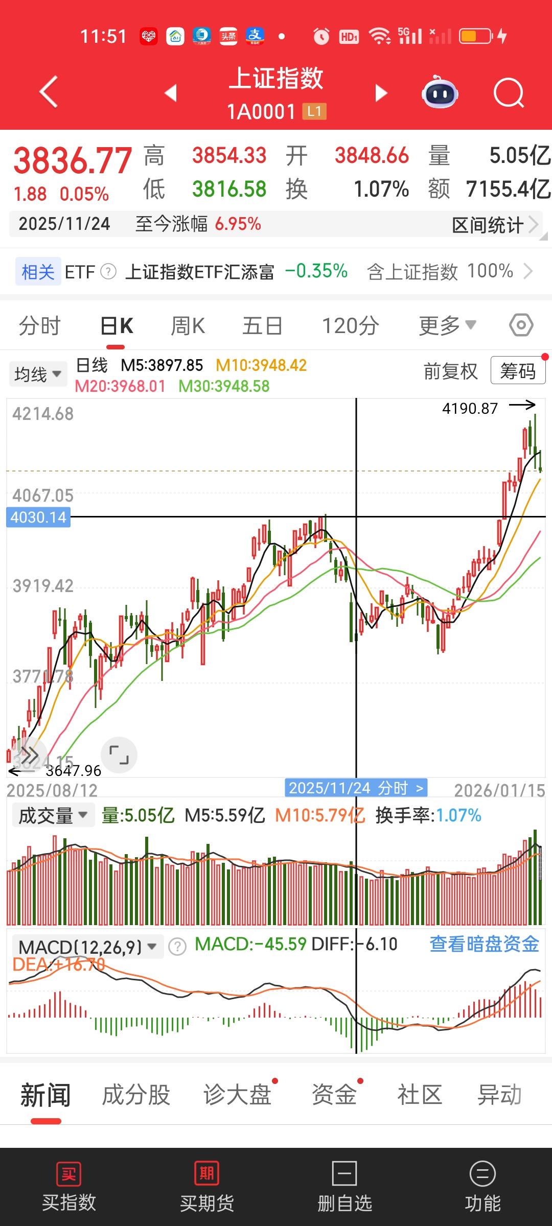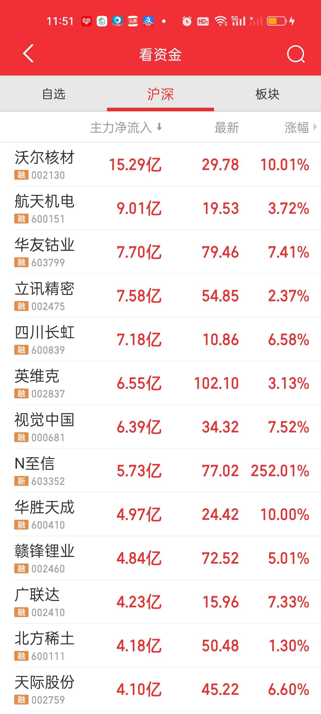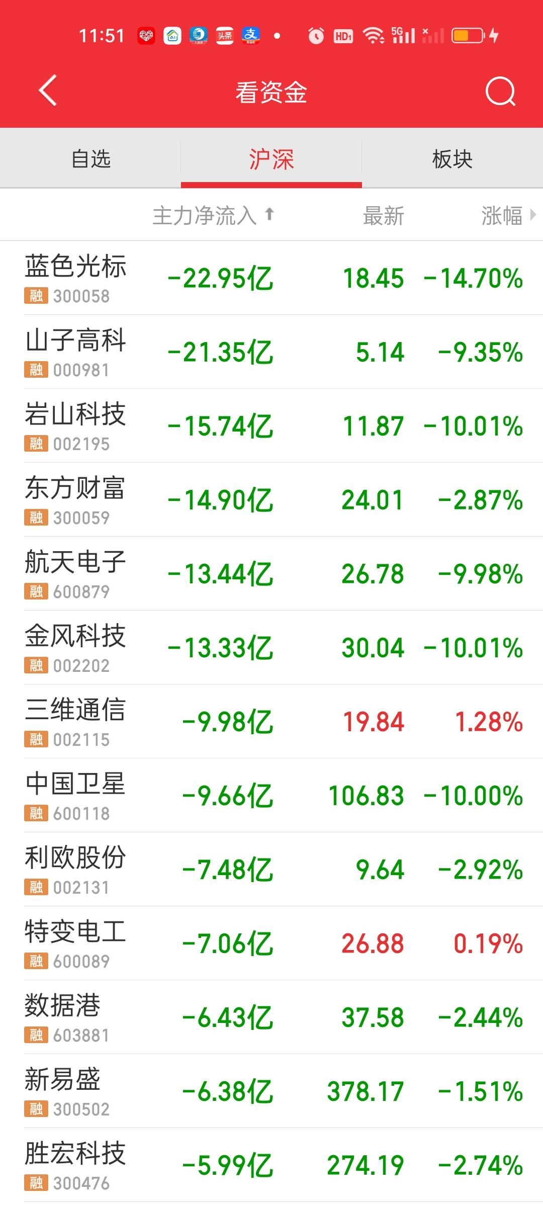 中午收盘了,今天的下杀在意料之中,调整一定会来,只是早晚的问题。还是看那个点位4030,今天最低点来到4097.26,4030/4097.26=0.9836,也就是说向下还有1.64%的空间。下午再杀一杀,明天再一个低开就基本到位了。最迟下周一,下周二也就调整到位了。其实这样的调整是好事情,不明白为何这么多人如此暴怒。 一个上午成交量就缩量了3507亿,跌停价家数有54家,这在之前是从未遇到的,大盘资金净流出783亿,主力资金净流入方面只有沃尔核材一家净流入资金在10亿以上,但流出资金超10亿的有6家。今天对商业航天的下杀是比较厉害的。