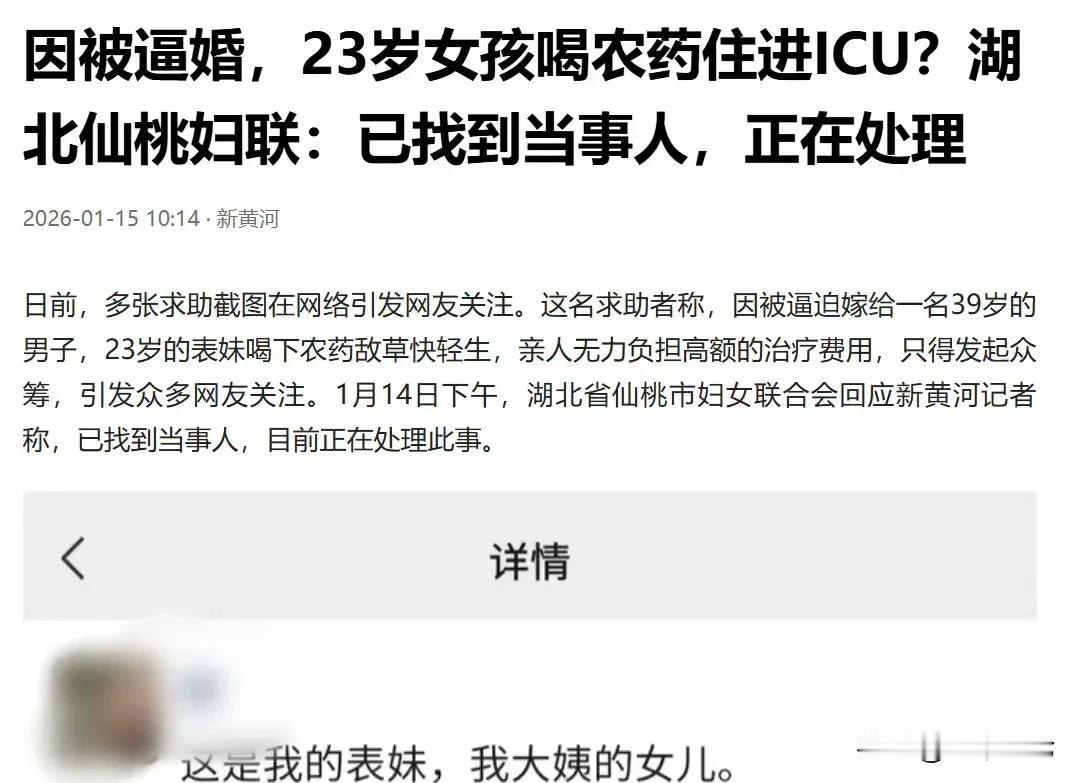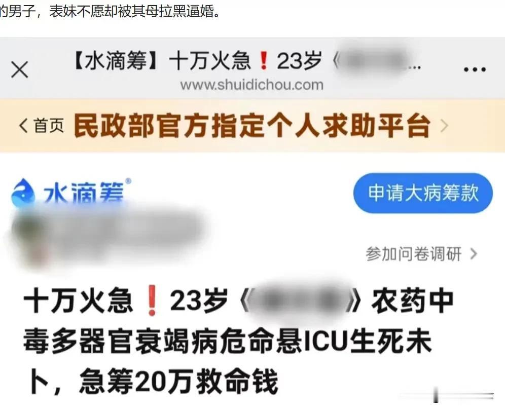 湖北仙桃,一个水滴筹救助,一个23岁女孩的悲惨,震惊了大家,她被迫嫁给39岁的男子,女孩绝望之下,喝了农药敌草快,住进了医院,让人悲愤的是,女孩还没有脱离危险,妈妈来探望半小时,居然就要走了女孩卡的密码,她的爸爸更是说没有路费,就不来看她,女孩的悲惨,早在她出生时,就已经开始了。 说起自己的这个表妹,求助者是真的又心疼,又后悔,后悔自己曾经怪自己的妈妈偏心,对表妹的好远远超过了对他的好。 如今他看着躺在病床上的表妹,才知道自己曾经是多么的无知,有着一颗残忍的嫉妒心,他的妈妈,其实早就看到了他表妹的可怜,正用着自己的方式,去爱着这个内心破碎的孩子。 直到后来,求助者才知道表妹真的太可怜了,她的这一生可以用悲惨来形容。 表妹有一个嗜酒如命的父亲,没有半点父爱可言,早在她才几个月的时候,喝酒醉的父亲,居然就像扔垃圾一般,将年幼的女儿从楼梯上扔下去。 可怜的孩子,才几个月大,她从楼梯上滚下来,脑袋都流血了,就那样昏迷躺在楼梯上,没有人理她,到她的外婆过去才发现,才赶紧把她抱去医院,救回了她的命。 从此表妹再也没有得到过父爱,发生这件事情之后,她的父亲直接消失不见了,或许是不想承担这笔医疗费,又或许不想承担养育之苦,只有在他得了尿毒症的时候,才想起自己的女儿长大了,挣钱了,来找女儿要钱了。 表妹的母亲只是把她当做摇钱树,小的时候对她不闻不问,只有外婆一个人照顾她,抚养她长大。 因为小时候被父亲摔下楼梯,脑袋受了伤,她看起来也不聪明,所以没有本事找一份体面的工作和收入高的工作,只能做保安,一个月领那两三千块钱的工资。 即使这样,他的表妹省吃省喝,还能攒下6万元,可是这6万元竟然全部被她的母亲拿走了。 就是这样的母亲,在她23岁的年纪,着急地要把她嫁出去,嫁给一个39岁的男子,换取彩礼。 虽然求助者的表妹并不是很聪明,但她知道自己想要什么,也知道自己喜欢什么样的人,一个大自己16岁的男子,她坚决不愿意嫁。 她的母亲害怕拿不到彩礼,害怕女儿心有所属,就把她所有的联系方式都拉黑了,让她断绝了和外界的来往,好让他心甘情愿地嫁给了39岁的男子。 他的表妹就在这样无助之下,选择了轻生,可怜的表妹,即使选择轻生,被母亲掏完钱的她,只能买一瓶只需2.54元的农药。 直至女孩深处危险之中,她的妈妈依然没有把她的生命当一回事,就连她的女儿住进医院,医生都没有联系上她。 还是求助者的妈妈,联系上的,可她根本不在意女儿的死活,就连去医院也是等慢吞吞的公共汽车,不愿意花钱打车过去。 即使她看到女儿痛苦地躺在床上,随时有生命危险,这个妈妈,在探望的半个小时,只是迫切地要了女儿的卡的密码。 或许这一刻,求助者的表妹心更寒了,她躺在病床上,脑子是清醒的,或许这一刻,她才看清了自己的父母,可能这一刻,她也释怀了,她想活着了。 可她很清楚,她要活下去要花很多很多的钱,她要妈妈拿钱出来帮她是不可能的,妈妈不但不愿意给钱,甚至不愿意返还属于她的钱。 如今是求助者的妈妈在刷卡维持着女孩的生命,求助者这才发出水滴筹,希望能够救表妹一命。 看到这个女孩的悲剧,看到她命悬一线,这实在是令人心痛,多么可怜的女孩呀! 没有得到父爱和母爱,反而还要被母亲嫁给了比自己大16岁的男子,只是为了换取彩礼。 她只是母亲的取款机,她命悬一线,母亲只在乎她还有没有钱,根本不愿意出钱救女儿。 或许她的母亲根本没有意识到女儿的后果,会有多么的严重,实际上敌草快是非常毒的农药,一旦喝下去,超出一定的量,器官会衰竭,这是非常痛苦的死法。 女孩才23岁,她正值青春年华,应该有一个甜甜美美的恋爱,有一个知她疼她的心上人,一起感受这世间的美好。 可因为母亲的逼婚,因为生来就缺的父爱和母爱,她选择了这一条路,一条让她醒悟又后悔的路。 如今他的表妹后续治疗费还要20万,现在全靠求助者的母亲刷卡承担着。 水滴筹里面,有显示着这位女孩的相关信息,水滴筹的工作人员,也向记者确认这个事是属实的,妇联也表示已经联系到当事人,正在处理此事。 如果这事情确实是真的,可以说这女孩的这一生是真的很悲惨,她的悲惨真的是从出生就开始。 首先,她没有得到父爱和母爱,但是她的父母对她是有抚养义务的。 《民法典》第1067条规定:父母不履行抚养义务的,未成年子女或者不能独立生活的成年子女,有要求父母给付抚养费的权利。 如果她的父母没有抚养过她,全靠她的外婆抚养她,那么女孩可以要求父母支付抚养费。 其次,没有父爱和母爱的家庭,难以建设优良的家风。 《民法典》第1043条规定:家庭应当树立优良家风,弘扬家庭美德,重视家庭文明建设。 正是没有优良的家风熏陶女孩,所以女孩才会被逼婚,母亲在彩礼熏心之下,逼女儿结婚,养成悲剧。 那么你对女孩的遭遇有何看法呢?