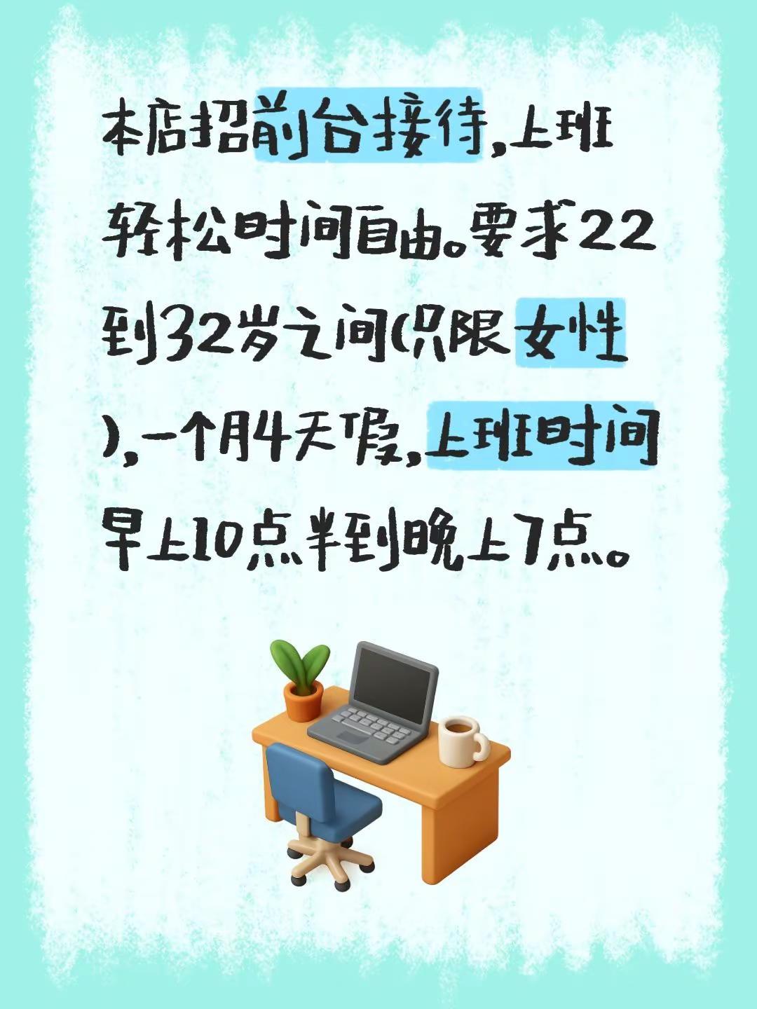 本店招前台接待,上班轻松时间自由。要求22到32岁之间(只限女性),一个月4天假,上班时间早上10点半到晚上7点。