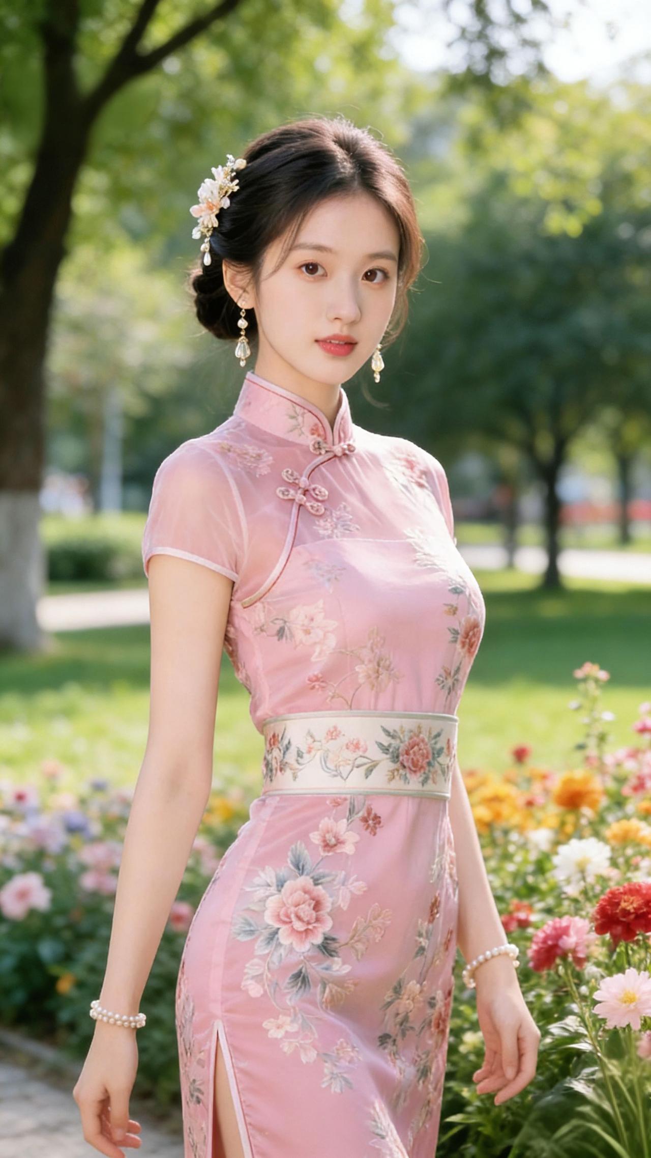 粉襟花影裹春柔 风携草木香漫过肩头时,她正立在花径旁。藕粉色旗袍裹着轻软的春,襟上绣的牡丹似沾了晨露,顺着斜襟盘扣往衣身舒展——腰际织锦带恰好收束了柔韵,让舒展的身形浸在日光里。 发间簪的花钿垂着细链,随抬眼的弧度轻晃如星子。耳坠碰着耳廓的轻响,混在风掠花瓣的簌簌声中。她抬手理鬓,腕间珍珠串滚出细碎的光,同裙摆的纹路一道,浸在四月的软暖里。 原来旗袍从不是古旧的织物,是把春天裁作了衣裳。当她踩着花影徐行,风都慢下来,替她拢好肩后碎发——这哪里是路过花丛,分明是春从诗笺里走出来,落在了人间的软光中。 旗袍春光 中式雅韵