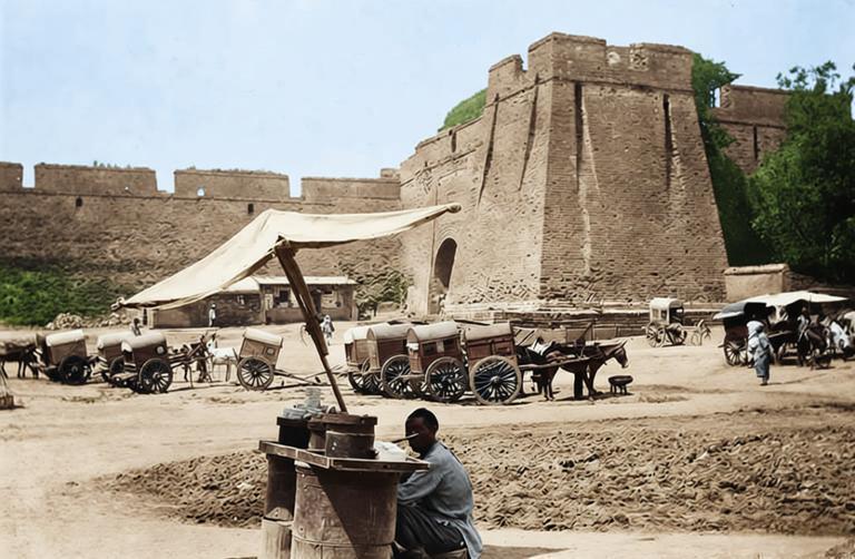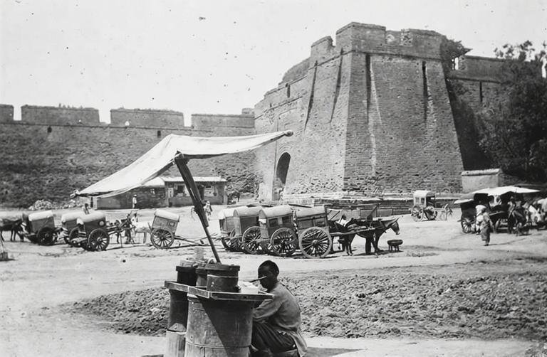 这张照片拍摄于清末,地点应在北京正阳门或崇文门、宣武门等城门外侧的城墙根一带,由外国摄影师捕捉。 照片中,一位中年小贩蹲坐在简陋的点心摊前,双手抱膝,望向来来往往的行人与马车。摊前几个大木桶里可能装着热豆腐脑、茶汤,旁边搭着白布凉棚,却空无一客,生意冷清得令人心酸。 不远处,数十辆骡马大车、人力车和货车停成一片,这片空地就是当时北京城门外最原始的“露天停车场”——进出城门的咽喉之地,商贩、农民、官差、洋人、挑夫都得在此停车换乘或歇脚。