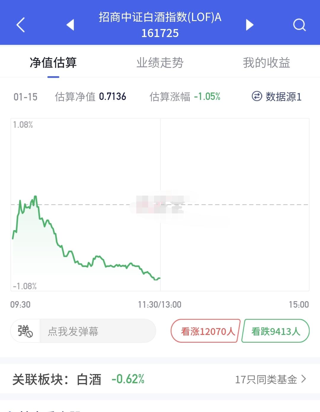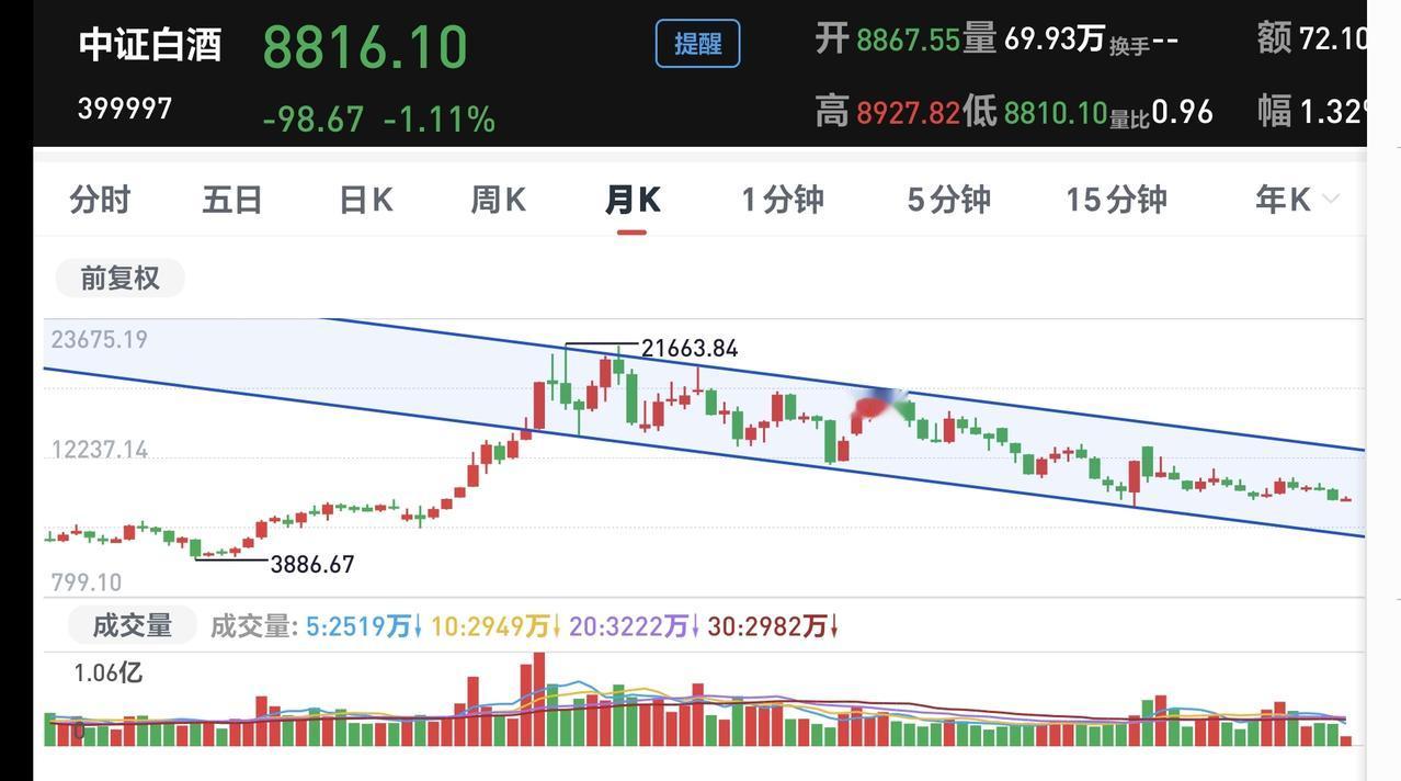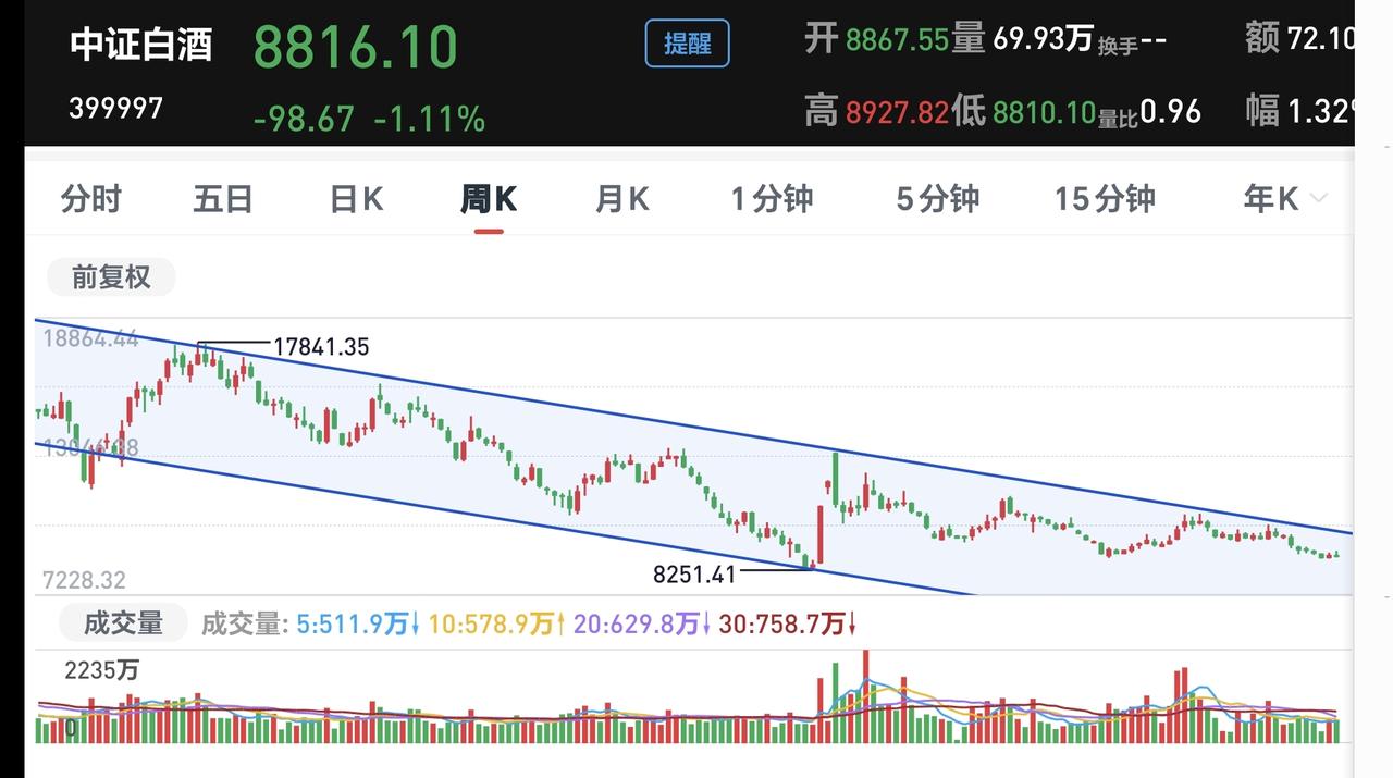 基金:这个板块继续下跌,我是不同意的 市场现在处于牛市当中,这是毋庸置疑的,牛市当中的每一次下跌,都是进场的机会,牛市当中也会有深幅度的调整,牛市并只是只涨不跌,牛市里面并不是每个人都挣钱,牛市里面并不是每个板块都上涨,比如说白酒板块,我们就有许多人在白酒板块里面躲牛市,不信你看下面的截图1,今年以来盈利基民97%,亏损基民3%,这个3%部分的人,就是在牛市里面躲牛市,大概率就是在白酒消费板块里面躲牛市。 白酒板块今天继续下跌,今天这个下跌是不应该的,别人是涨多了跌下,你这个板块并没有上涨,你现在来凑什么下跌热闹,你哪里来的下跌勇气,哪里有的下跌底气,对于这个板块的下跌,我是坚决不同意。 白酒板块现在盘中估值下跌了0.62%,这个板块今天加仓排行榜见下面的截图4,持有人数排行榜见下面的截图5,排名第一的都是招商中证白酒,这也是我持有的白酒板块基金,现在盘中估值下跌了1.05%。 我们来看一下下面的截图6,这是白酒板块日K线图,从图中可以看出,我画了两条倾斜向下的斜线,这是白酒板块日线级别短期下跌通道,前段时间上涨突破了这个下跌通道的上轨,现在是在回踩确认之中,这个板块已经不允许继续下跌了,如果继续下跌又会回到这个下跌通道内,也就会延续前段时间的下跌趋势,也就是,前段时间下跌趋势的改变是假的。 我们看下面的截图7和8,这是白酒板块周K线图和月K线图,从图中可以看出,我都是画了两条倾斜向下的斜线,这是白酒板块周线级别和月线级别的下跌通道,现在白酒板块周线级别和月线级别都处于下跌趋势中,也就是说,这个板块大方向是向下的,大方向向下的趋势并没有能够被改变。 有板块基金,我持有74382元,持有亏损8601元,持有亏损率10.42%,累计收益1733元,如果继续下跌3%,我的累计收益也就会变负,这只基金也就会从盈利变为亏损。 牛市里面板块的上涨也会是轮动的,大部分都是以科技类板块作为上涨的第一梯队,医药和消费类板块的上涨会有滞后,但我们需要知道的是,肯定会轮到他们上涨,只不过是他们的上涨时间会迟一些,他们的上涨幅度会少一些,但我们为了均衡配置的需要,这方面的基金也是要适当配置的,但你只持有这一类医药消费类板块,那就是你的不对了,这也是没有能够做到均衡配置。 我们再来看一下现在的盘面情况,市场上涨1700多家,下跌3500多家,下跌家数超过了上涨家数,涨停家数,43家,跌停家数,65家,跌停家数超过了涨停家数,两市累计成交19850亿,相比于昨天缩量了22%,已经超过了20%的缩量幅度,昨天下午的成交量是巨大的,后面的数量幅度很有可能会进一步放大。 我们来看一下下面的截图11,这是主力资金进出板块的情况,主力资金净流入最多的三个板块是:电池板块,有色金属板块,大宗商品板块,主力资金净流出最多的三个板块是:人工智能板块,国企板块,机器人板块。 持有的基金中,估值上涨幅度最大的三个板块是:兴全合宜,新能源汽车板块,大消费板块,下跌幅度最大的三个板块是:可控核聚变板块,证券板块,军工板块,估值整体亏损了5723元。 市场前段时间疯狂上涨,很多人没有持有热门板块,现在在进行调整,我们不能发生这样的情况,上涨阶段没有持有热门板块,在调整刚开始的时候,把冷门板块转换成热门板块,也就是说,上涨阶段你持有的是冷门板块,下跌阶段你持有的是热门板块,这样你就会两头挨打。上涨阶段没有持有热门板块,可以接受,下跌阶段只持有冷门板块,可以接受,最不能接受的就是,上涨阶段持有的是冷门板块,到了下跌阶段被你转换成了热门板块。 我每天都会分享我的观点,我的观点只代表我个人的看法,不能作为你操作的依据,据此操作后果自负。