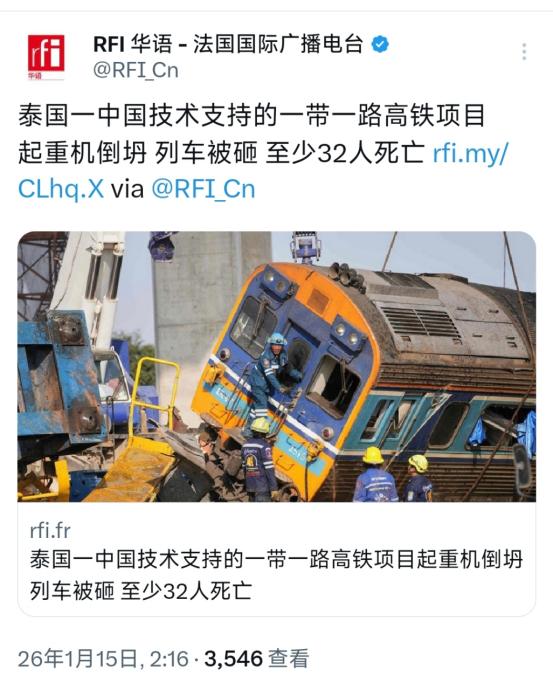 法国国际广播电台1月15日报道:“泰国一中国技术支持的一带一路高铁项目起重机倒坍,列车被砸,至少32人死亡。” 这次出事的是泰国呵叻府的一个在建高铁项目,事故发生在1月14日上午,具体位置是项目的3-4标段,这段铁路全长37.45公里,当时项目进度都已经到99.45%,眼看着就要完工了。 事故的具体情况是,一台正在施工的起重机突然坠落,正好砸中了一列正在运行的特快客运列车,导致列车第二节车厢被严重砸坏还起了火,相邻的车厢也脱轨了,掉落的建筑构件和金属碎片又进一步加重了损毁,最终造成了32人死亡、六十多人受伤的惨剧,这样的伤亡情况确实让人痛心。 但关键问题来了,这起事故跟中国施工半毛钱关系都没有。涉事的3-4标段,主承包商是意大利-泰国发展公共有限公司,说白了就是意泰联合企业在负责承建,整个标段的土建工程都是泰方自己投资、自己组织施工的,业主和监管方也都是泰国国家铁路局。 中国驻泰国大使馆在事故当天就已经核实并发布消息,明确表示事发路段没有任何中方施工企业和施工人员参与,之后中国外交部发言人也在例行记者会上确认了这一点,说目前了解到的情况是涉事标段由泰方企业施工,事故原因还在调查中。 再说说中方在这个高铁项目里的真实角色,确实是提供核心技术支持,但这和施工是两码事。 这个项目属于中泰铁路合作的一部分,中方的参与主要是在铁路的技术标准制定、核心技术输出、相关设备供应以及人员培训这些方面,目的是帮泰国建起来符合国际标准的高铁,提升当地的交通基础设施水平。 而且中方的技术支持有明确的范围,都是和泰方约定好的核心技术层面的合作,根本不涉及具体的施工环节,更不可能参与到意泰联合企业承建的这个涉事标段的施工中。 法国国际广播电台故意把“中国技术支持”和“施工事故”混为一谈,强行把中国和事故绑定,就是想误导读者,让大家误以为事故和中国有关,这种偷换概念、甩锅中国的操作,完全违背了新闻报道的客观公正原则。 事故发生后,泰国方面的处理也能从侧面印证中方和事故无关。泰国看守政府总理阿努廷当天下午就赶到了事故现场,查看救援进展并慰问伤者家属,还明确表态“相关人员应受到惩罚并被追究责任”,直言这样的事故只能是因为疏忽、跳过步骤、偏离设计或使用错误材料才会发生。 涉事的意泰发展公司也很快发布声明,表达了深切哀悼,明确表示会承担责任,全面展开赔偿和善后工作。 泰国相关部门也已经启动了全面核查,要对施工安全管理、现场操作流程和相关责任进行彻查,这些处理都是针对施工方和监管方的,从头到尾都没涉及中方,这更能说明中方在这起事故里没有任何责任。 其实稍微了解一下法国国际广播电台的过往就知道,它搞这种带有偏见的反华报道不是第一次了。之前在涉疆等问题上,这家媒体就曾故意炮制虚假信息,恶意抹黑中国政府的政策。 这次之所以会把泰国高铁事故强行和中国挂钩,本质上就是带着“反华滤镜”在做新闻,不管事实是什么,只要能找到机会给中国贴负面标签、甩锅中国,就不惜违背事实、偷换概念。 他们根本不在乎新闻的真实性,也不在乎这样的不实报道会误导国际社会对中泰合作的认知,更不在乎会伤害事故遇难者家属的感情,眼里只有自己的偏见和抹黑中国的目的。 要知道,中泰铁路合作是一带一路框架下的重要项目,初衷是推动中泰两国的互联互通,促进区域经济发展,给两国人民带来实实在在的好处。 中方一直高度重视项目的安全问题,在提供技术支持的过程中也始终坚守专业标准。这次的事故是一场让人痛心的安全惨剧,值得关注的是事故的原因调查、责任追究以及如何避免类似事故再次发生,而不是被别有用心的媒体利用,搞毫无根据的甩锅和抹黑。 国际社会需要的是客观公正的新闻报道,而不是被偏见主导的闹剧。像法国国际广播电台这样的做法,不仅损害了自身的媒体信誉,也破坏了国际间的互信,对国际合作有害无益。 希望更多人能看清这类不实报道的本质,尊重事实真相,而不是被虚假信息带偏。毕竟,不管是国与国之间的合作,还是媒体的报道,只有基于事实,才能真正发挥积极的作用。