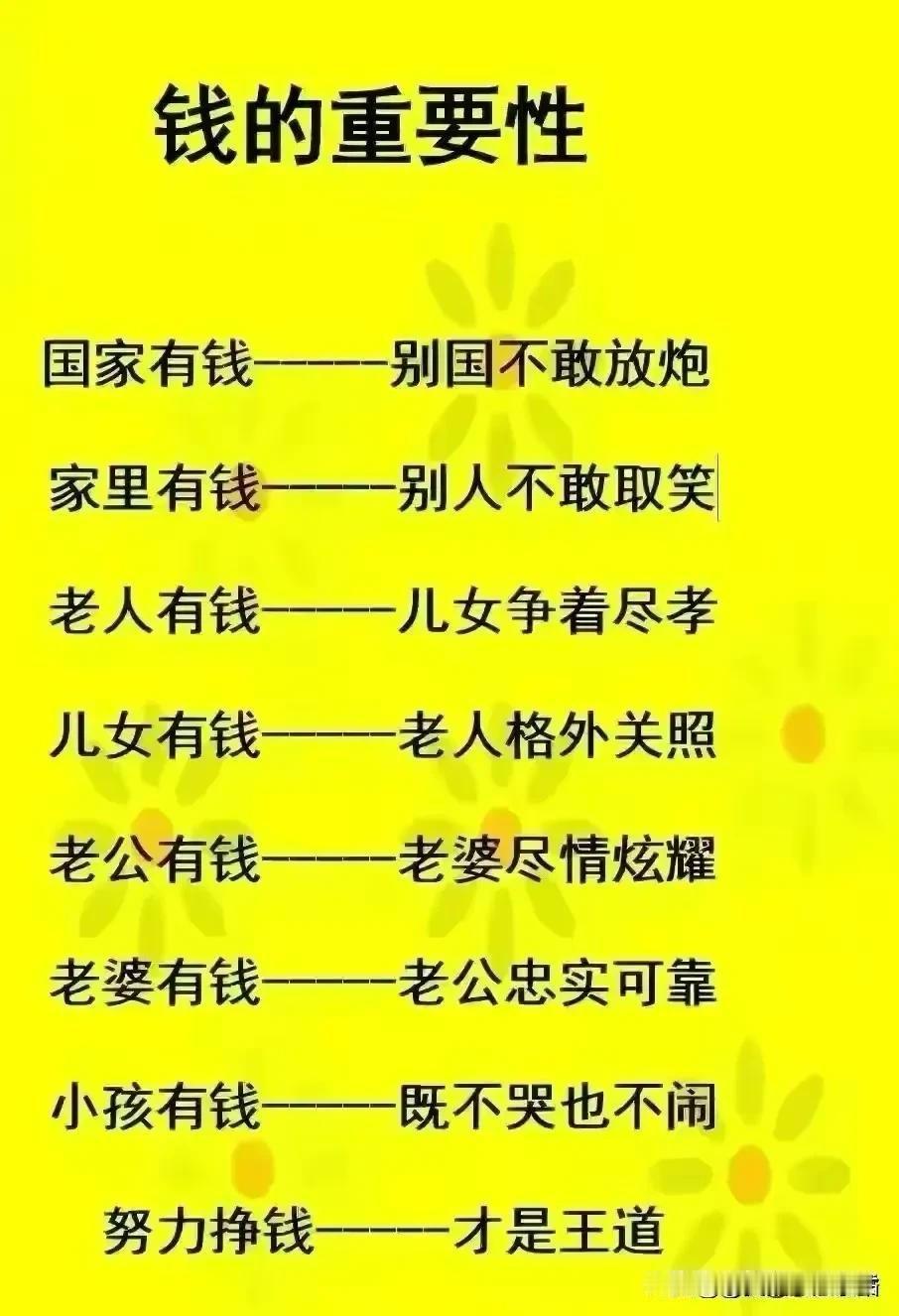 钱不是万能,但没有钱真的是万万不能!别再瞎扯淡,赶紧“好好赚钱”吧! 嘿,兄弟姐妹们!你是不是也常常觉得,人生就像一场没有彩排的戏?台前台后、高潮低谷,全靠自己一手操控。可是说到底,没有钱,连“演技”都成了笑话。钱,就像那隐藏在暗处的“硬核配角”,没有它,戏再精彩也难以登场。别再幻想“钱不重要”,因为现实告诉你,没有钱,啥都不是——这句话,比“我爱你”还要扎心。 一、钱不是万能,但没有钱真的是万万不能! 别以为钱就是一堆纸币、硬币,实际上,它代表的是你的人生底气、自由和尊严。试想一下,钱包空空如也,连个充电宝都舍不得买,连个好点的早餐都吃不起,心情能好到哪去?你是不是也遇到过那种“钱包鼓鼓,心情也跟着亮堂”的感觉?没错,钱就像是人生的“燃料”,缺了它,你就像一辆“空油箱”的车子,跑不远。说白了,没有钱,连“我想买个豪车”都变成“我连个电动车都买不起”的现实。你可能会说:“钱买不到幸福。”但我告诉你,没有钱,幸福都变成了奢望。生活中的小确幸,比如一顿热腾腾的早餐、一次说走就走的旅行,都是钱的“好朋友”。没有钱,梦想就像泡沫,一戳就破。钱不是万能,但没有钱,万事难成。 二、摆正自己的位置,别再幻想“躺赢” 很多人梦想着一夜暴富,觉得“只要努力就行”,但现实告诉你,努力是基础,位置才是王道。你得明白自己在这个社会的“位置”——是打工仔、创业者、还是“躺平族”?认清自己,才能有的放矢。有人说:“只要我努力,成功自然会找上门。”但你有没有想过,努力是前提,但“位置”才是关键。就像打游戏,角色等级再高,没有合适的装备,也难以闯关成功。你是每天拼命加班的普通职员,还是靠点子创业的小老板,亦或是“躺平”躺得心安理得?不同的“位置”,决定了你的“收入”和“生活方式”。别再幻想“我一定会成功”,先把“钱”这个基础搞定,否则再努力,也可能只是“白忙活”。认清自己,找到适合自己的“位置”,才能稳扎稳打,稳步向前。 三、管好自己的脾气,别让情绪成为“破财”祸水 你以为发脾气、闹情绪能解决问题?错!这只会让你变成“破财鬼”。在职场、生活中,控制情绪,理性分析,才能少吃亏、多赚钱。有人说:“脾气不好,钱就跑了。”没错,想想那些一怒之下辞职、失言惹事的朋友,钱都跑得比你快。你有没有遇到过那种“愤怒时一掷千金”的情况?情绪失控,结果不仅伤了自己,还惹得身边人反感,最后钱财也跟着“跑掉”。所以,学会“收敛脾气”,把怒火转化为动力,把情绪变成理智的资本。职场上,冷静应对各种“突发事件”,才是“赚钱”的必备技能。别让“火山爆发”成为你破财的导火索,稳住心态,理性应对,钱自然会向你靠拢。 四、没有实力,少说话! 话说得多不一定有用,反而可能暴露你的短板。你要知道,实力才是硬通货!无论是学习技能、积累经验,还是提升自己,都得用时间和努力打基础。说白了,别光嘴上说“我很厉害”,实际行动才是王道。你是不是也遇到过那些“嘴炮专家”?说得天花乱坠,但实际一点用都没有。别忘了,社会是个“看实力”的舞台,没有实力,别人只会把你当成“会说话的空壳”。要成为真正的“赚钱高手”,就得不断学习、不断提升自己。比如,掌握一门实用技能,成为行业内的“硬核专家”;或者积累一些“真本事”,让自己在职场中站稳脚跟。记住:没有实力,少说话,静静努力,别让自己成为“嘴炮界的天王”。用实力证明自己,用行动赢得尊重。 五、总结:钱、位置、脾气、实力,缺一不可! 如果你还在为“怎么快速赚钱”焦头烂额,那就先从“认清自己、摆正位置、管好脾气、提升实力”开始。钱不是万能,但没有钱,什么都难。你要明白,赚钱的路上没有捷径,只有脚踏实地、不断努力。别幻想“天上掉馅饼”,也别指望“走后门”就能发财。成功的关键,是你每天都在“积累”。就像打游戏一样,等级越高,装备越好,打怪越轻松。你要做的,就是不断提升自己,把“实力”变成“硬通货”。只有这样,才能在激烈的社会竞争中脱颖而出。 六、最后一句话,送给所有想发财的你: “别再幻想天上掉馅饼,自己动手,丰衣足食!”只要你肯努力,钱就会慢慢向你招手。记住,人生没有“免费午餐”,但只要你“好好赚钱”,你就能吃到自己想要的生活大餐!别再迷信“好运”或“天命”,真正的成功,来自于你的行动。把握当下,从点滴做起,逐步实现你的财富梦想。你会发现,原来“努力”两个字,比任何“奇迹”都更靠谱。 记住,努力的人,总会有收获。只要你坚持“好好赚钱”,未来的日子一定会越过越精彩! 钱不是万能 钱的重要性