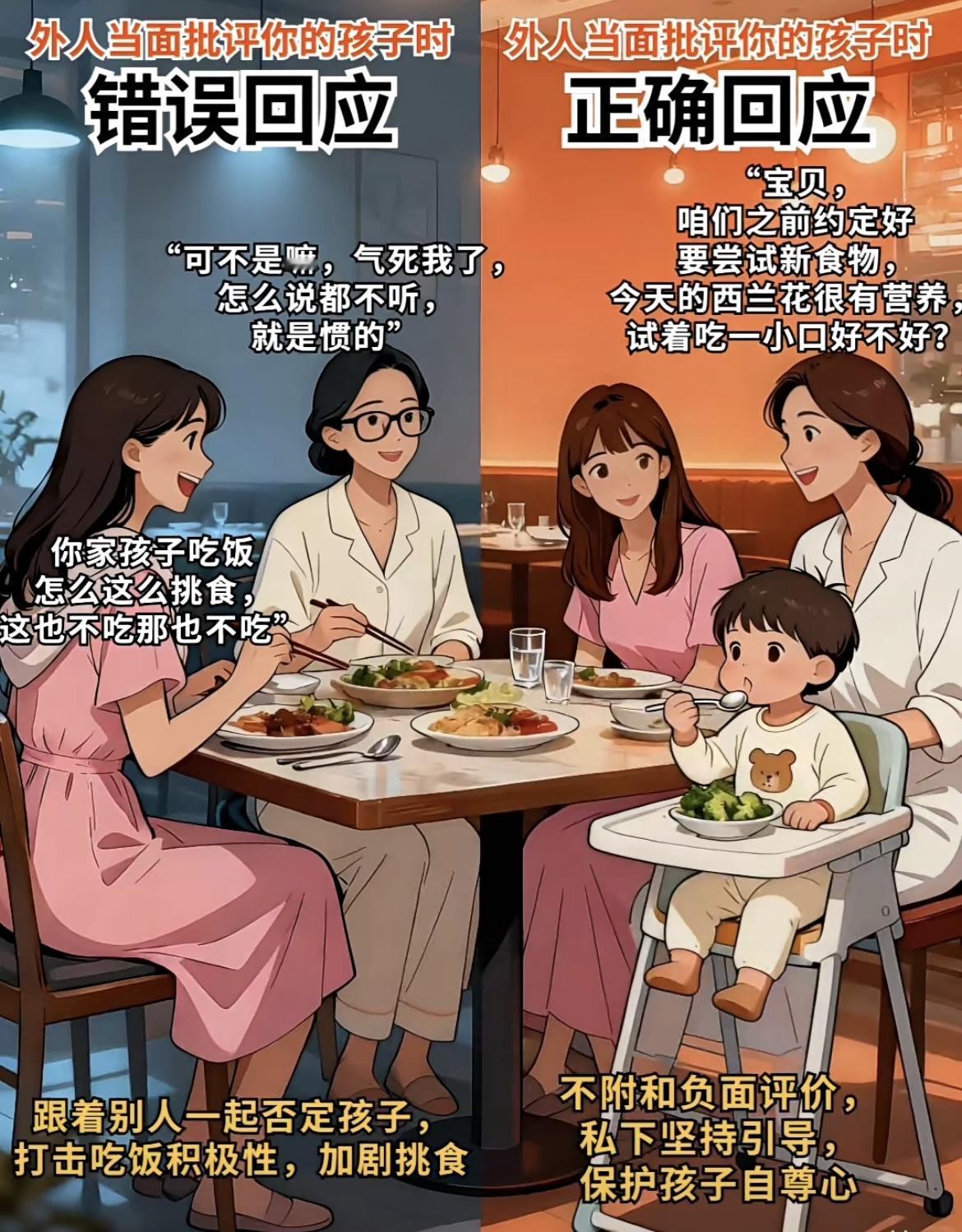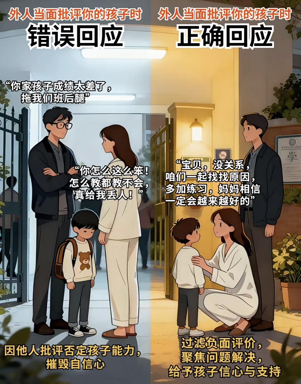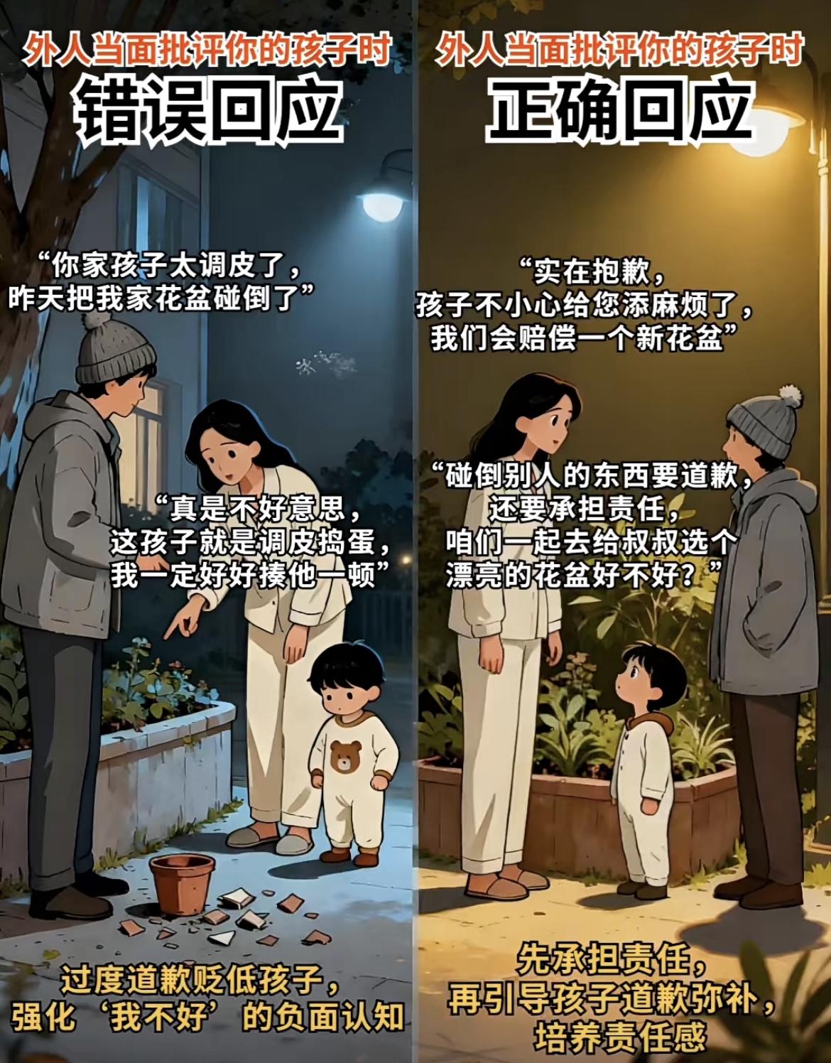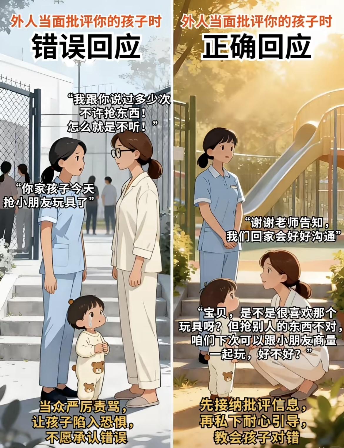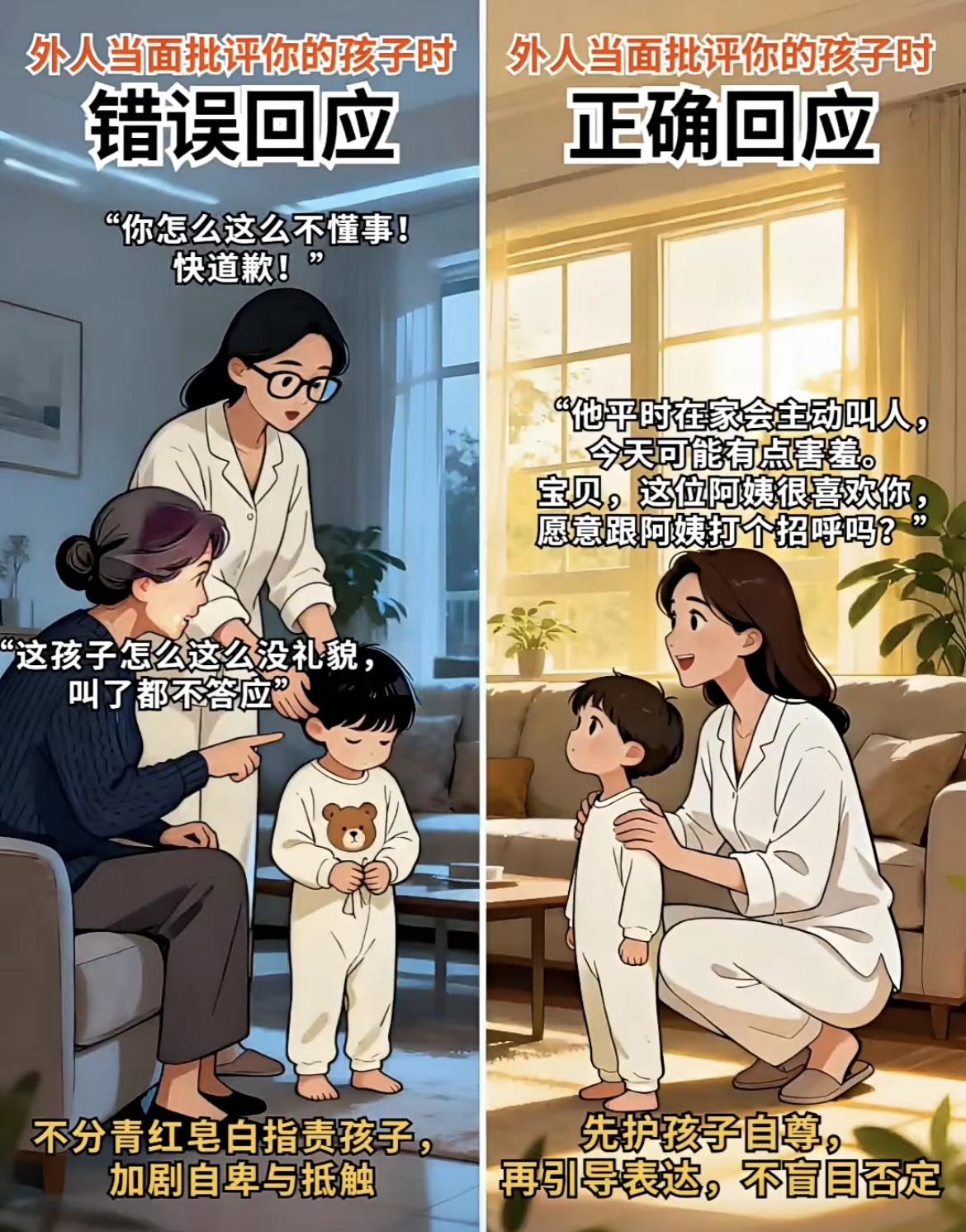 1. 遇孩子被说没礼貌:先替孩子解释处境,再温柔引导表达,不逼孩子当场道歉 2. 遇孩子被指抢玩具:先感谢对方告知,再私下跟孩子讲对错,不当众责骂 3. 遇孩子被说闯了祸:先主动承担责任,再带孩子弥补过错,不贬低孩子人格 4. 遇孩子被说挑食时:不附和负面评价,私下坚持耐心引导,保护孩子自尊心 5. 遇孩子被说成绩差:过滤负面标签,和孩子一起找原因,给足信心与支持