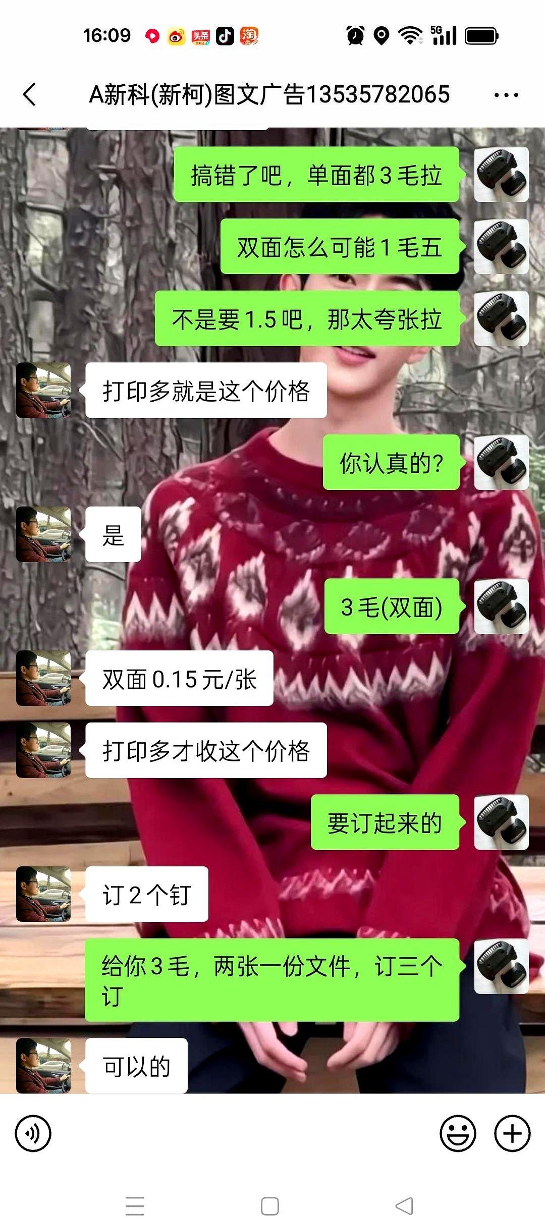我跟打印店老板说,双面打印,你给我算3毛一张! 老板一脸蒙圈地看着我,说,姐,就