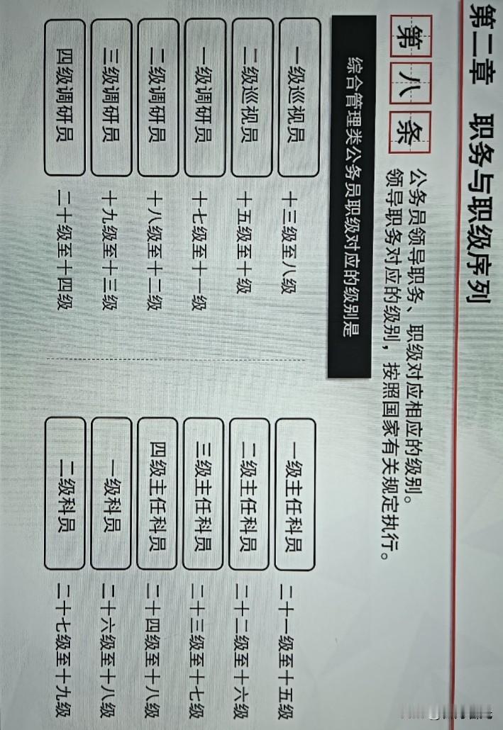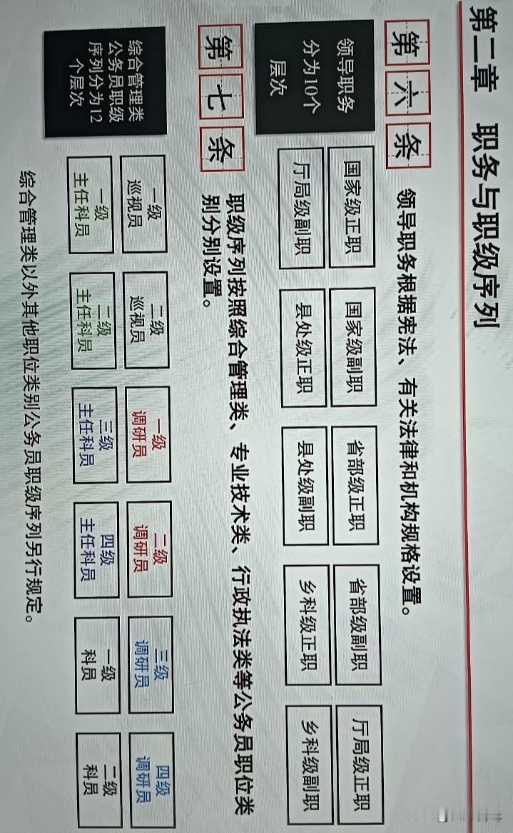 什么是“二主”?什么是“一调”?什么是“职务”“职级”?公务员职务与职级并行制度是一项旨在拓宽职业发展通道、健全激励保障机制的重大改革。 核心是区分“领导职责”与“级别待遇”,为公务员提供两条并行的晋升路径。 双轨晋升体系 1. 职务 (Leadership Position) 指公务员在机关中担任的具有决策、指挥和管理等领导职责的职位。职务层次分为国家级正职至乡科级副职共10个级别。 2. 职级 (Rank/Grade) 是公务员的等级序列,是与领导职务并行的晋升通道。职级体现公务员的政治素质、业务能力、资历贡献,是确定工资、住房、医疗等待遇的重要依据,但不具有领导职责。 职级序列与对应关系 职级序列根据职位类别分别设置,以综合管理类为例,其职级序列及对应的级别范围如下: 职级名称 对应级别范围 一级巡视员 13级至8级 二级巡视员 15级至10级 一级调研员 17级至11级 二级调研员 18级至12级 三级调研员 19级至13级 四级调研员 20级至14级 一级主任科员 21级至15级 二级主任科员 22级至16级 三级主任科员 23级至17级 四级主任科员 24级至18级 一级科员 26级至18级 二级科员 27级至19级 领导职务对应的最低职级 制度设计确保了领导职务与职级之间的对应关系,为非领导职务人员提供了明确的晋升目标。 厅局级正职: 对应一级巡视员 厅局级副职: 对应二级巡视员 县处级正职: 对应二级调研员 县处级副职: 对应四级调研员 乡科级正职: 对应二级主任科员 乡科级副职: 对应四级主任科员 晋升职级有明确的最低任职年限要求,且年度考核结果会影响晋升速度。 晋升职级 最低任职年限: 一级巡视员 任厅局级副职或二级巡视员4年以上 一级调研员 任县处级正职或二级调研员3年以上 一级主任科员 任乡科级正职或二级主任科员2年以上 一级科员 任二级科员2年以上 考核影响: 在晋升职级所要求的任职年限内,每有1个年度考核结果为“优秀”等次的,任职年限可缩短半年;每有1个年度考核结果为“基本称职”或不定等次的,该年度不计入任职年限。 1. 职级与待遇挂钩 公务员根据所任职级执行相应的工资标准,并享受所在地区(部门)相应职务层次的住房、医疗、交通补贴等待遇。担任领导职务且兼任职级的公务员,按照“就高原则”享受待遇。 2. 职级不改变工作职位和领导指挥关系 晋升职级不改变公务员的工作职位和领导指挥关系,也不享受相应职务层次的政治待遇和工作待遇。 3. 职级能上能下 公务员职级实行能上能下机制。在特定情况下,如不能胜任职位、年度考核不称职、受到处分等,应当按规定降低职级。 职务与职级并行制度的核心目标在于激励基层公务员干事创业、担当作为。它通过建立与领导职务并行的晋升通道,让更多公务员能够在本职岗位上获得职业成就感和待遇提升,从而稳定基层队伍,激发工作热情。 "职务与职级并行,是打通职业发展“天花板”的关键一步。"