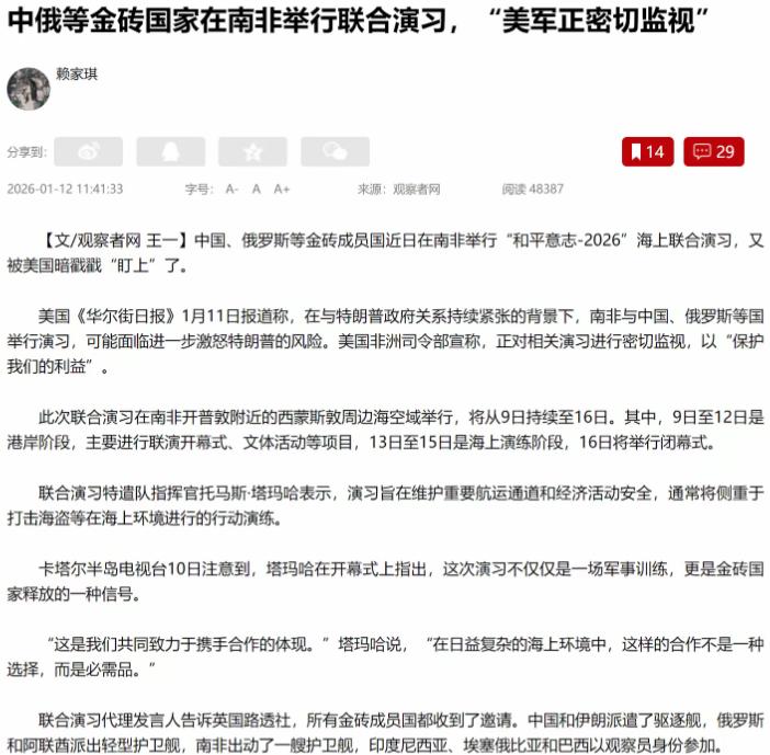 印度开始唱反调!金砖国家联合军演这么大的事,作为正式成员国的印度竟然全程缺席,连观察员都没派一个。这很难让人不怀疑,印度是不是故意给金砖组织拆台。 正在南非西蒙斯敦附近海域举行的“和平意志-2026”金砖国家海上联合演习,从1月9日开始到1月16日结束,这次演习由我们国家主导发起,邀请了所有金砖成员国参与。   从参演情况来看,中国、俄罗斯、南非、伊朗、阿联酋等金砖成员国都积极派军舰参与,巴西、埃及、埃塞俄比亚等国也派了观察员到场,各国都借着这次演习加强军事协作,提升应对海上安全威胁的能力。   唯独印度,作为金砖组织的正式成员国,在收到邀请后却毫无动静,既没派遣军舰参演,也没派观察员到场,这种无视组织集体活动的态度,在金砖组织的历史上都比较少见,立刻引发了国际社会的广泛讨论。   要知道,金砖国家联合军演的核心目的是维护地区海上安全,促进成员国之间的军事互信,印度作为南亚地区的大国,本应在其中发挥积极作用,可它的缺席让这次演习的地区代表性打了折扣。   其实印度在金砖组织内不配合的情况早就不是第一次了,2025年的时候,金砖国家提出建立反关税阵线,推动成员国之间的贸易便利化,可印度直接拒绝加入,还对外宣称设立贸易和关税壁垒会让全球交易更复杂。   当时印度外长苏杰生在金砖峰会上明确表态,反对这种针对性的贸易协作机制,这番言论直接导致金砖反关税阵线的推进进度放缓,原本计划的多项贸易合作项目也因此搁置。   到了2026年初,金砖组织讨论扩员问题时,印度又跳出来设置障碍,它主张将经济规模、发展水平等作为高门槛,还强调扩员必须遵循“共识决策”,明显是针对巴基斯坦的“入砖”申请。   印度的这些操作,让不少人觉得它在金砖组织内就是个“麻烦制造者”。很多重大项目因为它的反对无法顺利推进,组织内部的协作效率也受到影响。这次缺席联合军演,更像是这种不合作态度的延续。   有人猜测,印度这次缺席可能是想向西方阵营示好,毕竟近年来印度一直在大国之间寻求平衡,既想借助金砖组织提升国际影响力,又不想得罪美国等西方国家,担心参与金砖军演会引发西方的不满。   也有观点认为,印度是在刻意凸显自己的特殊性,作为金砖组织中唯一的南亚国家,印度一直想在组织内掌握更多话语权,一旦达不到目的,就用拒绝参与的方式表达不满,试图逼迫其他成员国让步。   不管原因是什么,印度的缺席都损害了金砖组织的集体利益,金砖组织之所以能不断发展壮大,核心就是成员国之间的相互信任和密切协作,每个成员国都应该为组织的发展贡献力量,而不是搞特殊化。   从地区安全格局来看,南亚地区的海上安全问题日益复杂,海盗活动、海上恐怖主义等威胁层出不穷,印度作为地区大国,本应和金砖其他成员国携手应对,可它的缺席让区域安全协作出现了缺口。   对比印度的态度,其他金砖成员国的表现更显务实,各国通过联合军演加强军事交流,不仅能提升共同应对安全威胁的能力,还能深化彼此之间的战略互信,为后续的多领域合作奠定基础。   印度如果继续这种单打独斗的思路,最终可能会被边缘化,金砖组织的影响力不断提升,越来越多的国家希望加入这个大家庭,作为老成员国,印度如果不珍惜这个平台,迟早会失去在组织内的话语权。   国际合作从来不是单方面的索取,而是相互成就的过程,金砖组织为成员国提供了发展机遇和安全保障,每个成员国都应该拿出诚意参与协作,只有这样,组织才能不断发展壮大,为全球治理贡献更多力量。   希望印度能认清形势,放下狭隘的利益考量,积极参与到金砖组织的各项合作中来,毕竟在全球化时代,单打独斗没有出路,团结合作才是共赢的唯一选择。 大家对此有什么看法呢?欢迎各位在评论区留言!