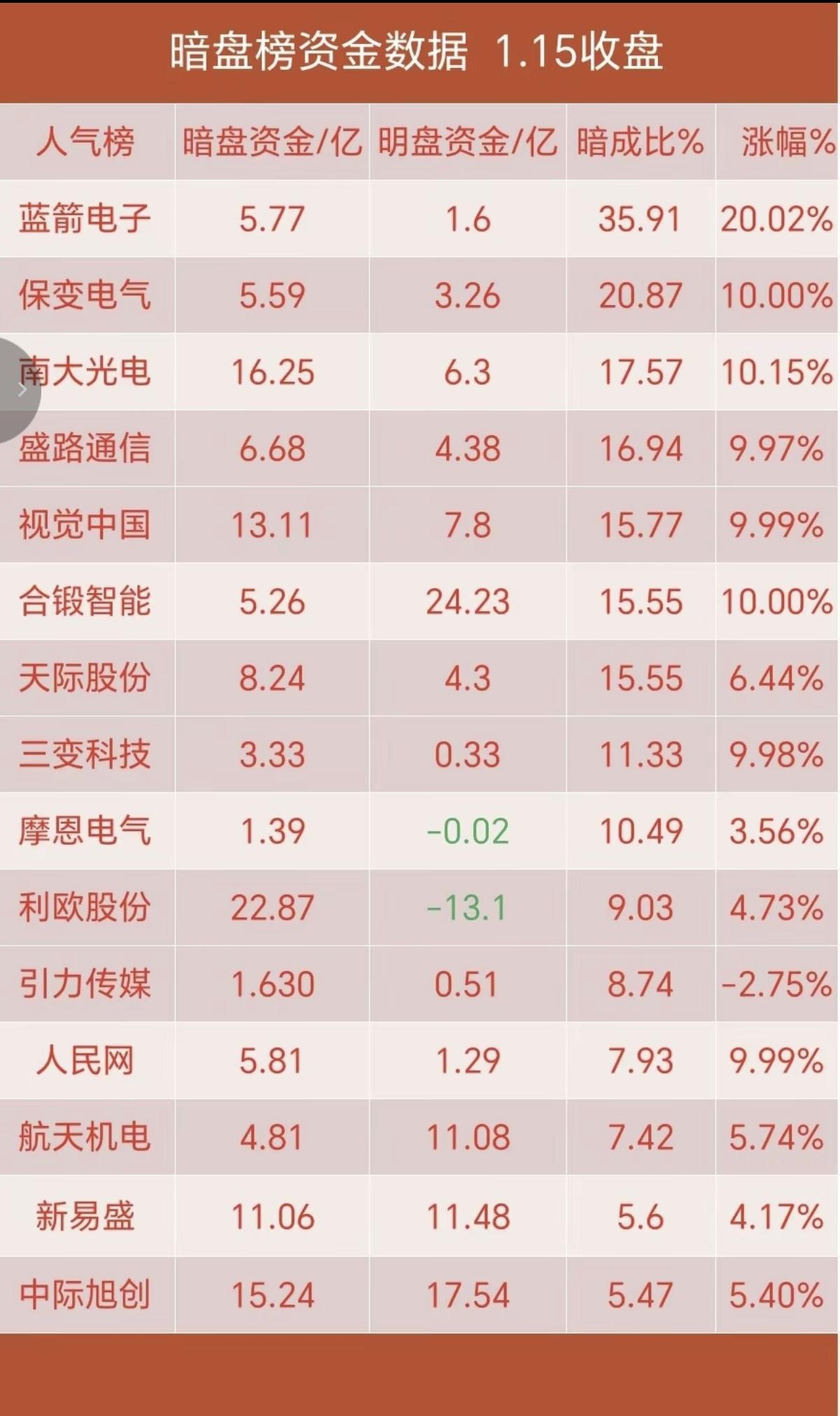 1.15周四 暗盘资金 抢筹出逃个股榜! 资金抢筹: 1.存储芯片,半导体 2.通信设备 3.六氟磷酸锂 4.智能电网 资金出逃:商航,AI应用,互联网服务
