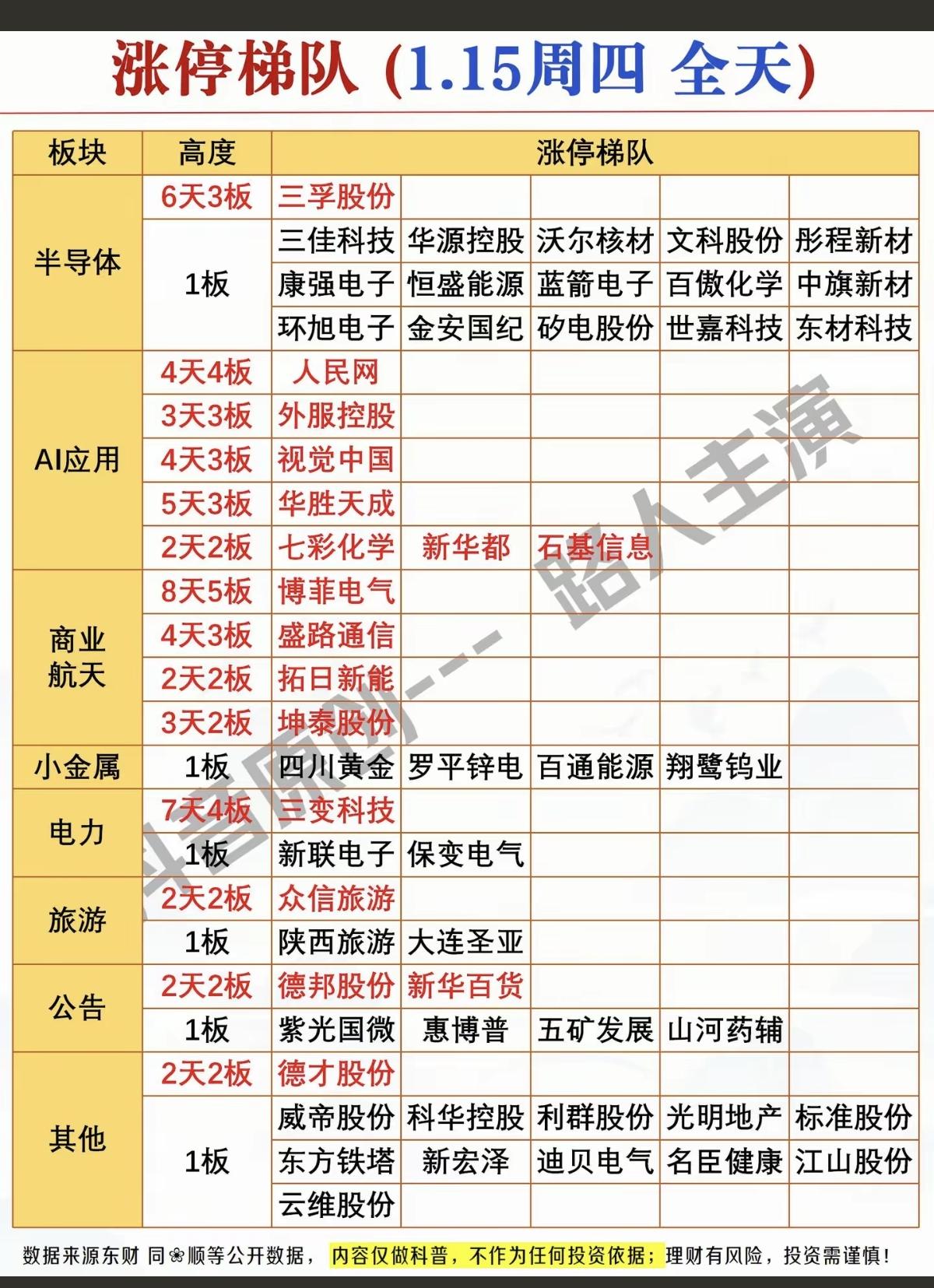 1.15周四 涨停板股票:题材+高度! 半导体芯片 16股涨停 智能AI应用 7股涨停 商业航天 4股涨停 小金属 3股涨停
