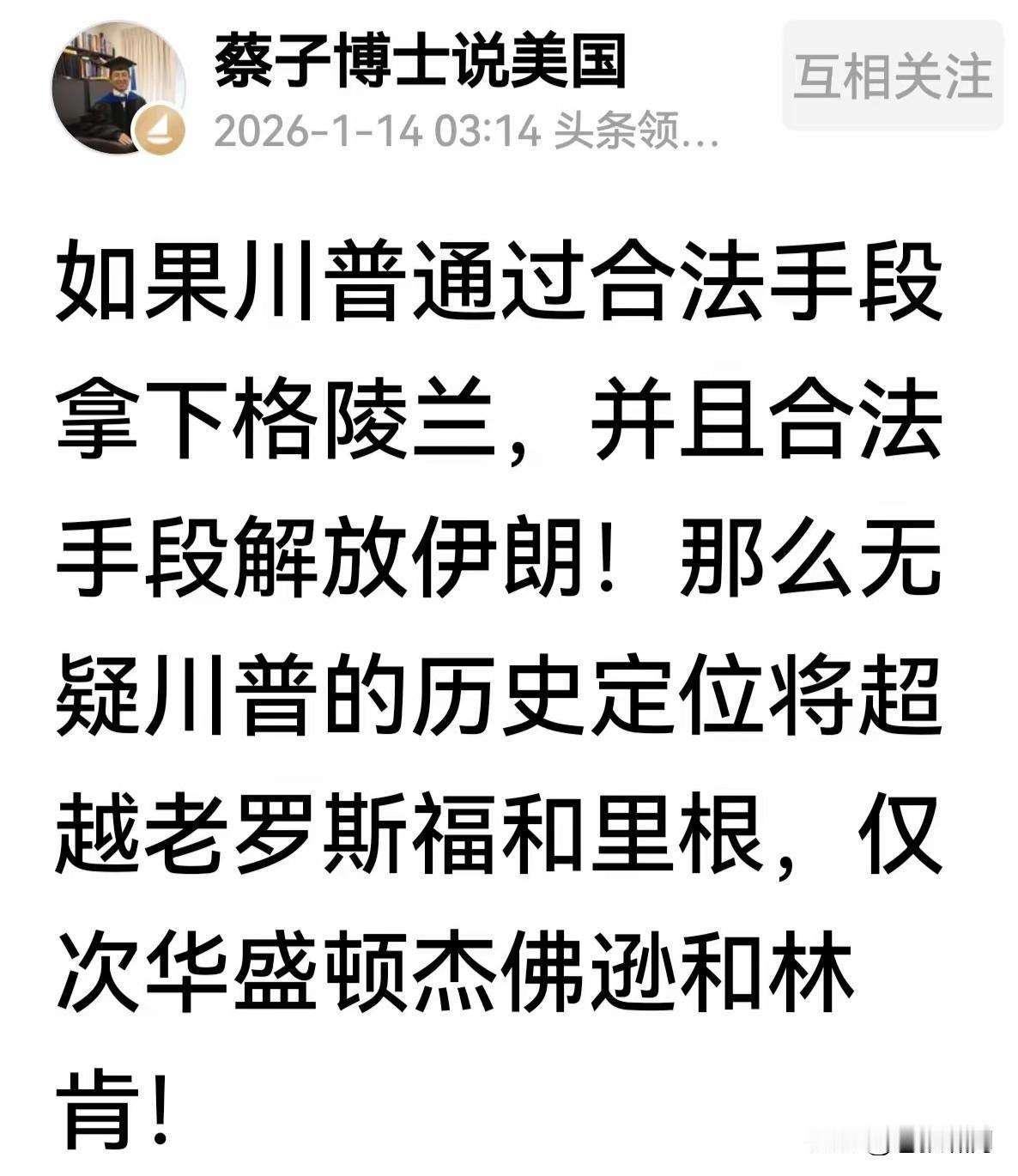 蔡子博士:如果川普以合法手段拿下格陵兰,并以合法手段解放伊朗!那么他在美国的历史定位,将超越罗斯福与里根,成为仅次于华盛顿、杰弗逊和林肯的第四位“伟大总统”! 苍狼对“蔡子博士”说法,基本认同。 1.老特想要格陵兰,对美国确是利好!但“利好”不能强加于别人痛苦之上。 无论“购买”还是“公投”,都要征得管理方丹麦与格陵兰居民同意。违背他们的意愿,或者使用武力,就不“合法”了!不但不能提升反而有损于美国形象。 2.伊朗与格陵兰性质不同,属于另外一个范畴。伊朗是主权国家,别国不应干涉内政。但哈梅神权扶持“哈真胡”三支反政府武装组织,造成多国战乱不止,国家动荡,民不聊生,实属不该。 美国作为全球老大,世界警察与文明民主自由“灯塔”,协助中东“文明卫士”以色列,以及欧洲与伊斯兰多数国家明暗支持,用“合法手段”让伊朗过渡到民主法治,将是中东之幸,世界之幸! 当然还有一个更艰巨任务,就是以“合法手段”,按照联合国宪章与国际法,公平公正地平息俄乌战争,实现两国停战和平,就将更加“伟大”了!目前美国与所有主持正义国家正在努力,期望及早实现这一目标,将是人类之福! …………